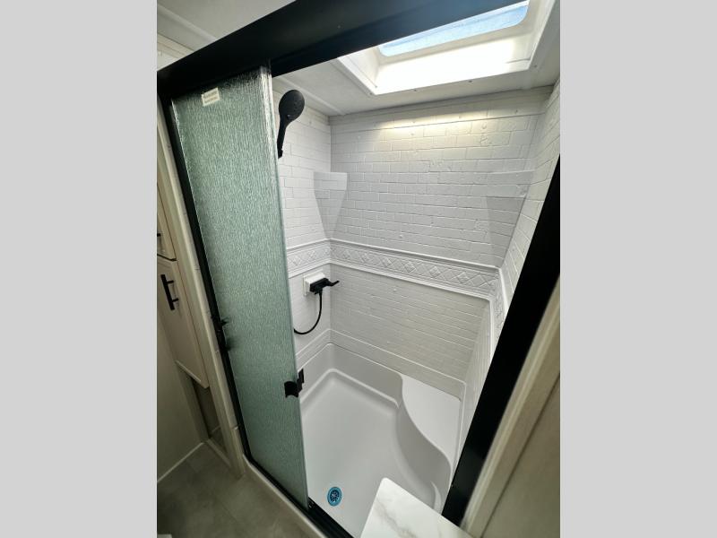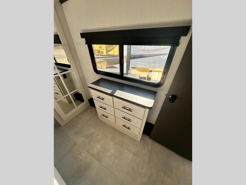 With any Crusader fifth wheel by Prime Time, you will enjoy outstanding quality and premium features! The Dexter E-Z Flex rubberized suspension equalizer will help make towing smoother than ever, and the high gloss gel coated exterior fiberglass is sure to be eye-catching. There are also thick insulated pass-through storage baggage doors outside, along with a 102" wide body, and hassle-free one-touch auto leveling. Inside, you'll find real wood cabinet doors, carpet-less slide rooms, blackout roller shades, and stain resistant, easy clean furniture. The Crusader fifth wheels are built with Eternabond construction, a one-piece PVC roof membrane, radiant foil insulation, plus rack and pinion slide systems.
