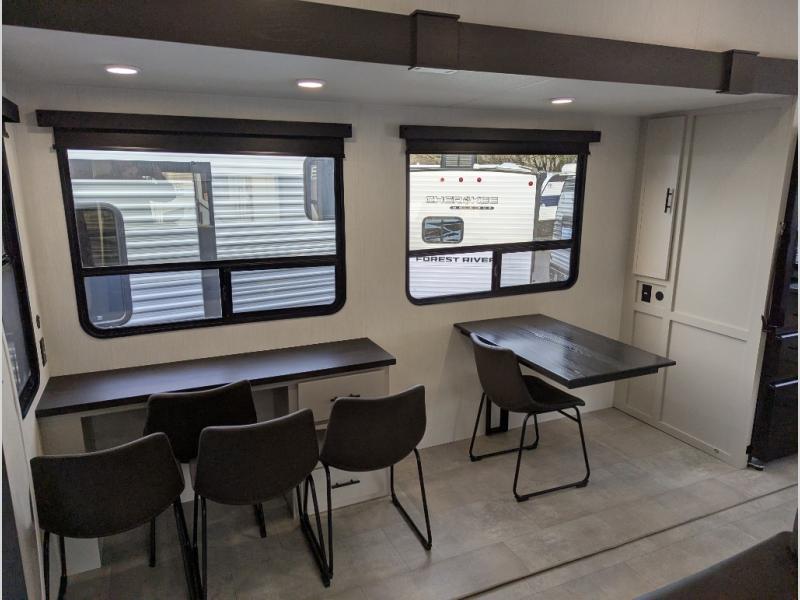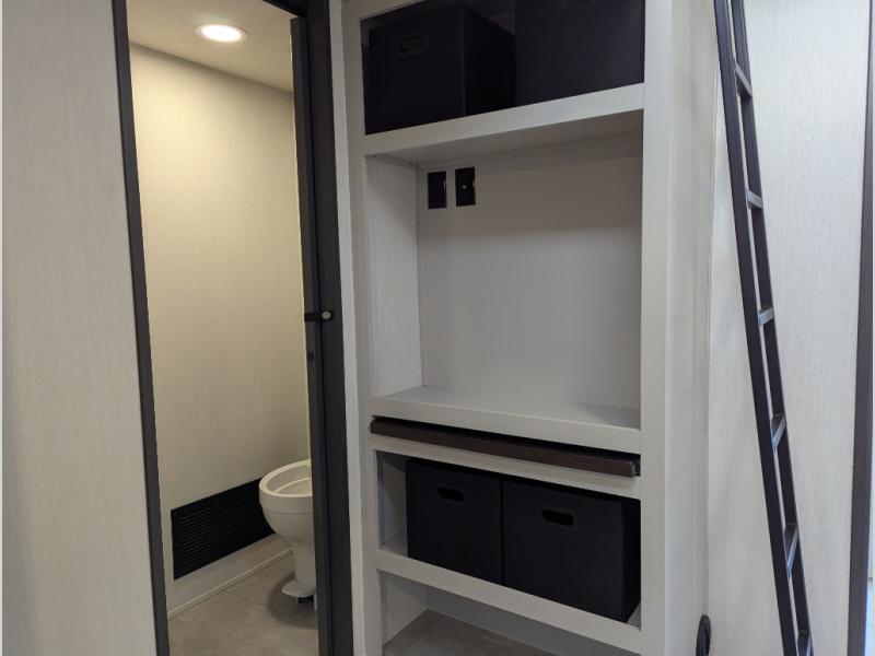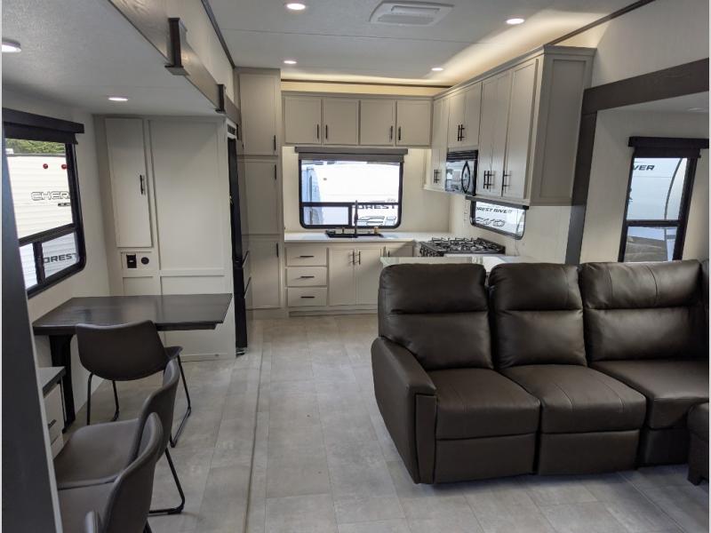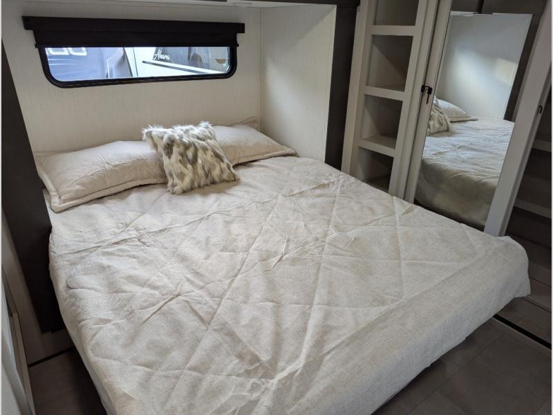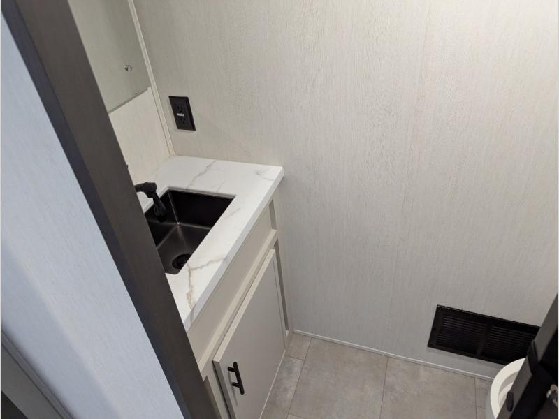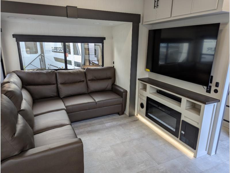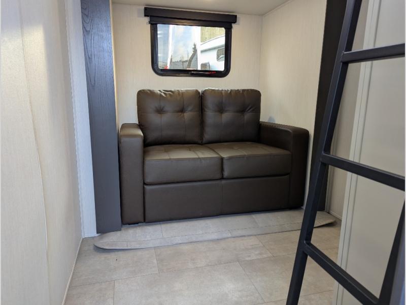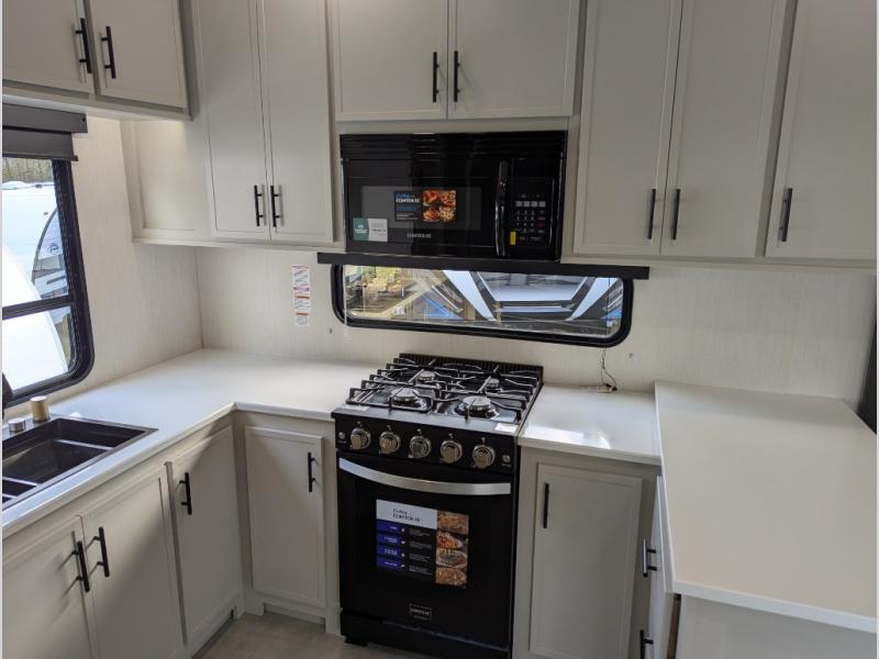 If you enjoy camping with family or friends, this fifth wheel is sure to meet all of your needs! The front bedroom includes a queen bed slide out for more space and comfort, plus a front wardrobe with washer and dryer prep. And the full bath is right next door for easy nighttime use. Your guests can utilize the middle bonus room that includes an E-Z glide sofa slide out, a private loft, and a half bath! The living room is made spacious thanks to the dual opposing slides, and you'll find a sectional sleeper sofa here, as well as desk with a chair and a free-standing table with chairs. And don't overlook the rear kitchen with ample counter space, a four burner range, an accessory sink and a French door 12V refrigerator!