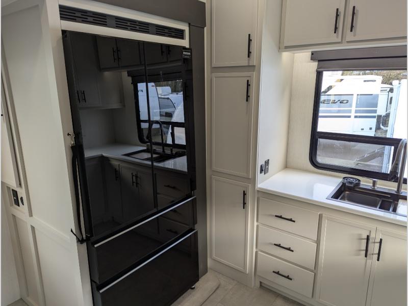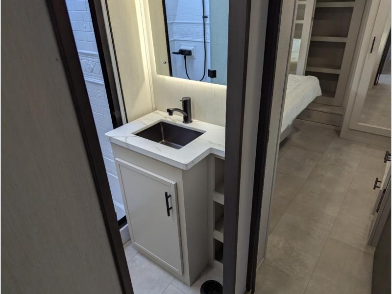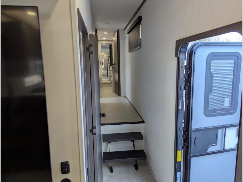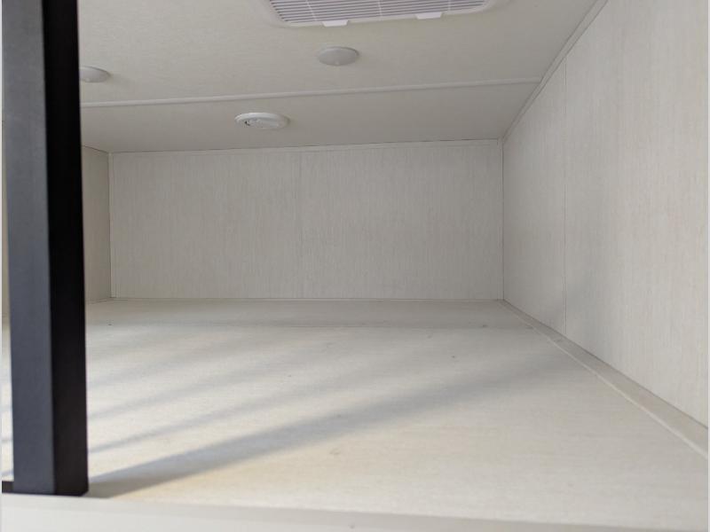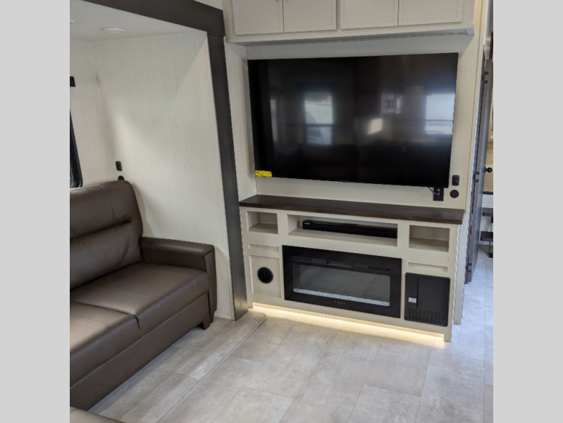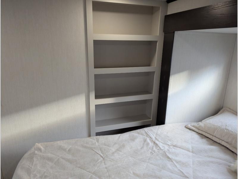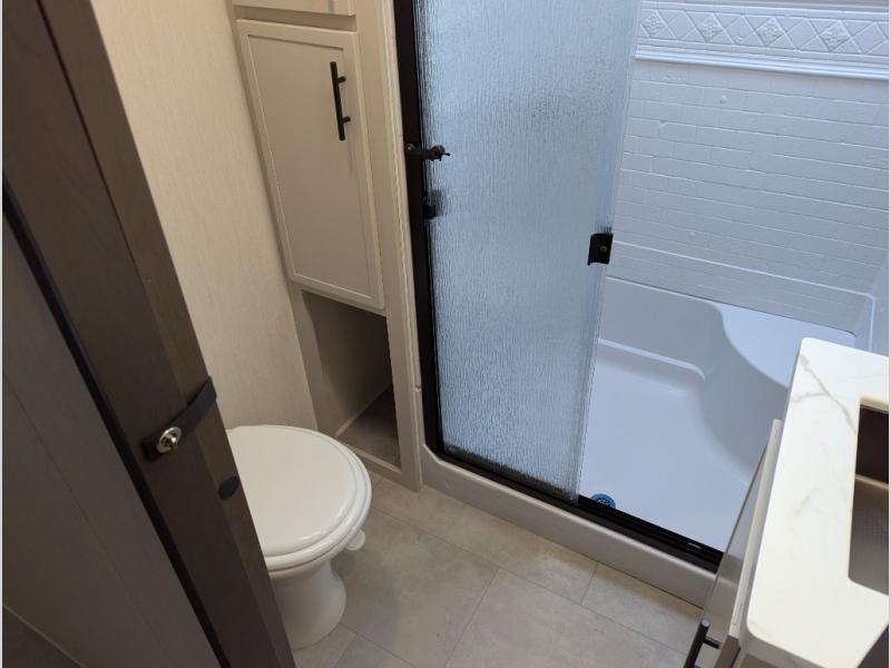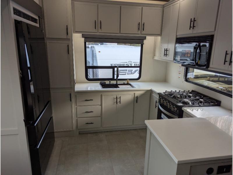 If you enjoy camping with family or friends, this fifth wheel is sure to meet all of your needs! The front bedroom includes a queen bed slide out for more space and comfort, plus a front wardrobe with washer and dryer prep. And the full bath is right next door for easy nighttime use. Your guests can utilize the middle bonus room that includes an E-Z glide sofa slide out, a private loft, and a half bath! The living room is made spacious thanks to the dual opposing slides, and you'll find a sectional sleeper sofa here, as well as desk with a chair and a free-standing table with chairs. And don't overlook the rear kitchen with ample counter space, a four burner range, an accessory sink and a French door 12V refrigerator!