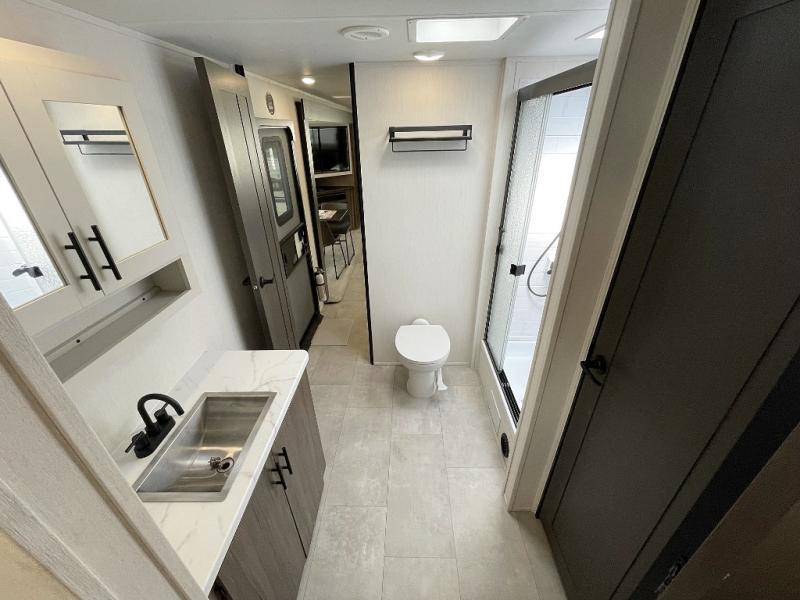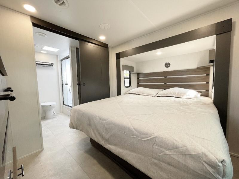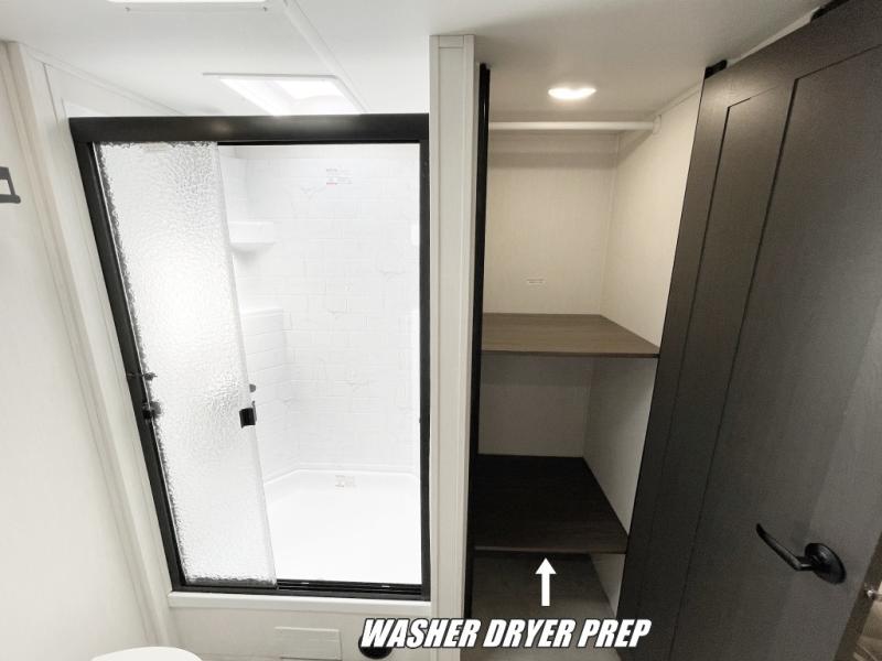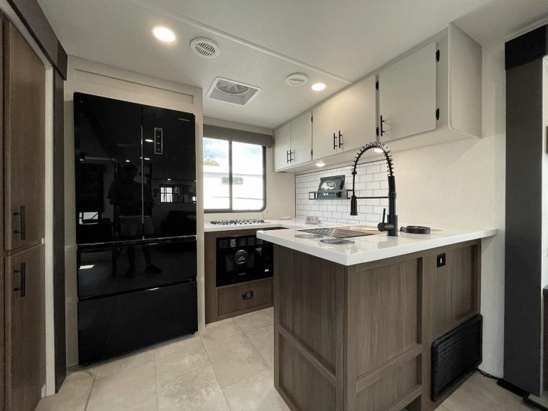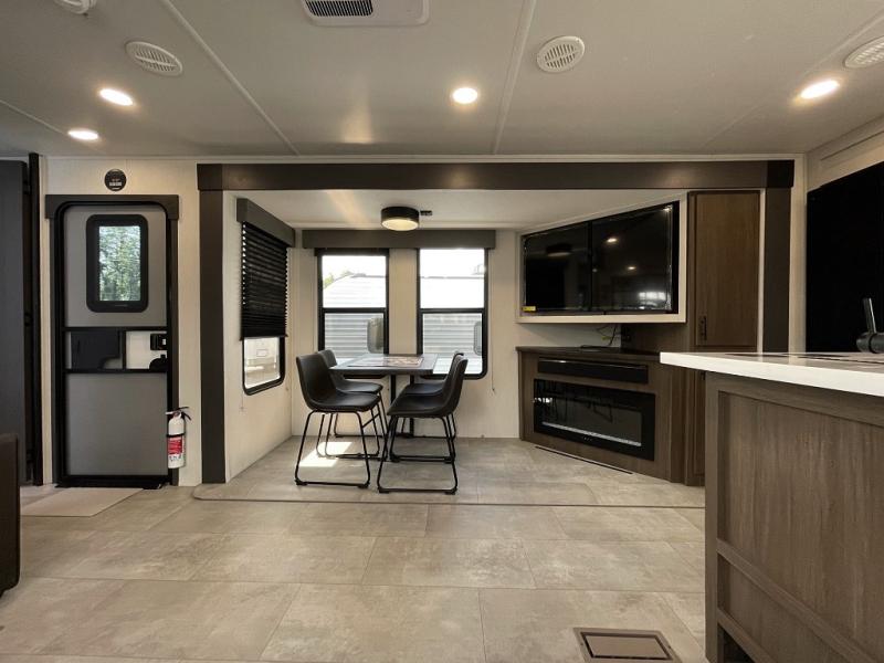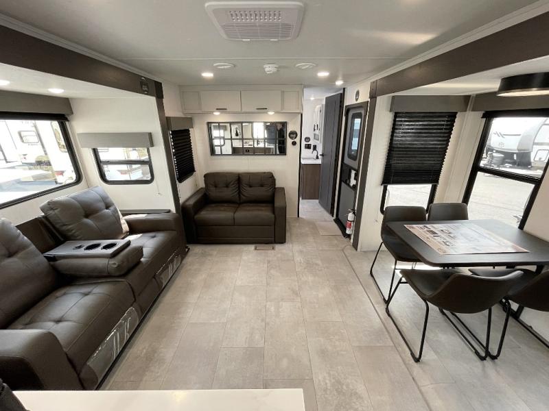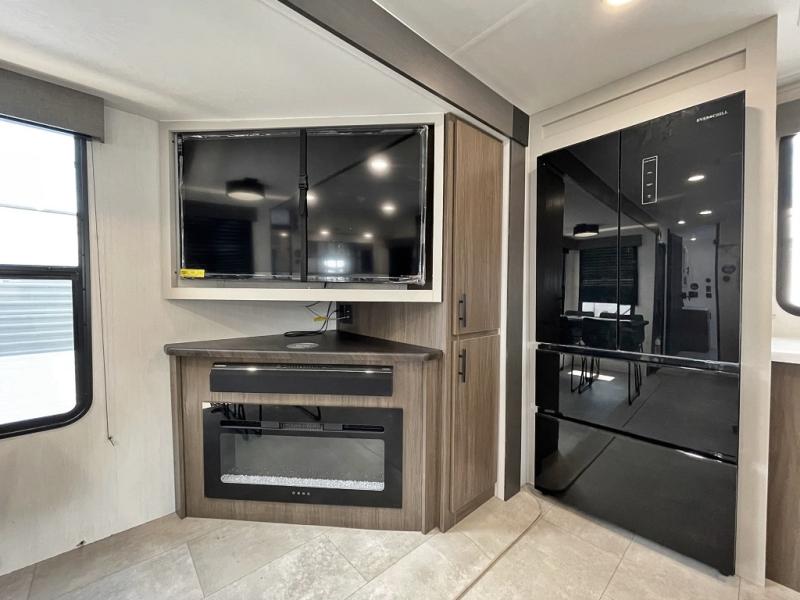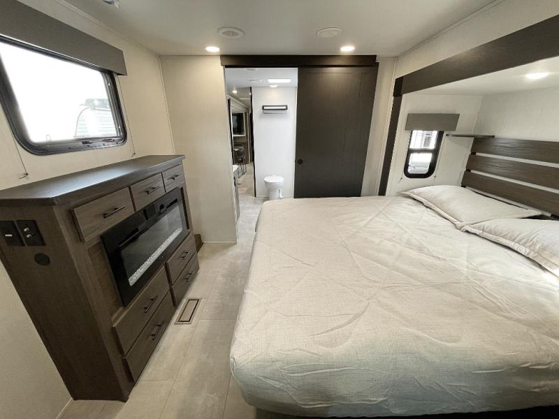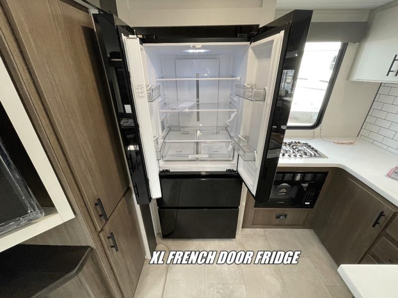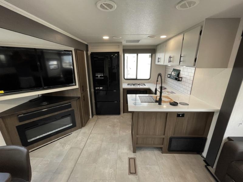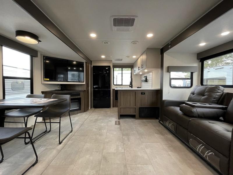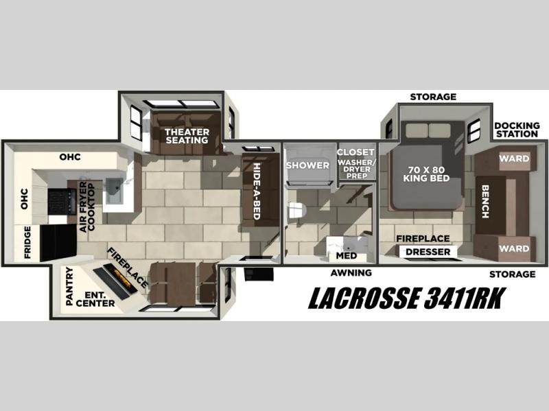 You will be ultra impressed by this LaCrosse travel trailer! First, the interior is made to feel just like your own home with its theater seating, hide-a-bed sofa, free-standing table with chairs, and entertainment center with 50" LED TV and fireplace. Second, you'll find even more residential comfort in the rear kitchen that has a three burner cooktop, a 30" microwave oven, and a 16.2 cubic foot 12V refrigerator. And lastly, the walk-through bathroom has two doors on either side with one of those doors leading directly into the front private bedroom, so you know you'll enjoy great comfort in this space each night. There is also a bedroom bench at the front of this trailer which gives you an enjoyable place to relax as you take in the views from the front windshield.