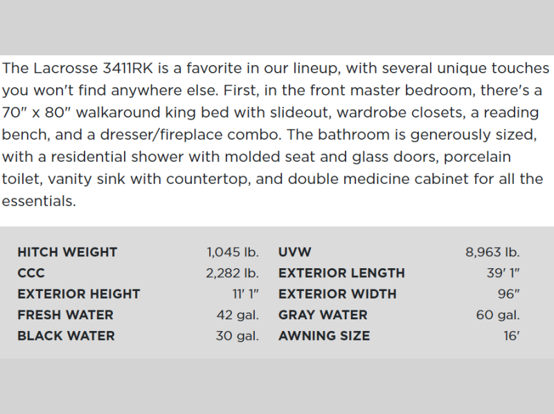 Prime Time LaCrosse travel trailer 3411RK highlights: