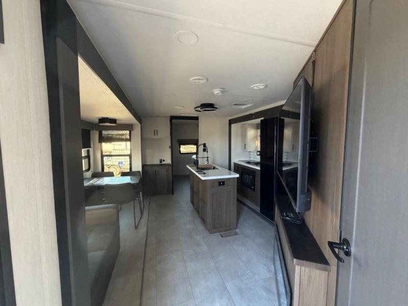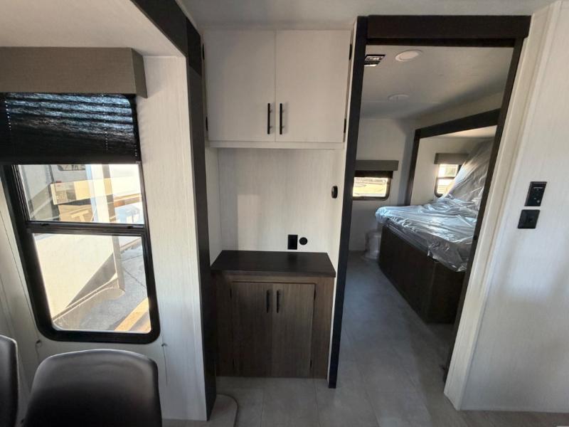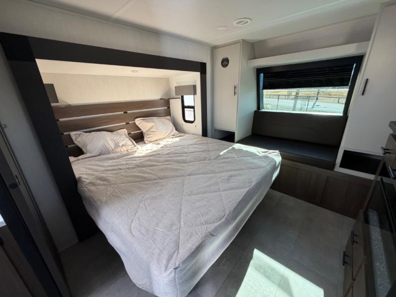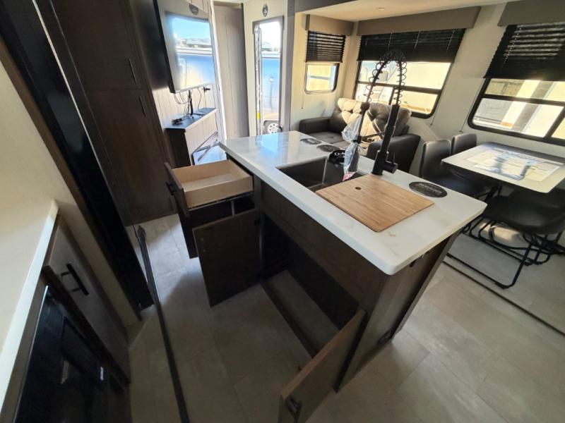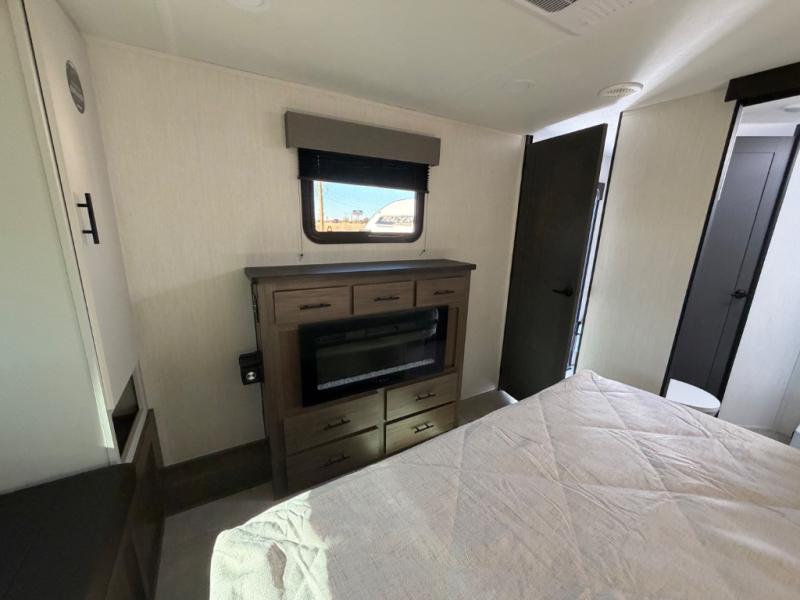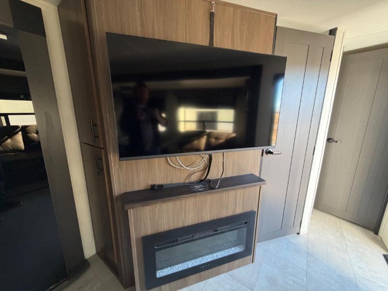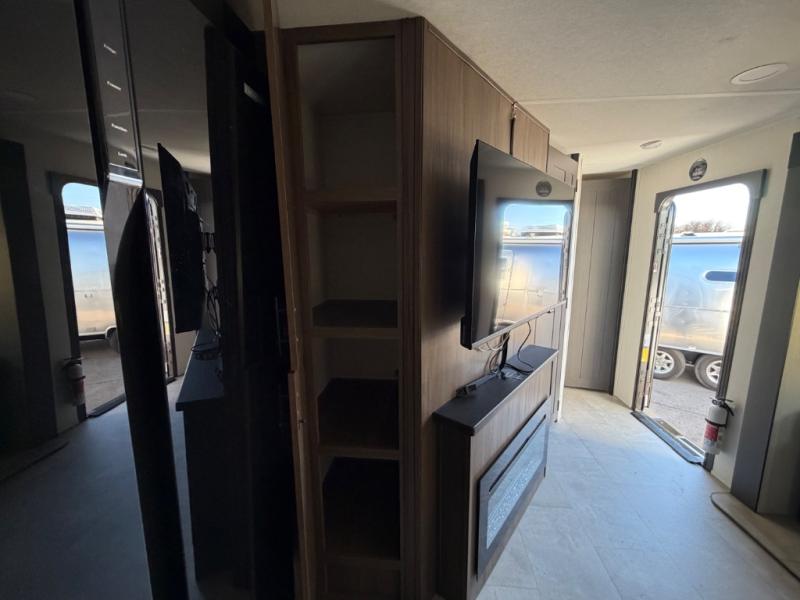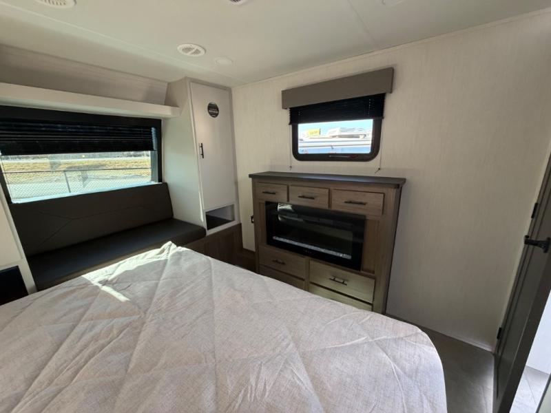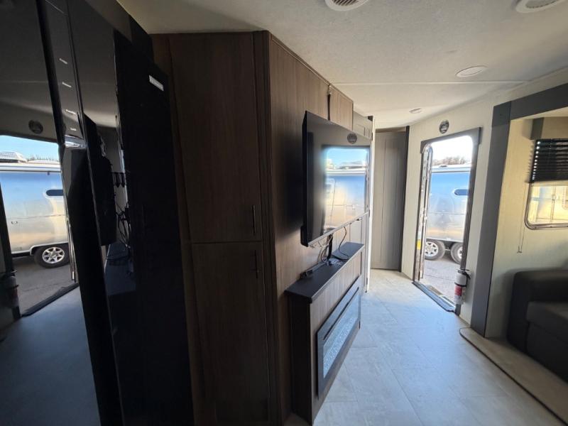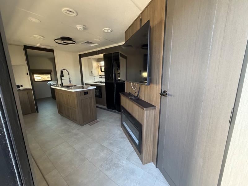 Privacy abounds in this travel trailer with a bedroom at each end! A king bed slide in the front has its own fireplace for cozy nights. Dual wardrobes frame the reading bench which looks out the front window for peaceful moments appreciating the view. At the rear, a second bedroom with queen bed has its own half bath. A pantry closet here also has prep for an optional washer/dryer for convenience on the road. In the center everyone can meet up in the spacious kitchen/living room. A hide-a-bed sofa has even more sleeping space, or relax there and watch the TV which is in the entertainment center along with another fireplace. The kitchen is well-equipped with a three-burner cooktop, microwave, and even an island where the sink is located for easy meal prep. Outside there are not one but two 10' power awnings for extra protection from the elements!
