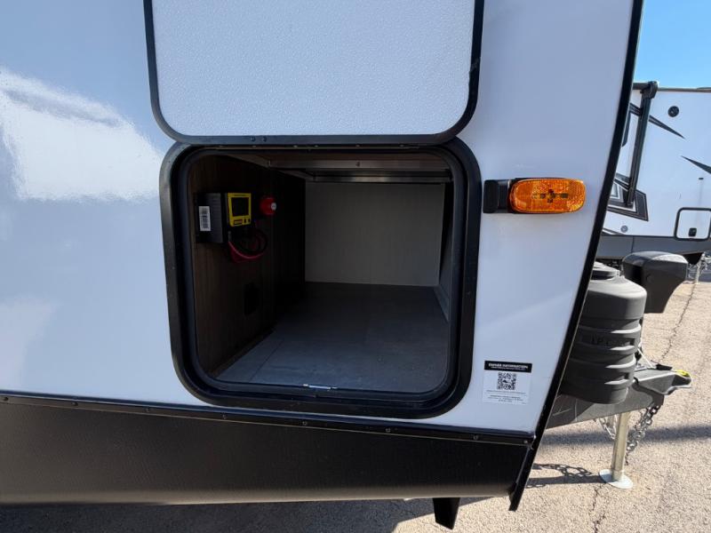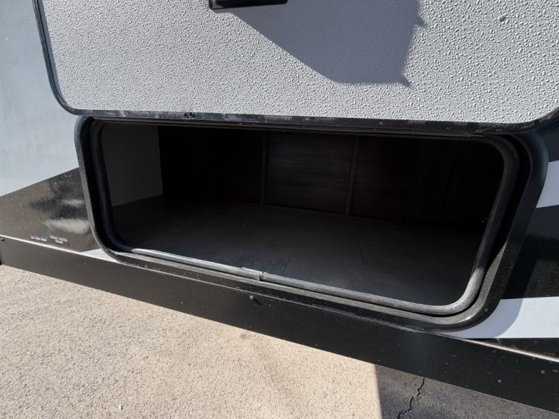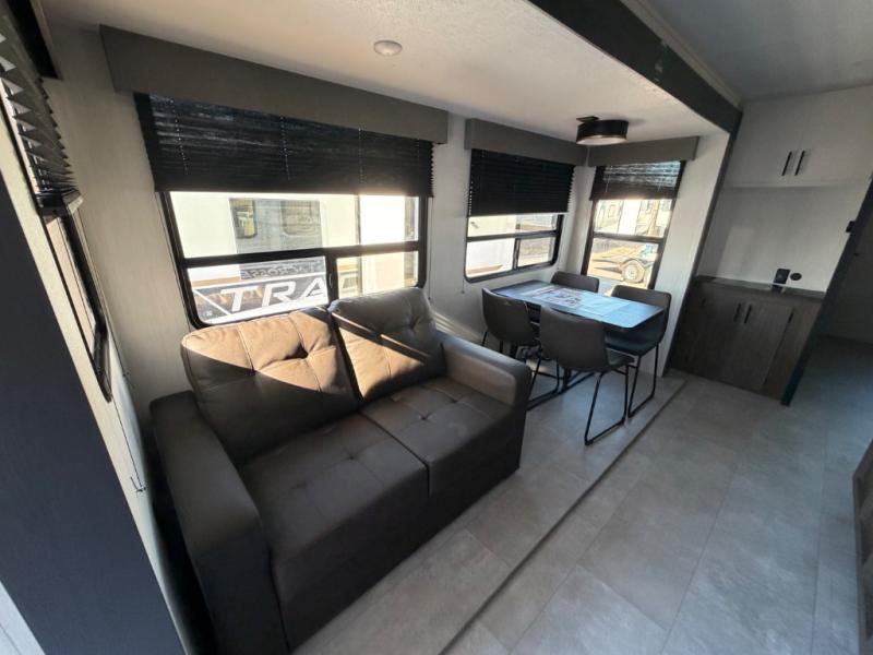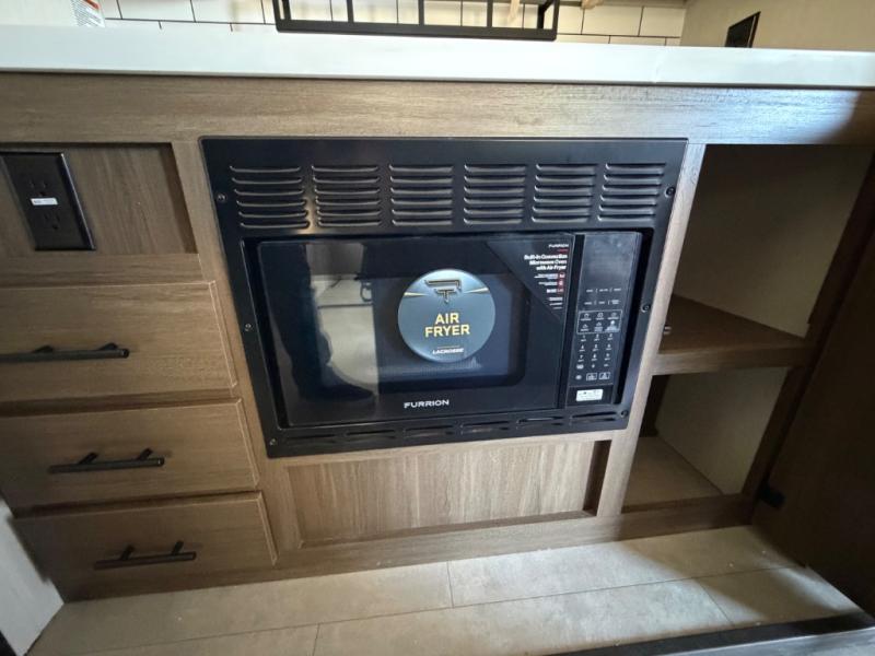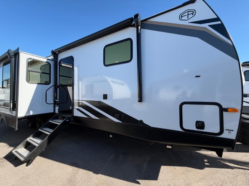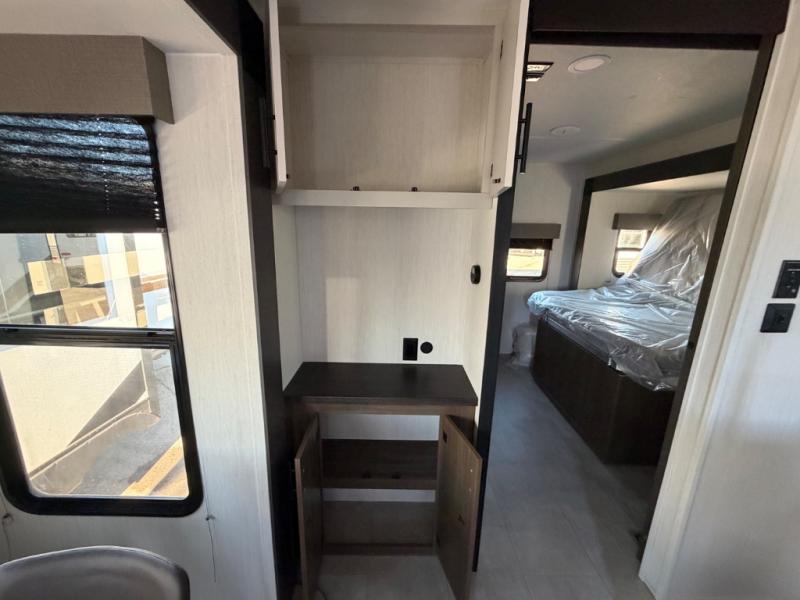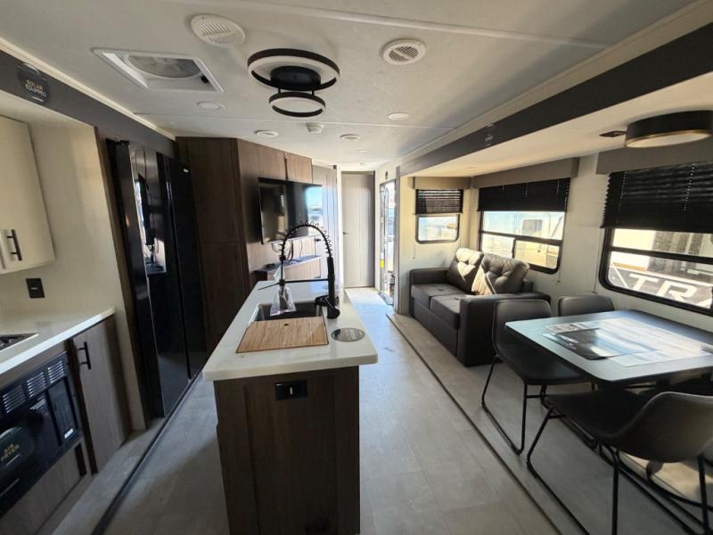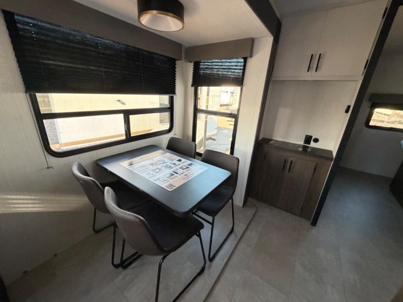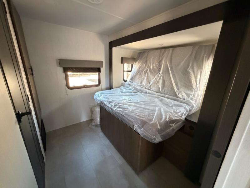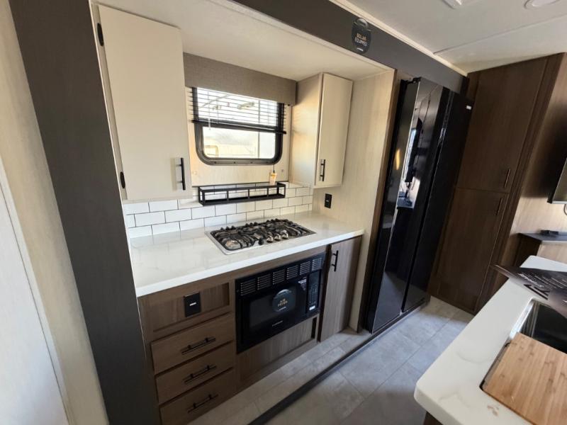 Privacy abounds in this travel trailer with a bedroom at each end! A king bed slide in the front has its own fireplace for cozy nights. Dual wardrobes frame the reading bench which looks out the front window for peaceful moments appreciating the view. At the rear, a second bedroom with queen bed has its own half bath. A pantry closet here also has prep for an optional washer/dryer for convenience on the road. In the center everyone can meet up in the spacious kitchen/living room. A hide-a-bed sofa has even more sleeping space, or relax there and watch the TV which is in the entertainment center along with another fireplace. The kitchen is well-equipped with a three-burner cooktop, microwave, and even an island where the sink is located for easy meal prep. Outside there are not one but two 10' power awnings for extra protection from the elements!