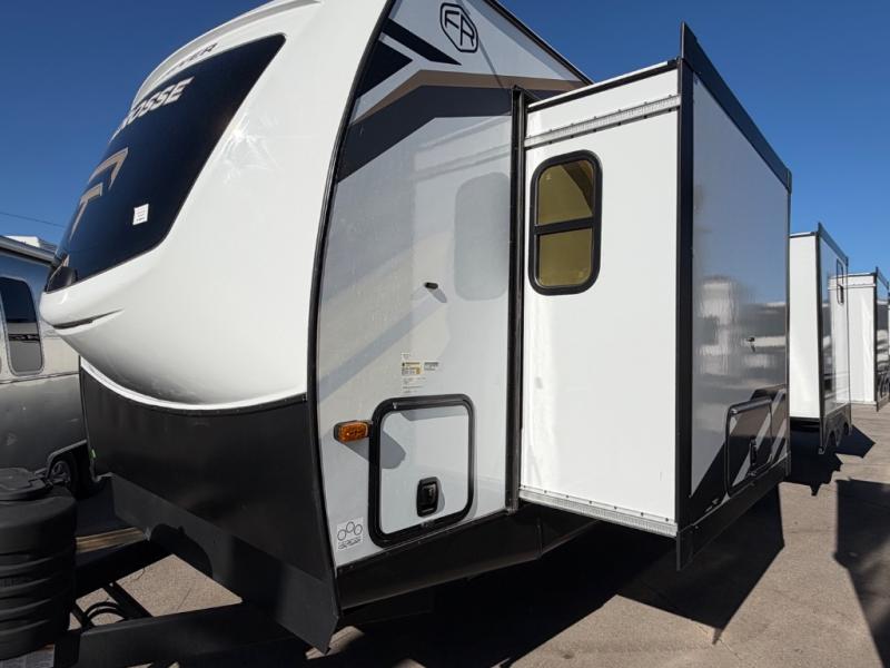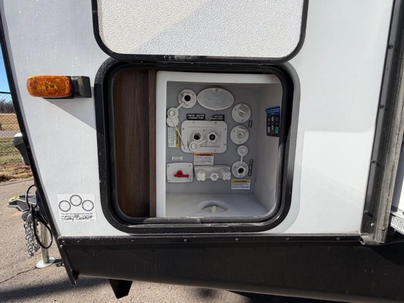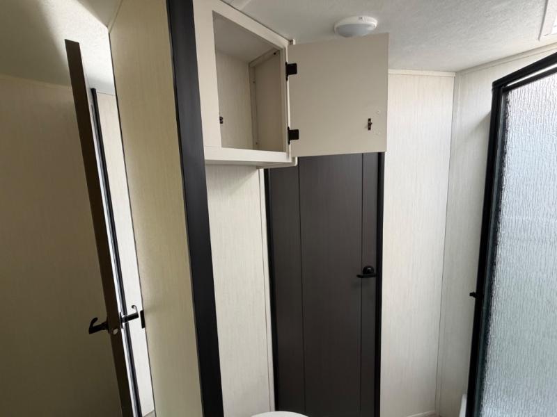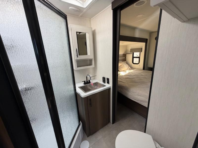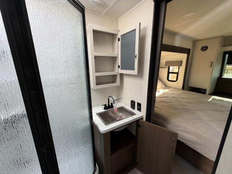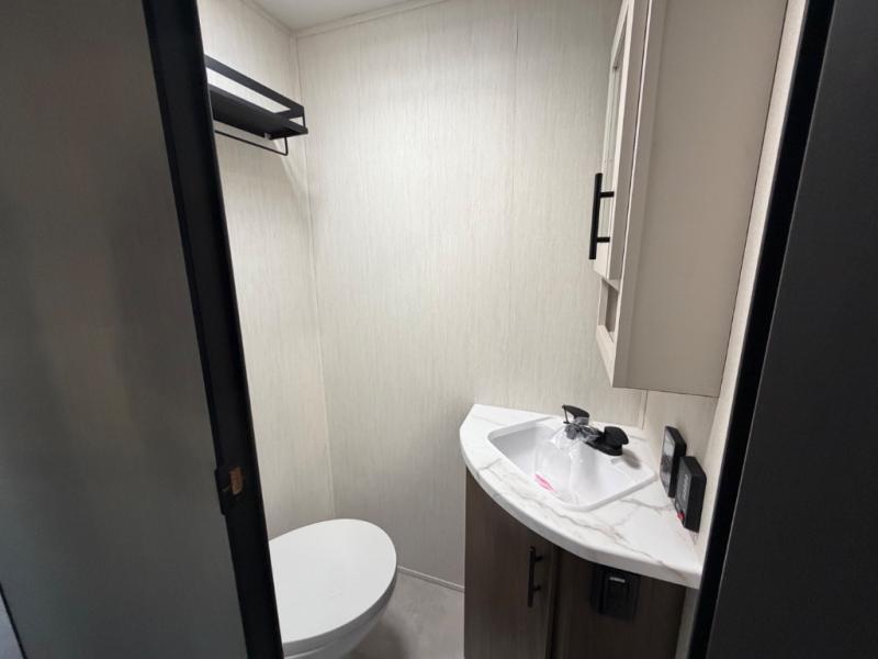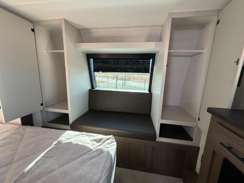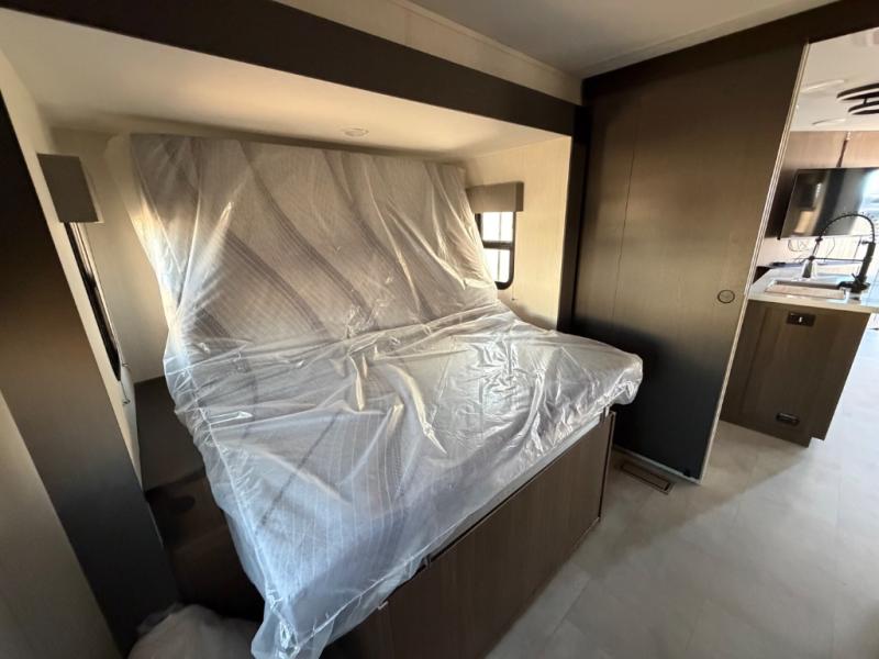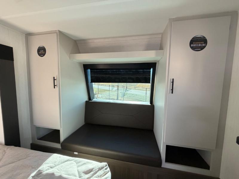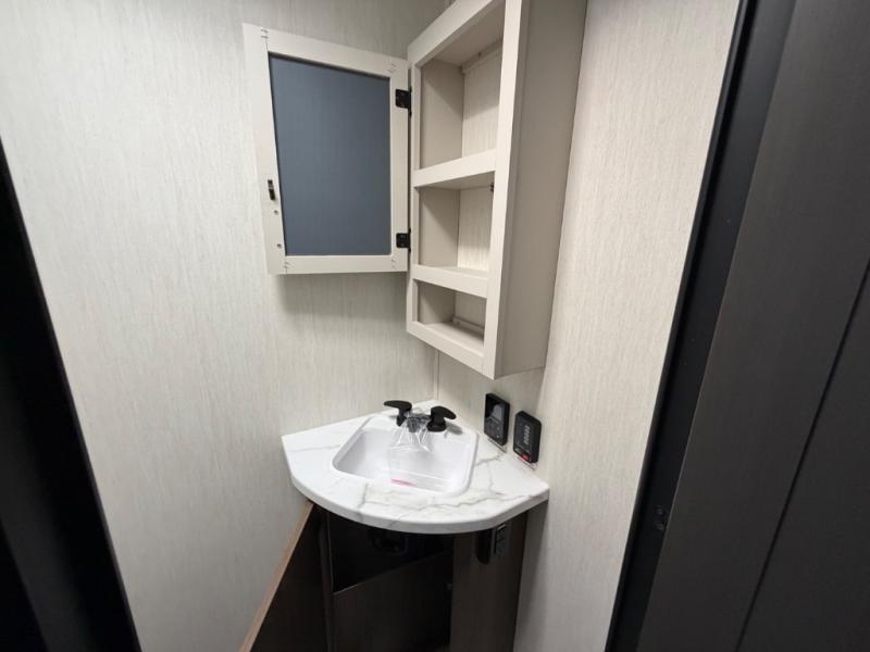 Privacy abounds in this travel trailer with a bedroom at each end! A king bed slide in the front has its own fireplace for cozy nights. Dual wardrobes frame the reading bench which looks out the front window for peaceful moments appreciating the view. At the rear, a second bedroom with queen bed has its own half bath. A pantry closet here also has prep for an optional washer/dryer for convenience on the road. In the center everyone can meet up in the spacious kitchen/living room. A hide-a-bed sofa has even more sleeping space, or relax there and watch the TV which is in the entertainment center along with another fireplace. The kitchen is well-equipped with a three-burner cooktop, microwave, and even an island where the sink is located for easy meal prep. Outside there are not one but two 10' power awnings for extra protection from the elements!
