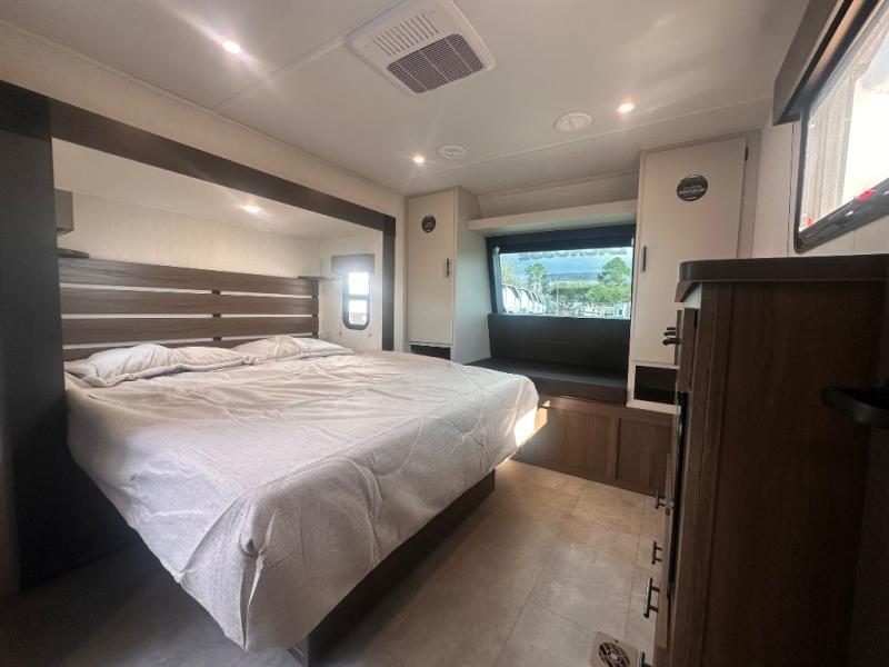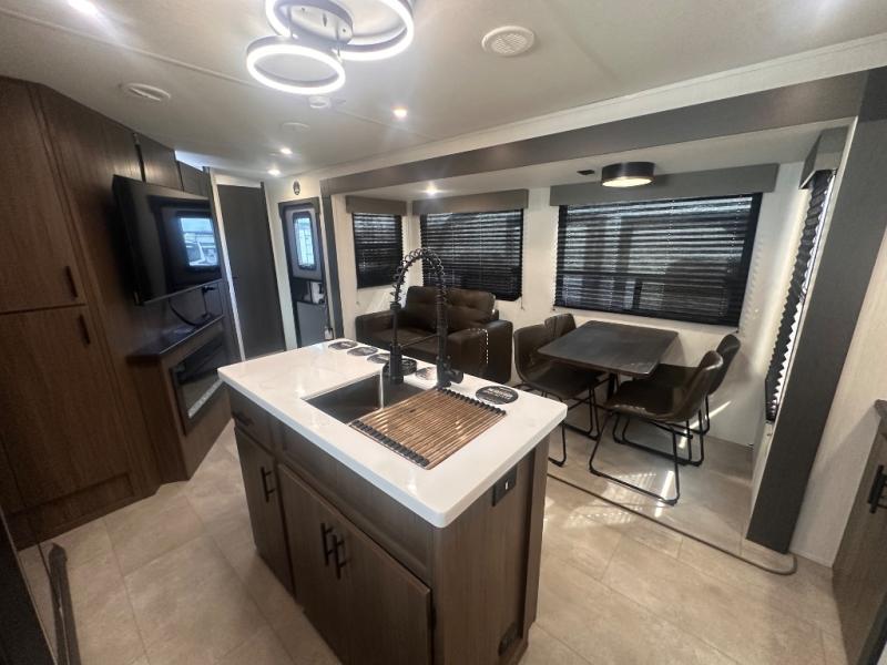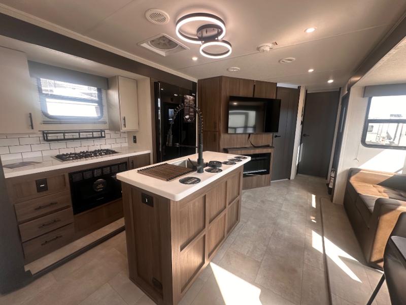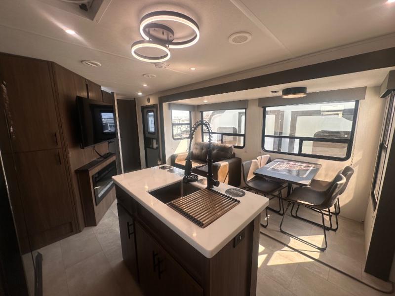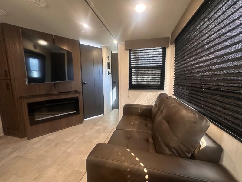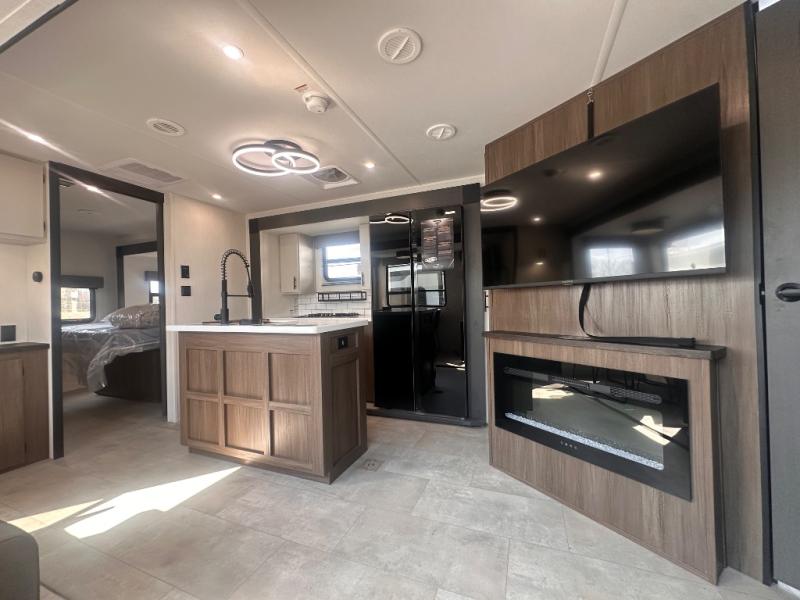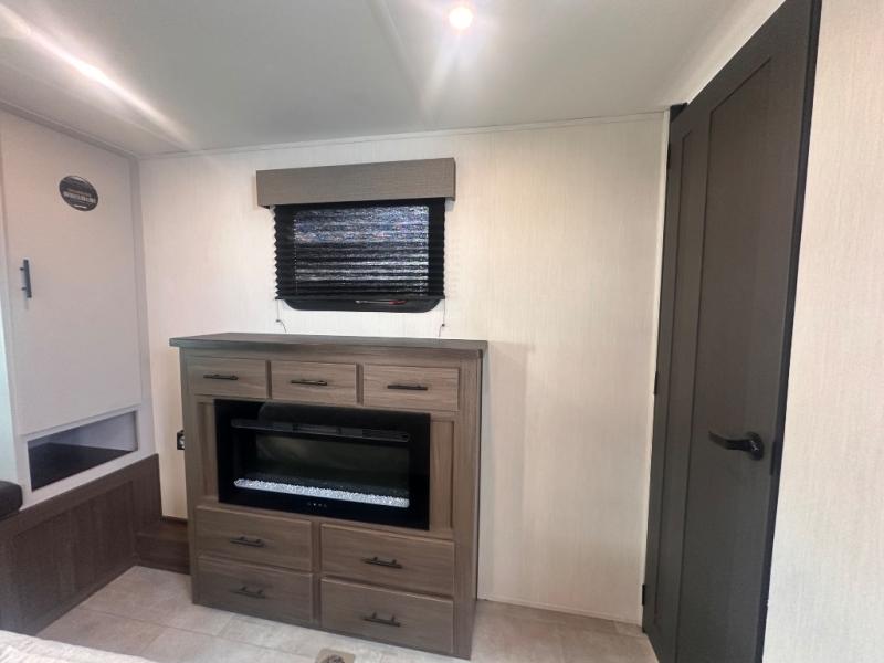 Privacy abounds in this travel trailer with a bedroom at each end! A king bed slide in the front has its own fireplace for cozy nights. Dual wardrobes frame the reading bench which looks out the front window for peaceful moments appreciating the view. At the rear, a second bedroom with queen bed has its own half bath. A pantry closet here also has prep for an optional washer/dryer for convenience on the road. In the center everyone can meet up in the spacious kitchen/living room. A hide-a-bed sofa has even more sleeping space, or relax there and watch the TV which is in the entertainment center along with another fireplace. The kitchen is well-equipped with a three-burner cooktop, microwave, and even an island where the sink is located for easy meal prep. Outside there are not one but two 10' power awnings for extra protection from the elements!