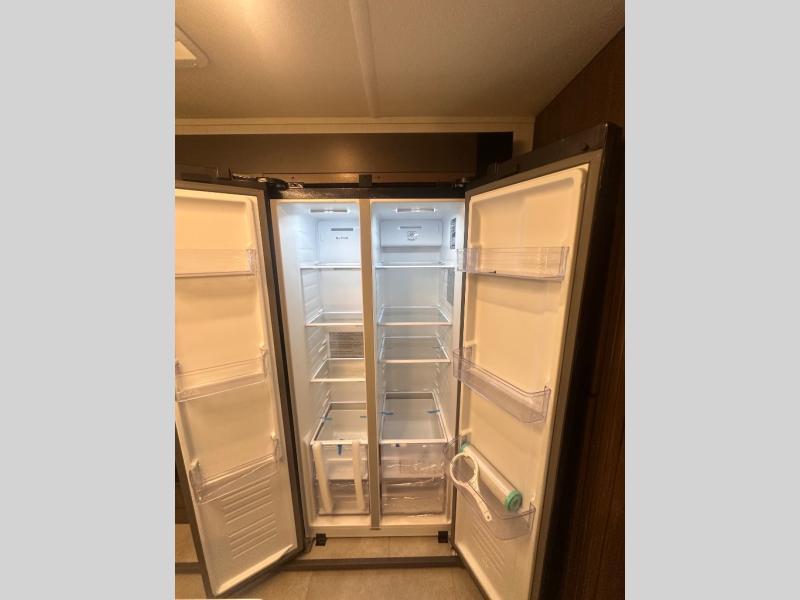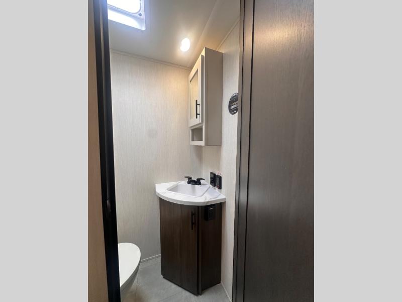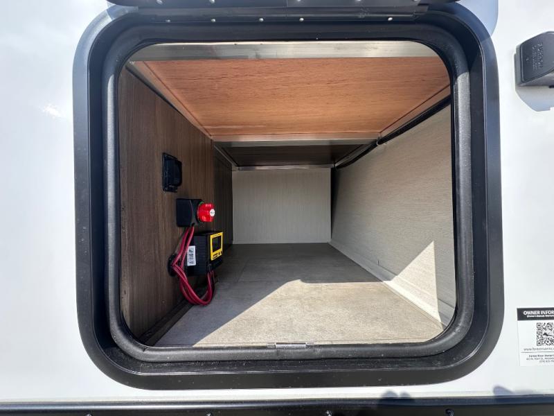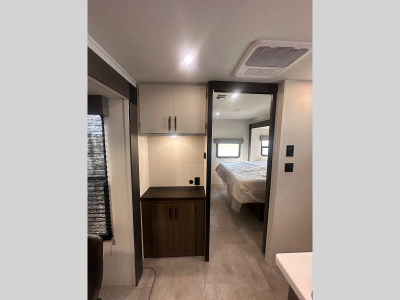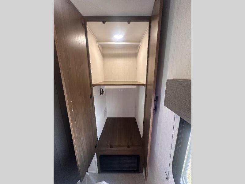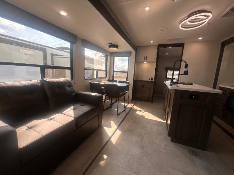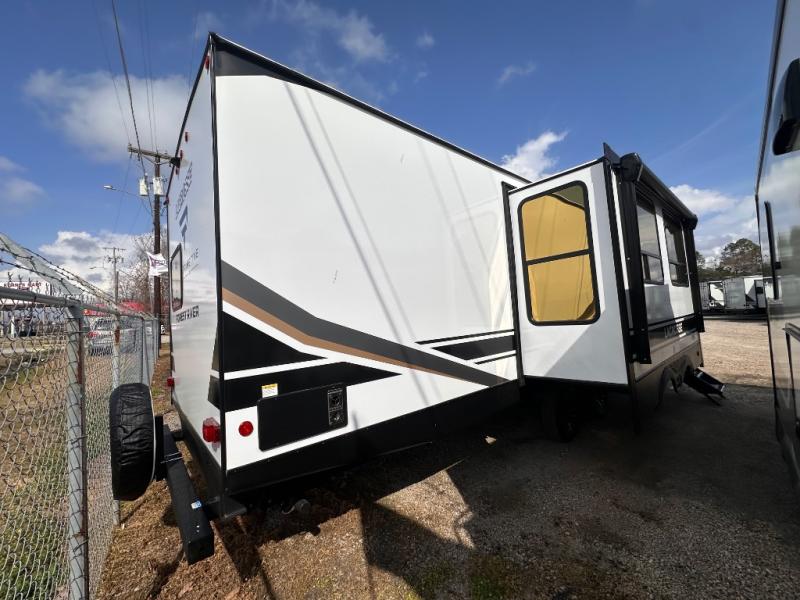 Privacy abounds in this travel trailer with a bedroom at each end! A king bed slide in the front has its own fireplace for cozy nights. Dual wardrobes frame the reading bench which looks out the front window for peaceful moments appreciating the view. At the rear, a second bedroom with queen bed has its own half bath. A pantry closet here also has prep for an optional washer/dryer for convenience on the road. In the center everyone can meet up in the spacious kitchen/living room. A hide-a-bed sofa has even more sleeping space, or relax there and watch the TV which is in the entertainment center along with another fireplace. The kitchen is well-equipped with a three-burner cooktop, microwave, and even an island where the sink is located for easy meal prep. Outside there are not one but two 10' power awnings for extra protection from the elements!