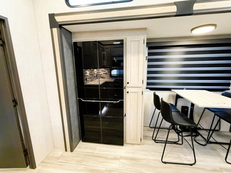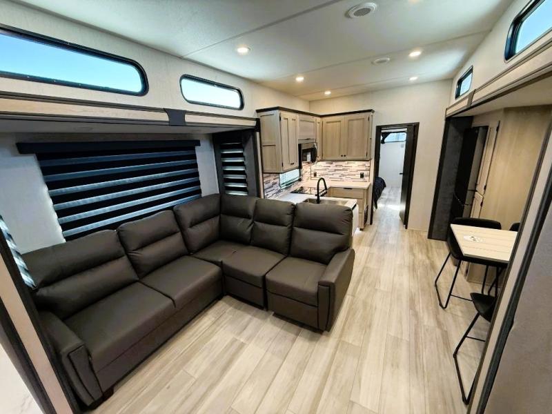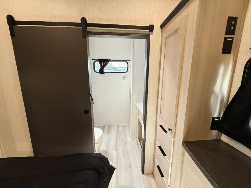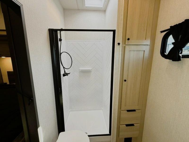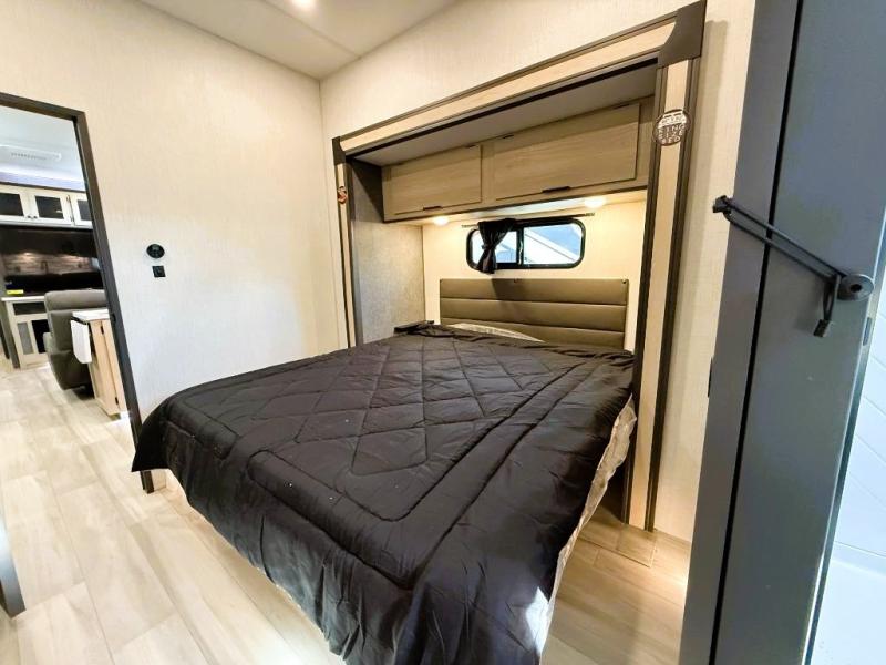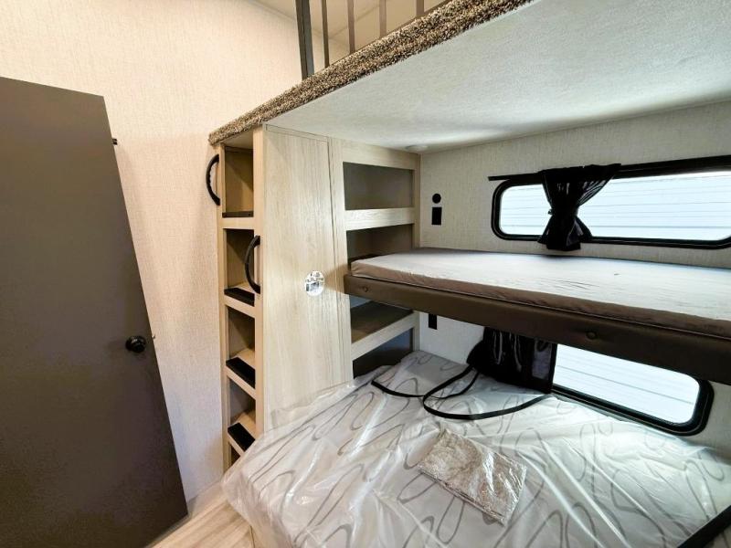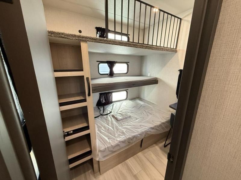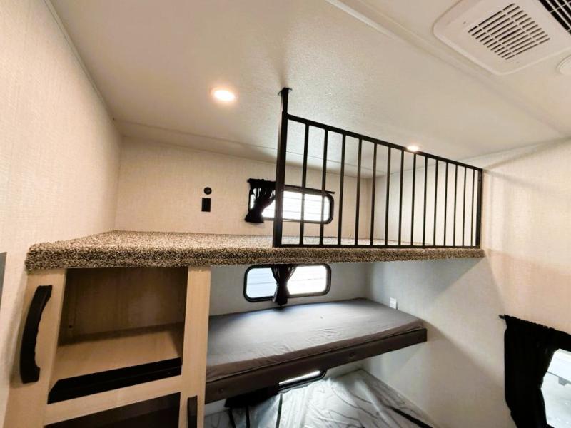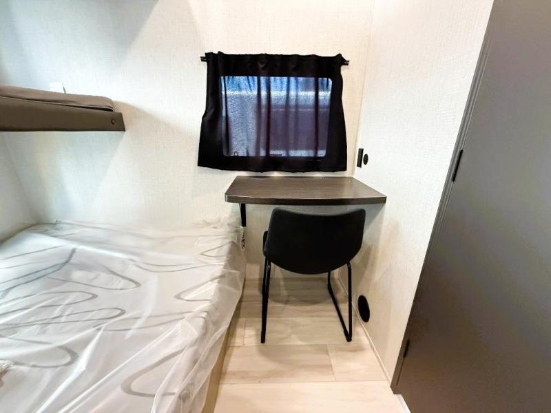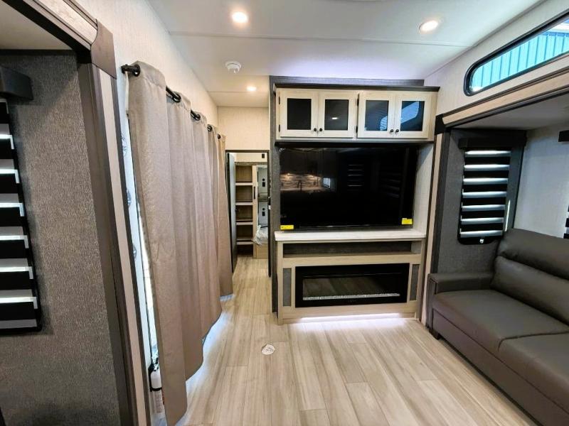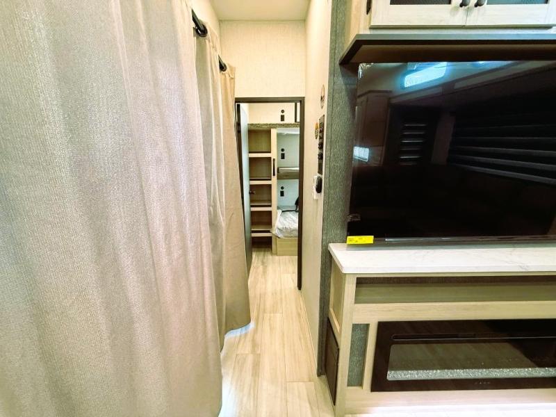 This stunning travel trailer is designed for families and travelers who crave comfort. Two rear bunk beds and a cozy loft above them create a fun and playful sleeping area for kids or guests, perfect for family bonding and sweet dreams. The full bathroom is equipped with everything you need to start your day feeling refreshed and revitalized. In the living area, the entertainment center features a warm fireplace, ideal for chilly evenings and cozy movie nights, while the plush L sofa is the perfect spot to unwind and enjoy quality time with loved ones. The pantry is stocked with storage for your favorite snacks and ingredients, while the fridge keeps everything fresh. There is a well-equipped kitchen with a spacious countertop for added convenience. Plus, the main bedroom is a peaceful sanctuary, featuring a luxurious king bed, spacious wardrobes, a stylish dresser, and the front bathroom is a thoughtful touch, offering privacy for your family or guests.