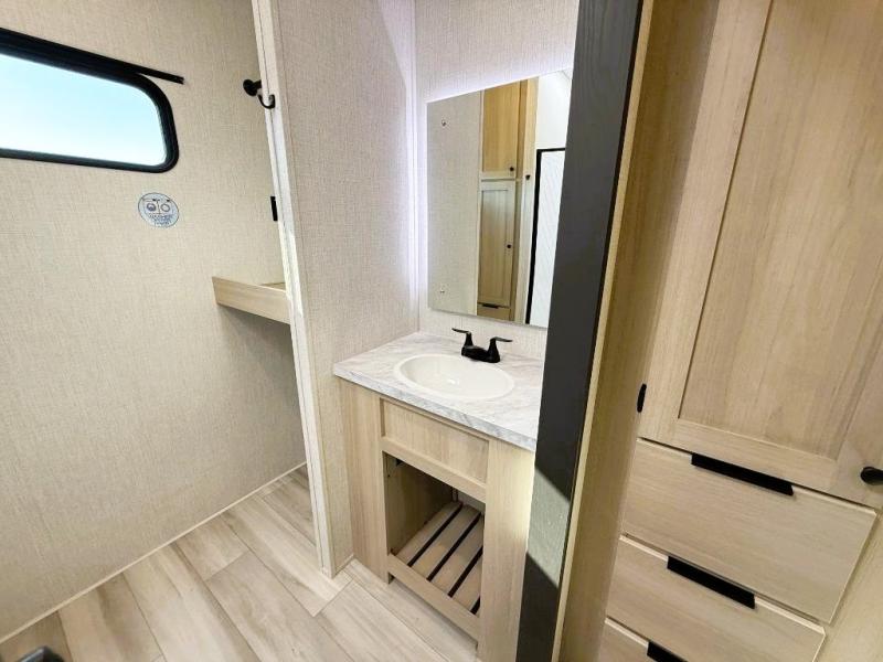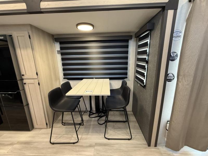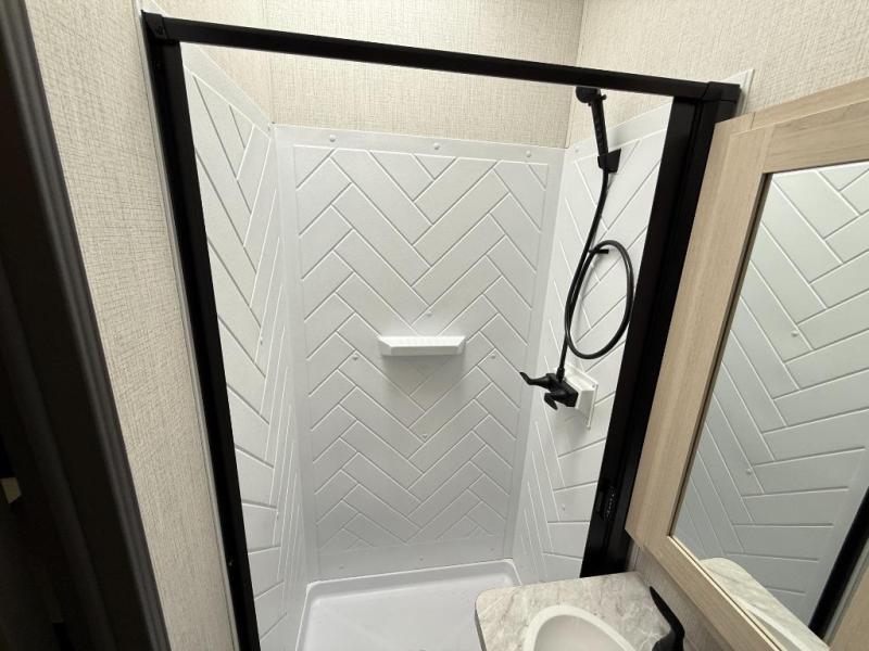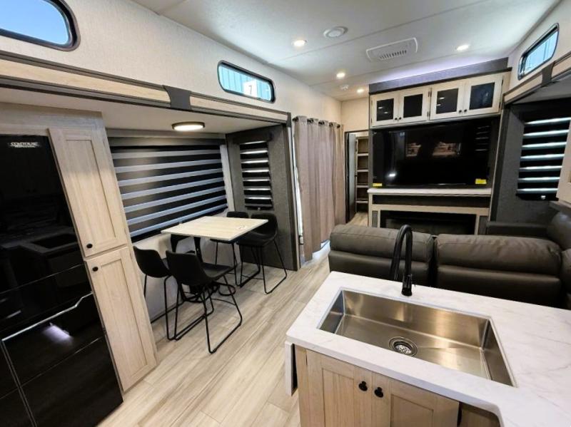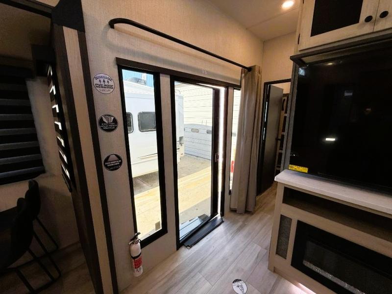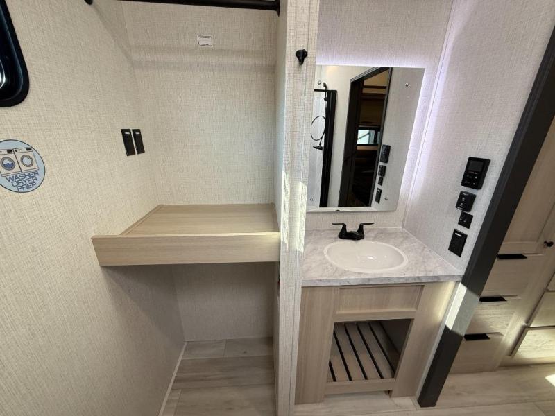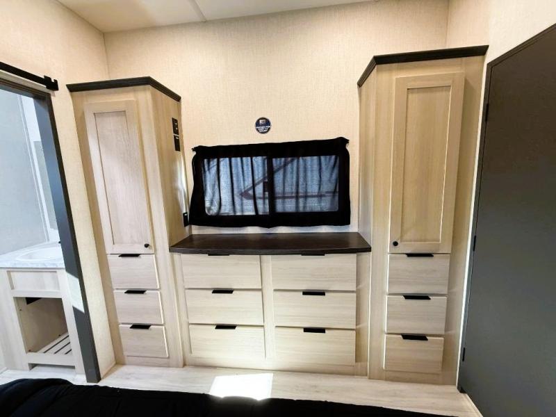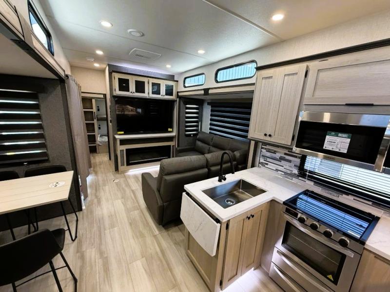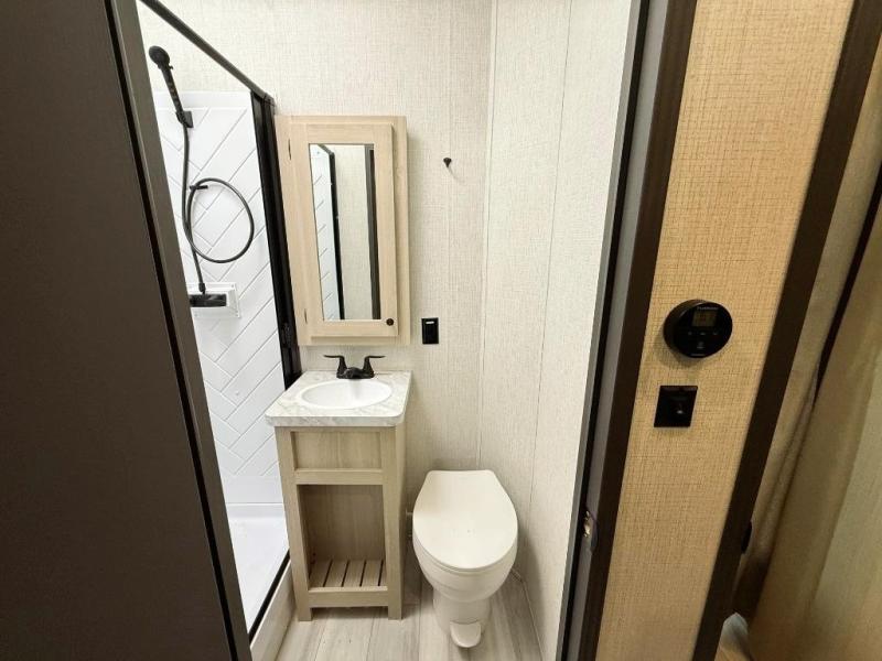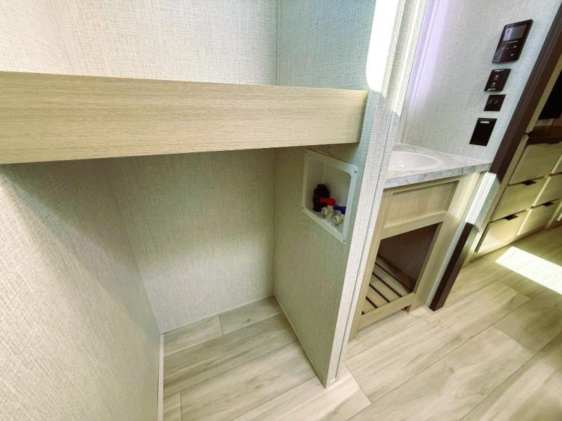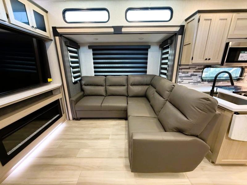 This stunning travel trailer is designed for families and travelers who crave comfort. Two rear bunk beds and a cozy loft above them create a fun and playful sleeping area for kids or guests, perfect for family bonding and sweet dreams. The full bathroom is equipped with everything you need to start your day feeling refreshed and revitalized. In the living area, the entertainment center features a warm fireplace, ideal for chilly evenings and cozy movie nights, while the plush L sofa is the perfect spot to unwind and enjoy quality time with loved ones. The pantry is stocked with storage for your favorite snacks and ingredients, while the fridge keeps everything fresh. There is a well-equipped kitchen with a spacious countertop for added convenience. Plus, the main bedroom is a peaceful sanctuary, featuring a luxurious king bed, spacious wardrobes, a stylish dresser, and the front bathroom is a thoughtful touch, offering privacy for your family or guests.
