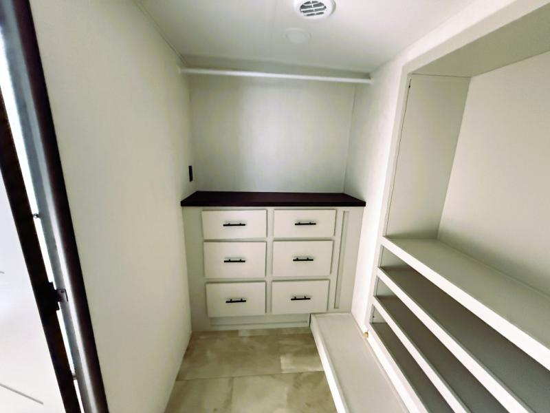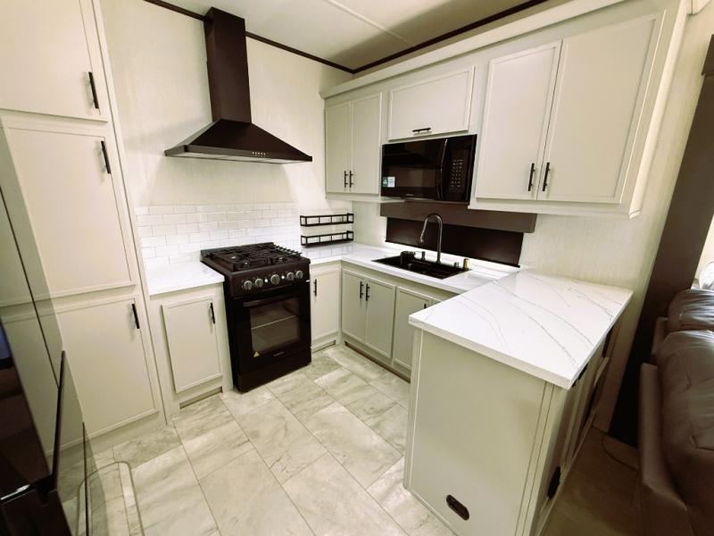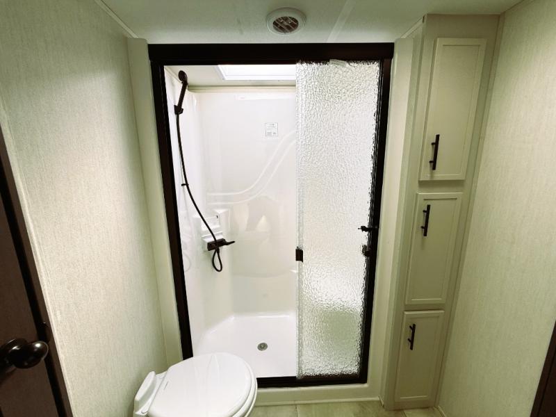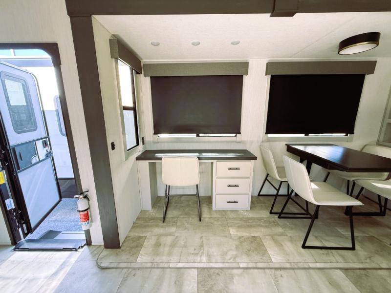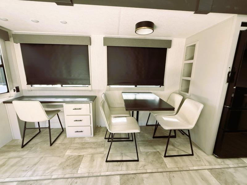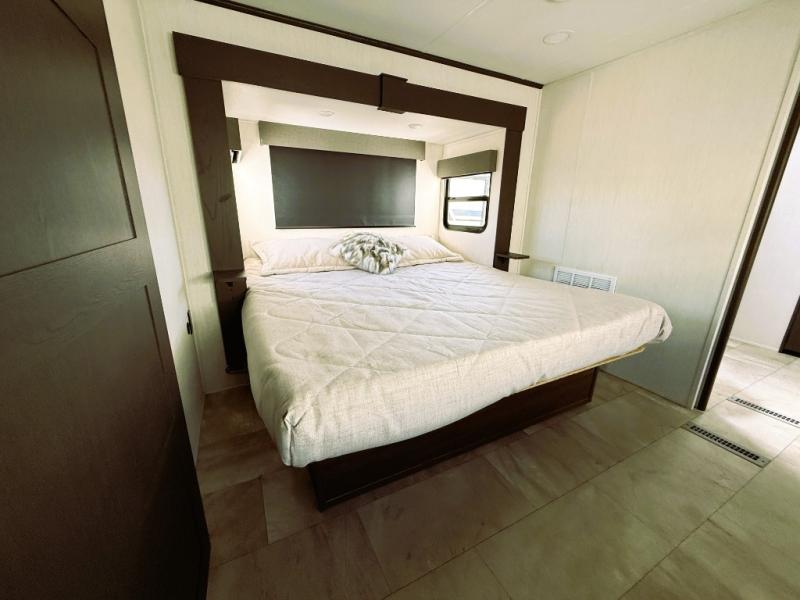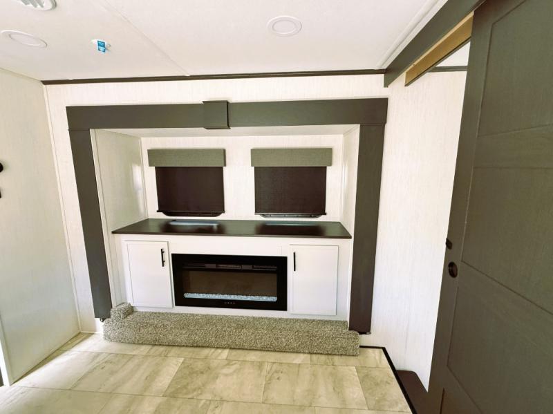 The Sanibel series stands out with a combination of unique and highly functional exterior and interior features designed for both convenience and durability. On the outside, a drop-frame pass-through storage area with a rubberized liner offers ample space while protecting your gear from moisture and wear. Setting up camp is effortless thanks to the one-touch auto-leveling system and rubberized suspension equalizer, which provide a smooth and stable foundation. Inside, comfort meets practicality with carpet less slides for easy cleaning and blackout roller shades for privacy and temperature control. The real wood cabinet doors and solid surface countertops add a touch of elegance, no matter where the road takes you.