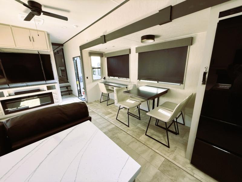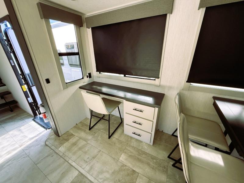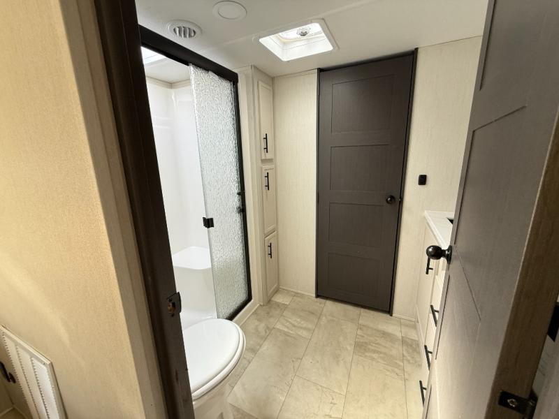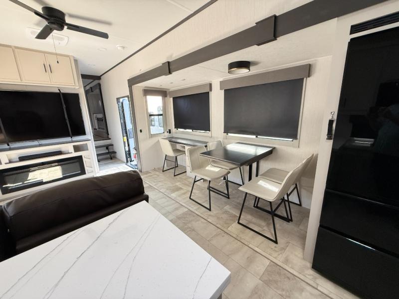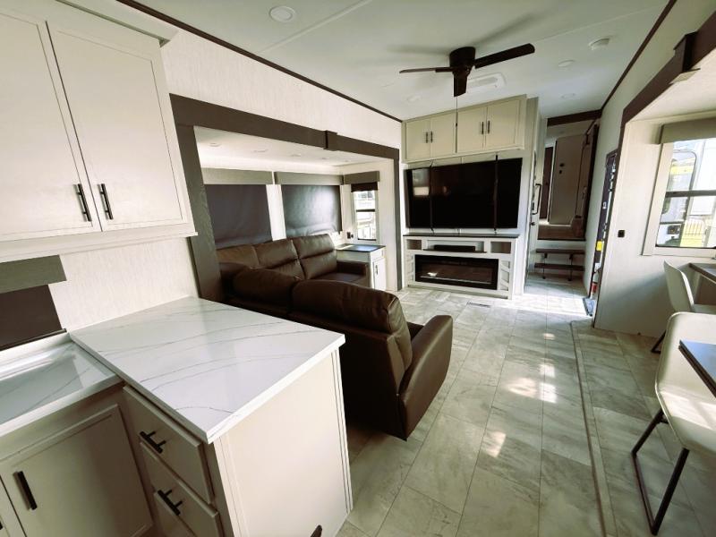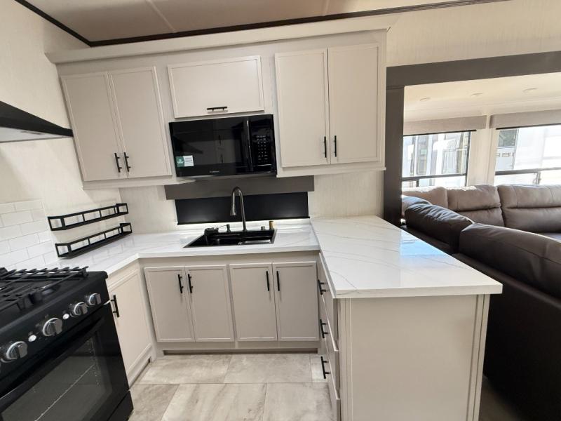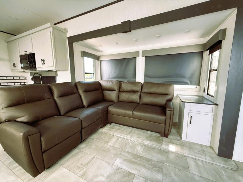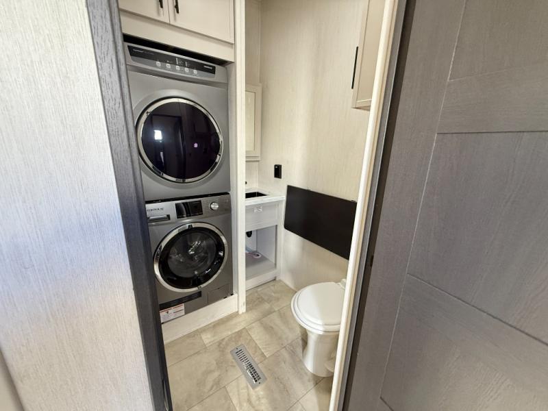 One of the standout features of the 38LAUNDRY fifth wheel is the convenient stackable washer and dryer located in the half bath, letting you take care of laundry right from the comfort of your trailer, no campground laundromat needed. After a day full of outdoor adventures, everyone can relax together in the spacious living room, which features a large sectional sleeper sofa perfect for movie nights or extra sleeping space. The equipped kitchen includes a four-burner range, giving the chef plenty of room to cook up delicious meals with ease. And when it's time to unwind, the private bedroom offers a peaceful retreat complete with a walk-through private bathroom featuring a dual vanity and a generous walk-in closet, ideal for storing all your clothes and camping gear.