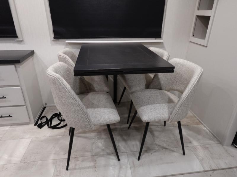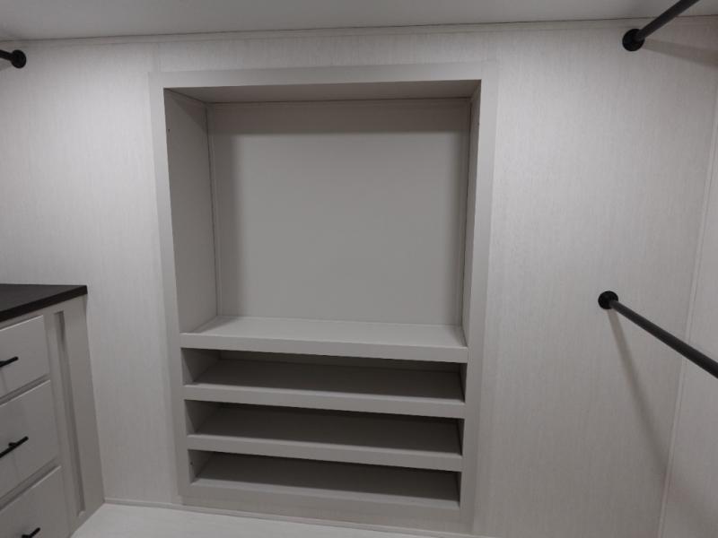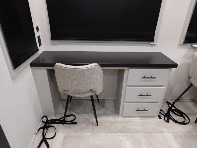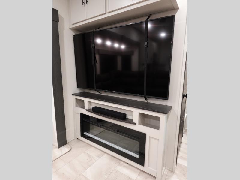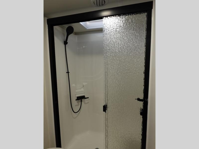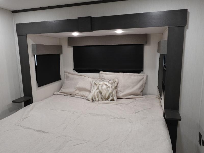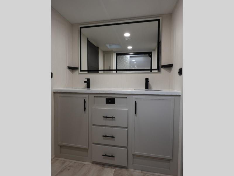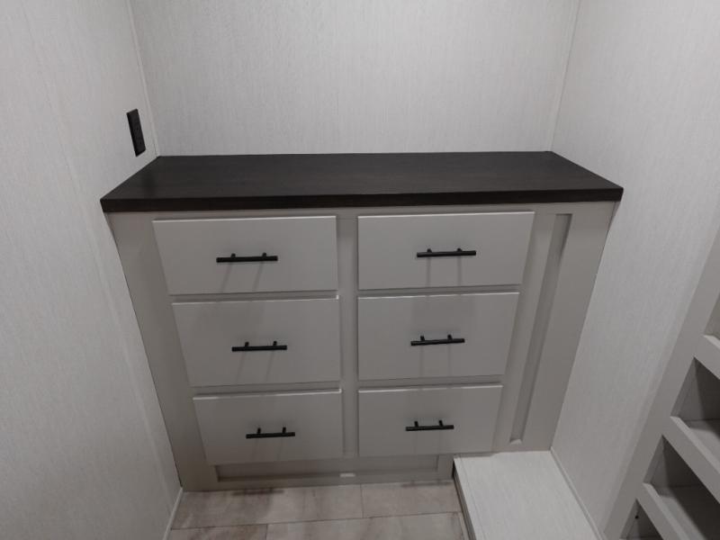 The Sanibel series stands out with a combination of unique and highly functional exterior and interior features designed for both convenience and durability. On the outside, a drop-frame pass-through storage area with a rubberized liner offers ample space while protecting your gear from moisture and wear. Setting up camp is effortless thanks to the one-touch auto-leveling system and rubberized suspension equalizer, which provide a smooth and stable foundation. Inside, comfort meets practicality with carpet less slides for easy cleaning and blackout roller shades for privacy and temperature control. The real wood cabinet doors and solid surface countertops add a touch of elegance, no matter where the road takes you.
