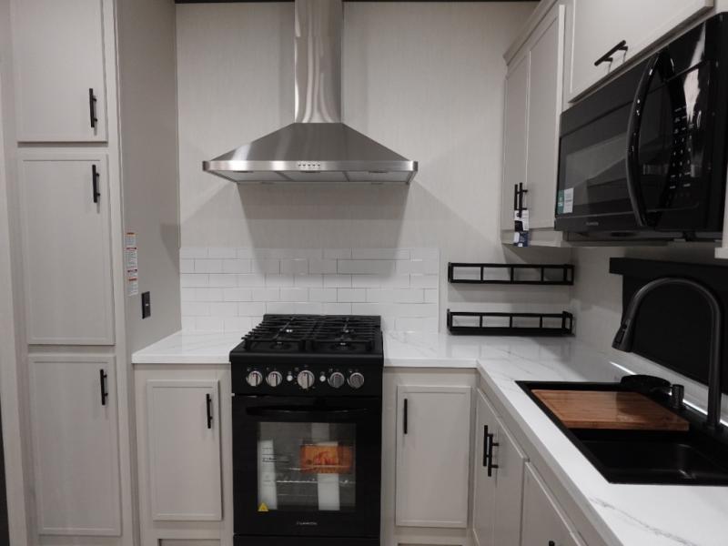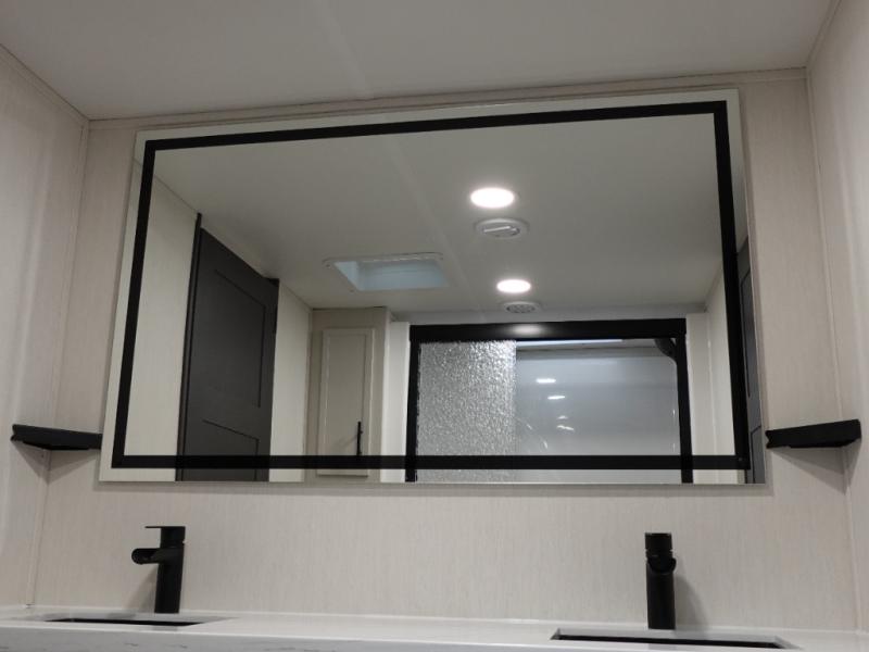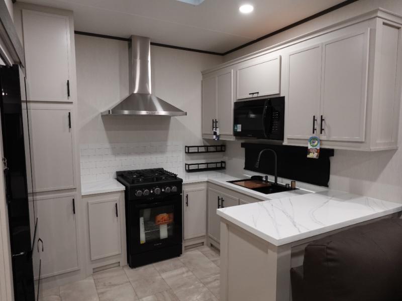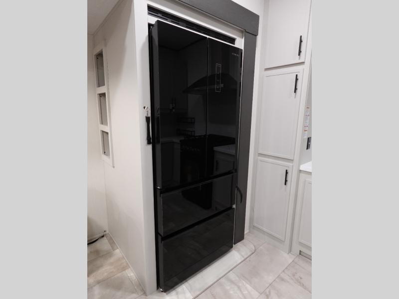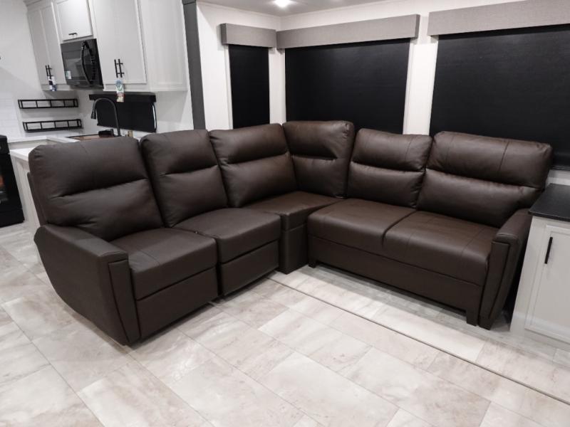 One of the standout features of the 38LAUNDRY fifth wheel is the convenient stackable washer and dryer located in the half bath, letting you take care of laundry right from the comfort of your trailer, no campground laundromat needed. After a day full of outdoor adventures, everyone can relax together in the spacious living room, which features a large sectional sleeper sofa perfect for movie nights or extra sleeping space. The equipped kitchen includes a four-burner range, giving the chef plenty of room to cook up delicious meals with ease. And when it's time to unwind, the private bedroom offers a peaceful retreat complete with a walk-through private bathroom featuring a dual vanity and a generous walk-in closet, ideal for storing all your clothes and camping gear.