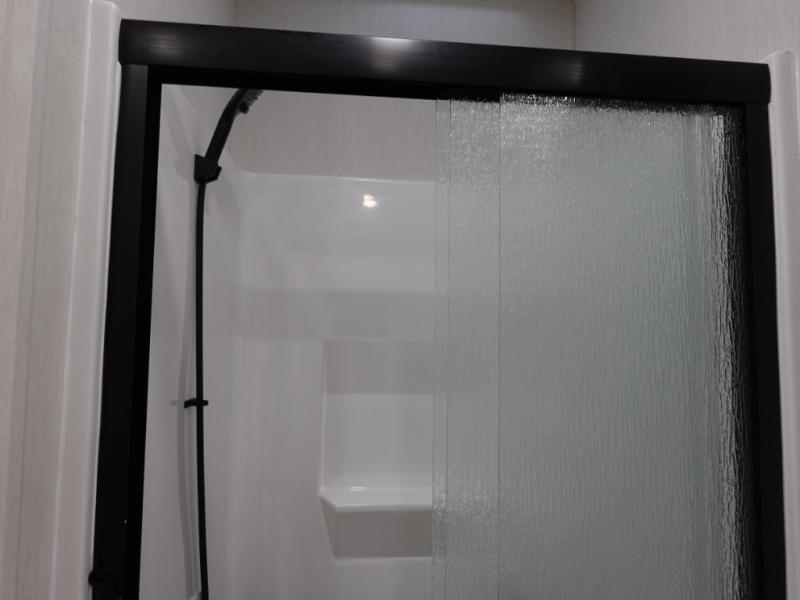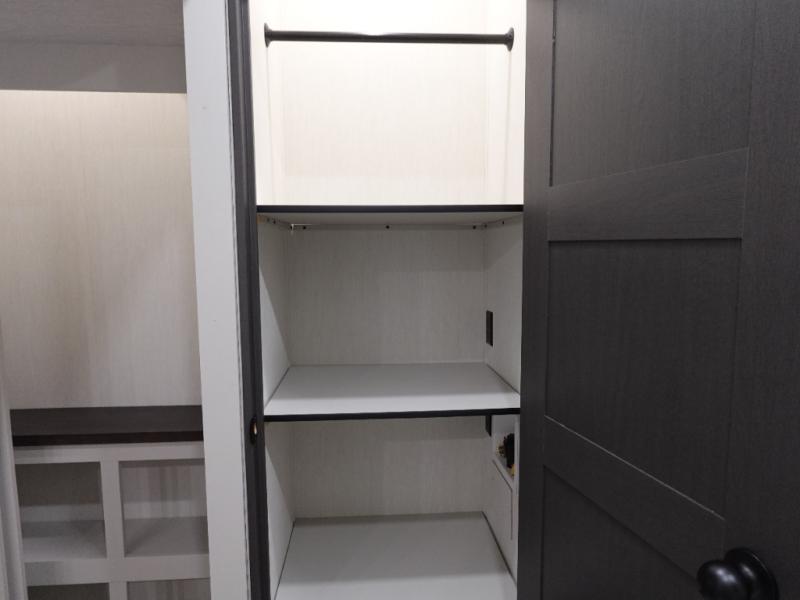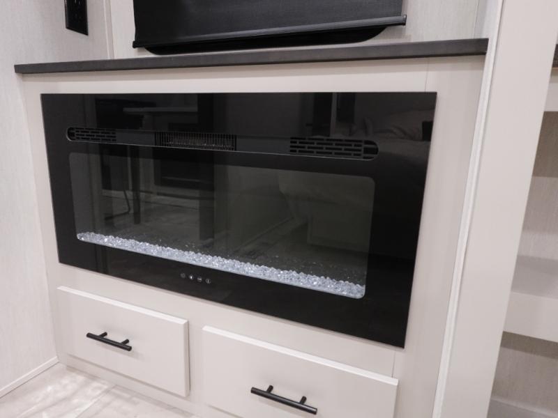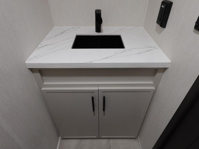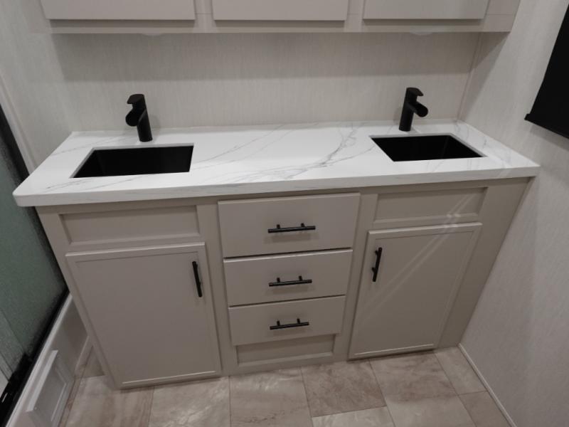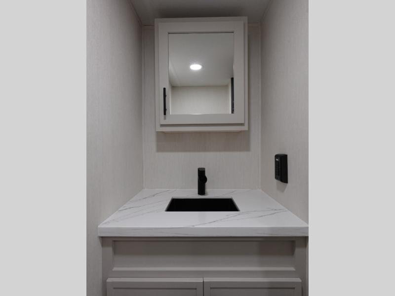 The Sanibel series stands out with a combination of unique and highly functional exterior and interior features designed for both convenience and durability. On the outside, a drop-frame pass-through storage area with a rubberized liner offers ample space while protecting your gear from moisture and wear. Setting up camp is effortless thanks to the one-touch auto-leveling system and rubberized suspension equalizer, which provide a smooth and stable foundation. Inside, comfort meets practicality with carpet less slides for easy cleaning and blackout roller shades for privacy and temperature control. The real wood cabinet doors and solid surface countertops add a touch of elegance, no matter where the road takes you.