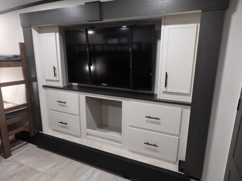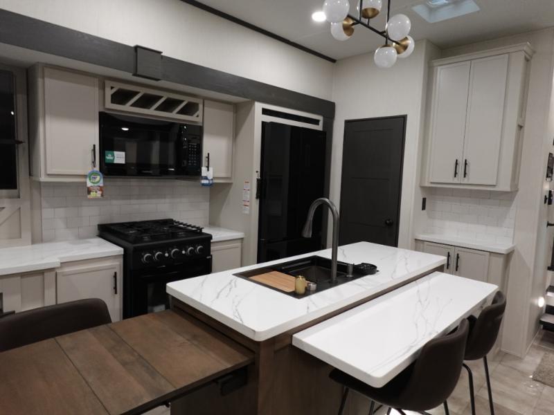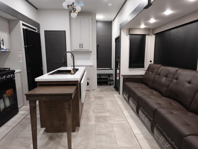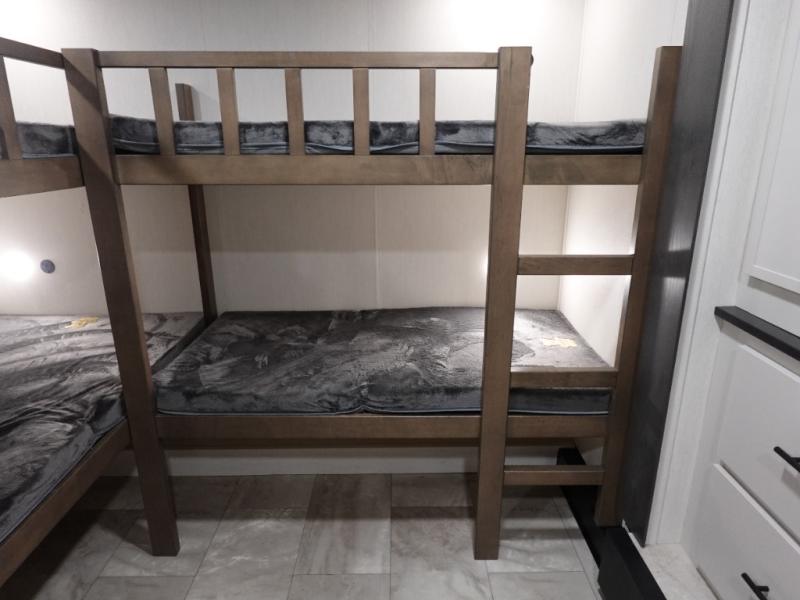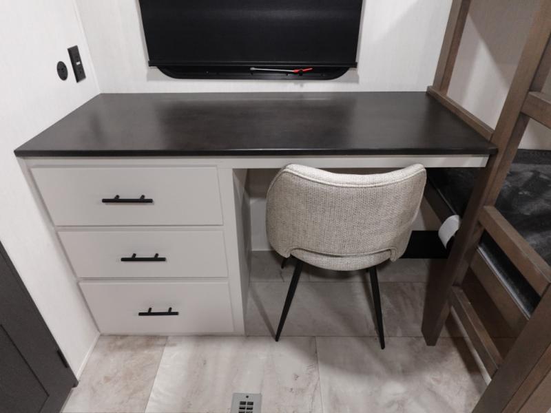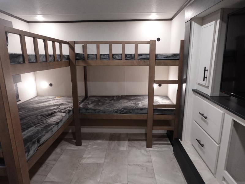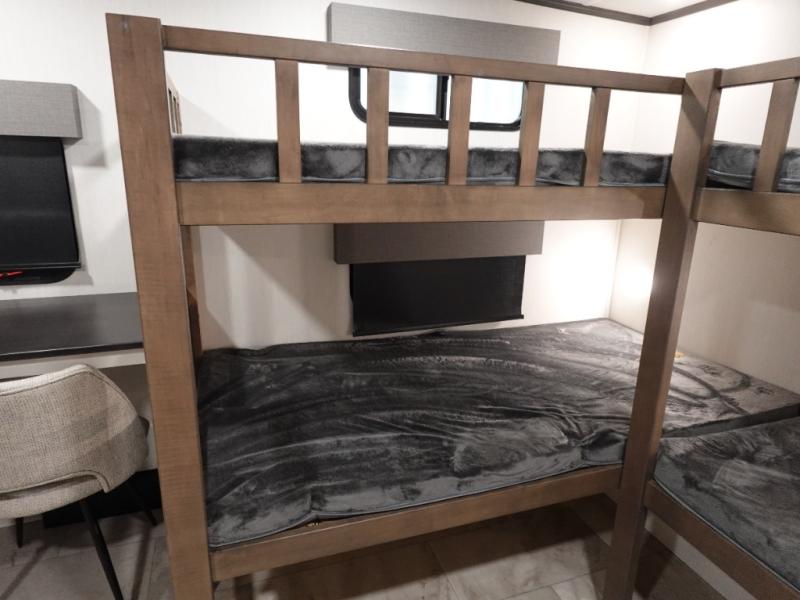 This Sanibel fifth wheel is designed with functionality, starting with the spacious front bunkroom that can sleep up to four on residential-style bunks, perfect for bringing along family or friends. A built-in desk adds versatility, offering a space for work, study, or play, and the attached half bathroom ensures convenience without needing to walk through the entire RV. The middle living area is great for gathering, featuring a five-piece sectional recliner for relaxing, an expandable dinette to seat everyone comfortably, and a fully equipped kitchen that gives the chef all the tools to prepare almost anything they want. At the rear, the private bedroom offers a king-sized bed for ultimate comfort, which leads into a spacious full bathroom complete with a dual vanity, bringing functionality and luxury on the road.