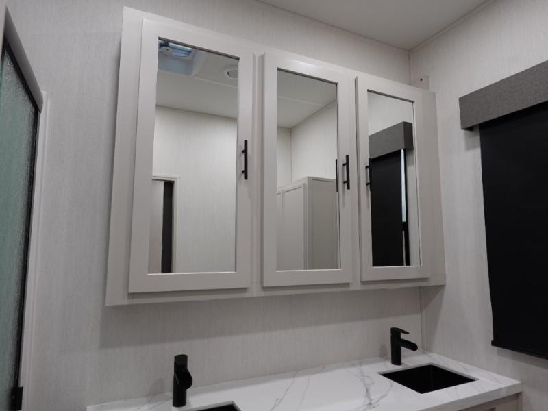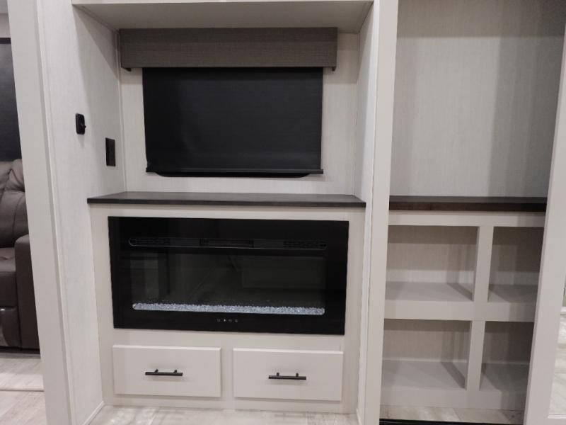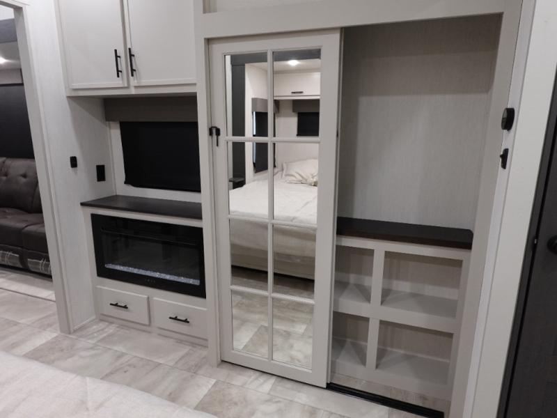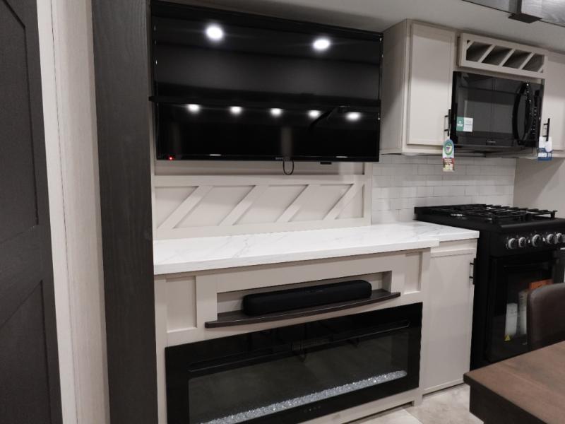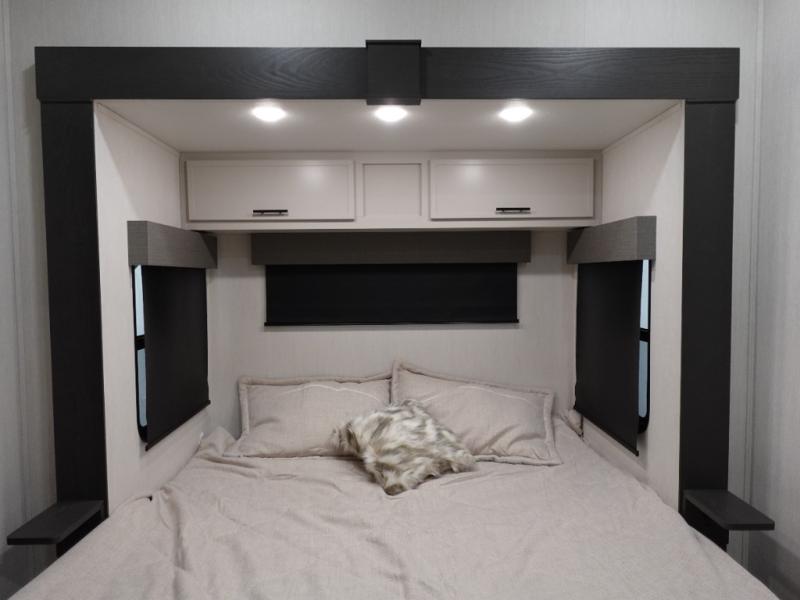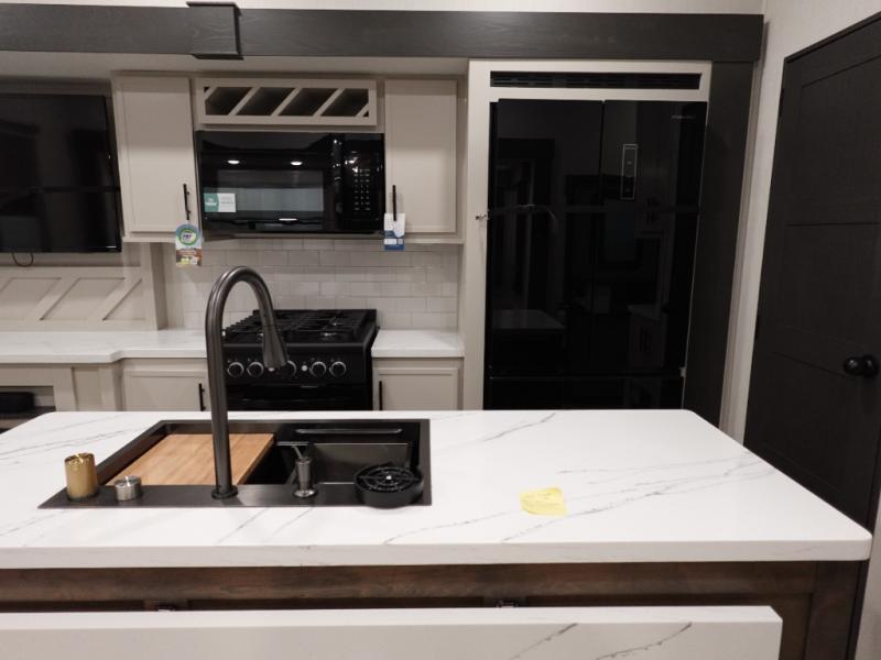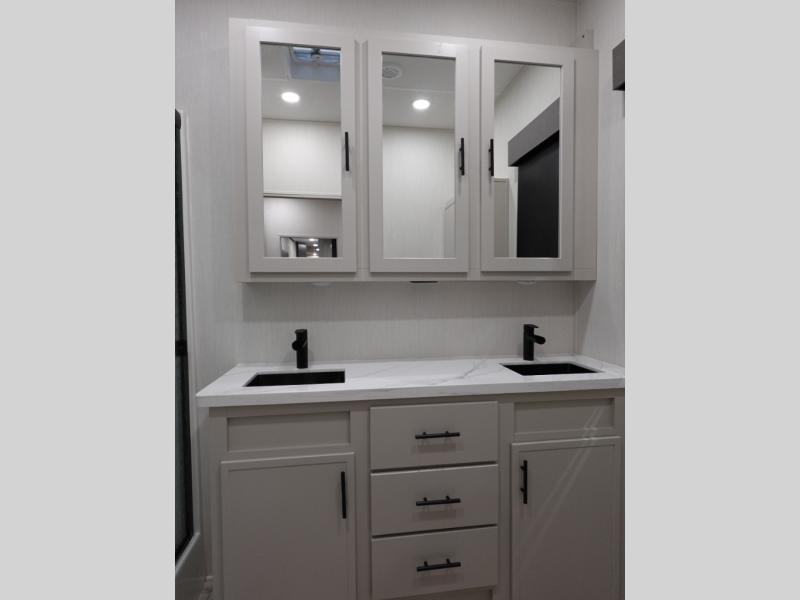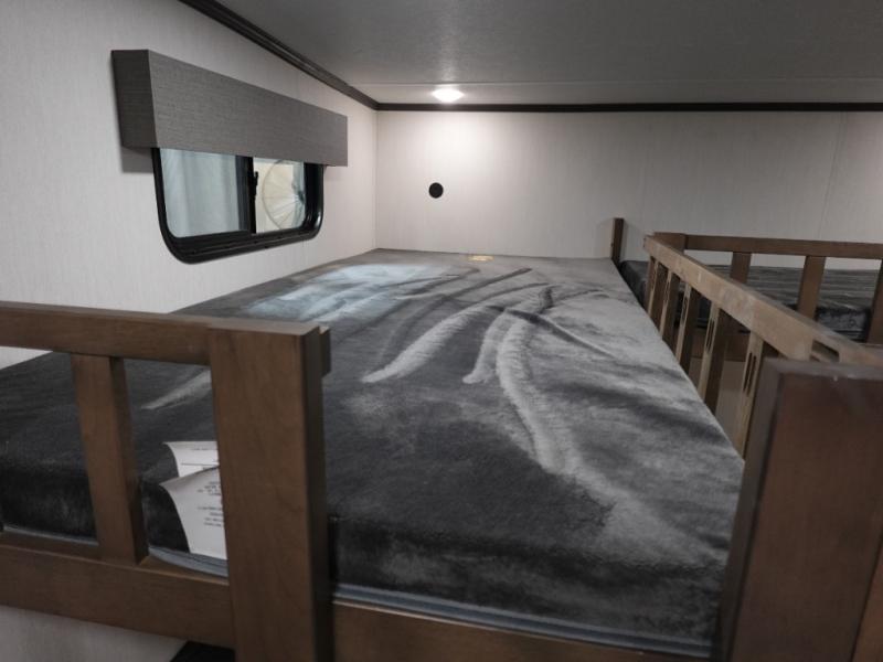 This Sanibel fifth wheel is designed with functionality, starting with the spacious front bunkroom that can sleep up to four on residential-style bunks, perfect for bringing along family or friends. A built-in desk adds versatility, offering a space for work, study, or play, and the attached half bathroom ensures convenience without needing to walk through the entire RV. The middle living area is great for gathering, featuring a five-piece sectional recliner for relaxing, an expandable dinette to seat everyone comfortably, and a fully equipped kitchen that gives the chef all the tools to prepare almost anything they want. At the rear, the private bedroom offers a king-sized bed for ultimate comfort, which leads into a spacious full bathroom complete with a dual vanity, bringing functionality and luxury on the road.