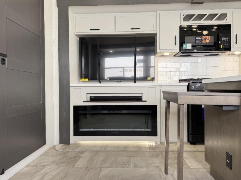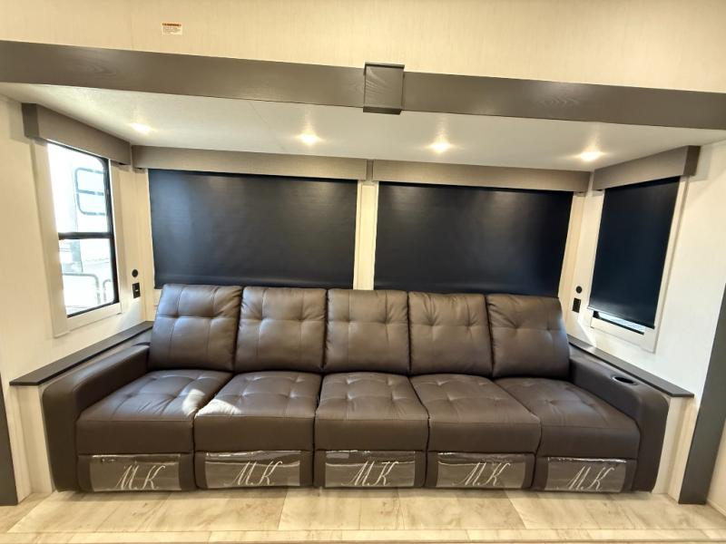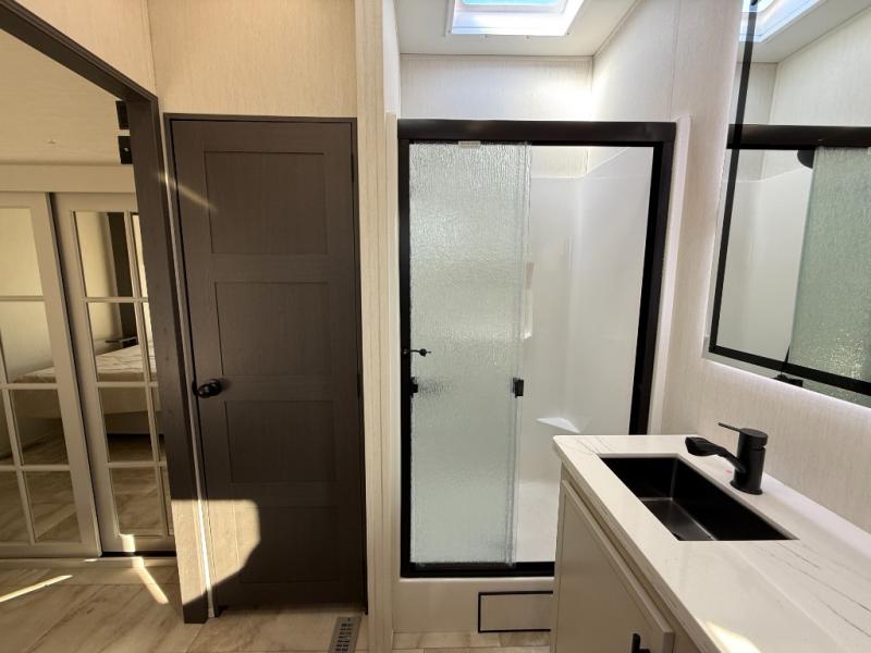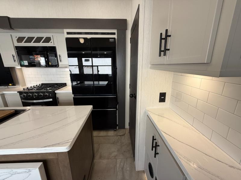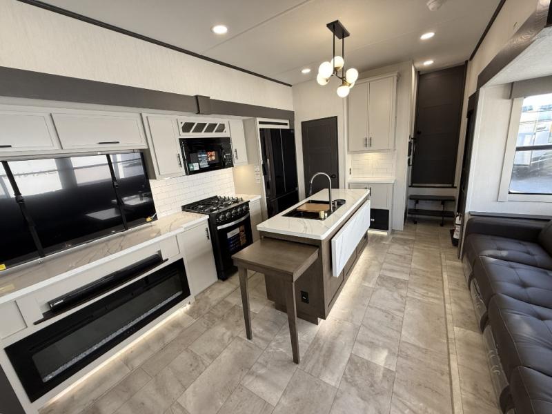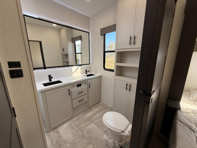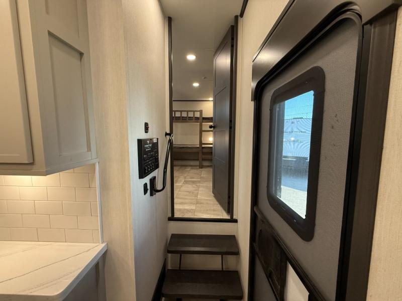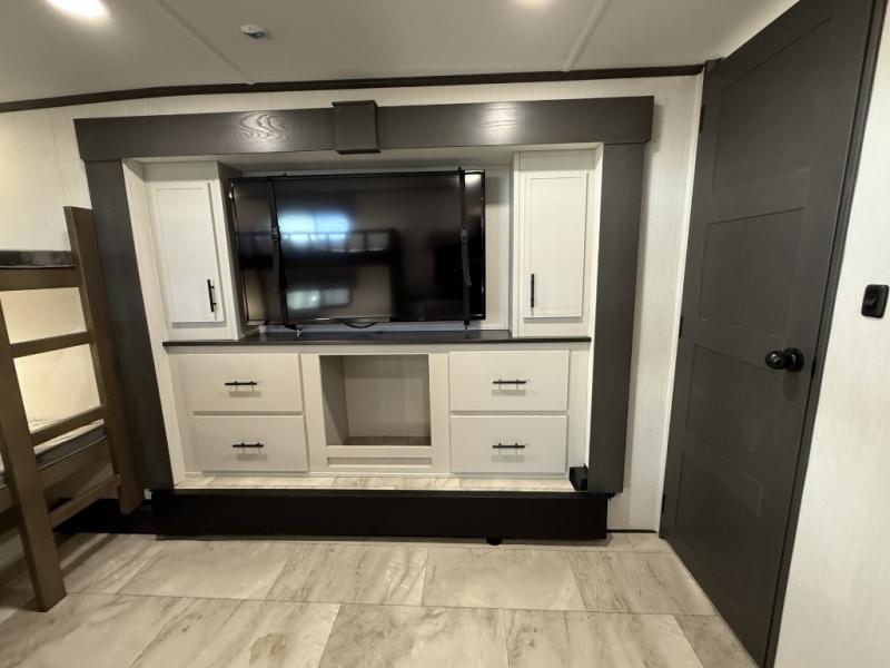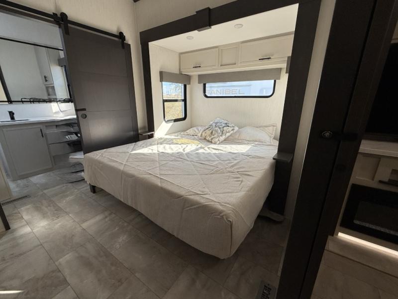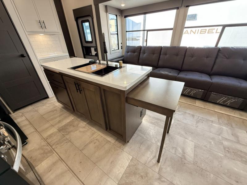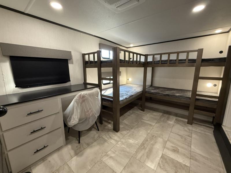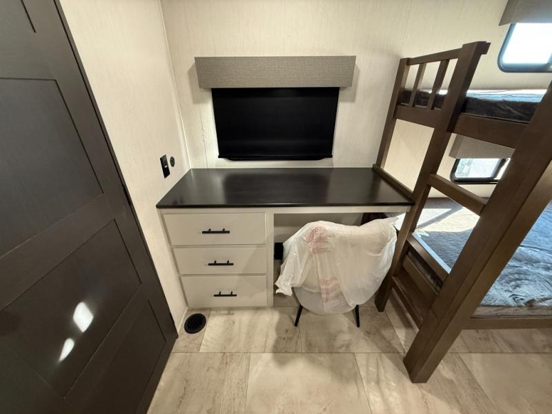This Sanibel fifth wheel is designed with functionality, starting with the spacious front bunkroom that can sleep up to four on residential-style bunks, perfect for bringing along family or friends. A built-in desk adds versatility, offering a space for work, study, or play, and the attached half bathroom ensures convenience without needing to walk through the entire RV. The middle living area is great for gathering, featuring a five-piece sectional recliner for relaxing, an expandable dinette to seat everyone comfortably, and a fully equipped kitchen that gives the chef all the tools to prepare almost anything they want. At the rear, the private bedroom offers a king-sized bed for ultimate comfort, which leads into a spacious full bathroom complete with a dual vanity, bringing functionality and luxury on the road.