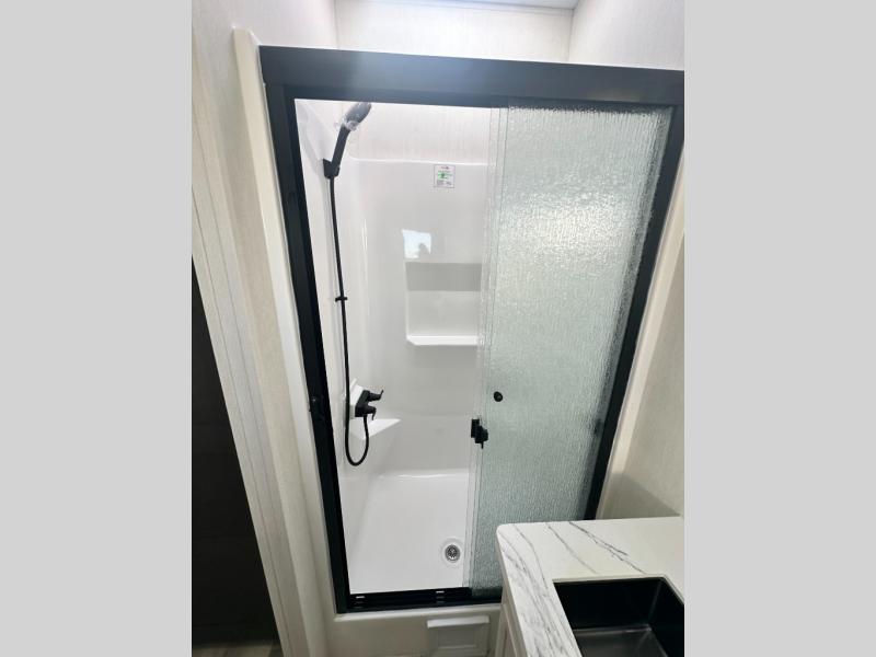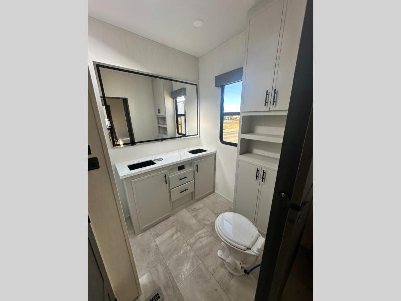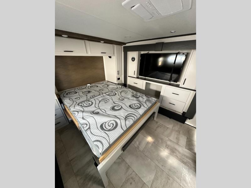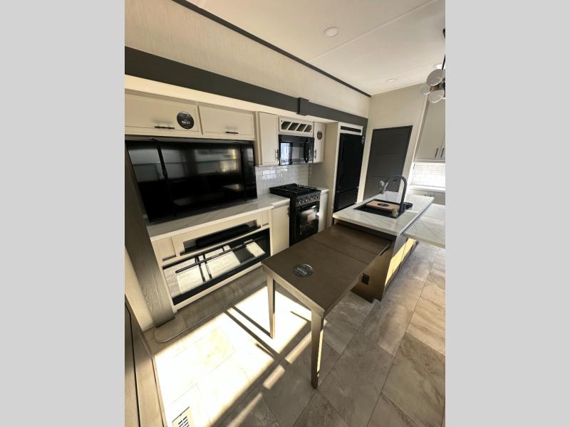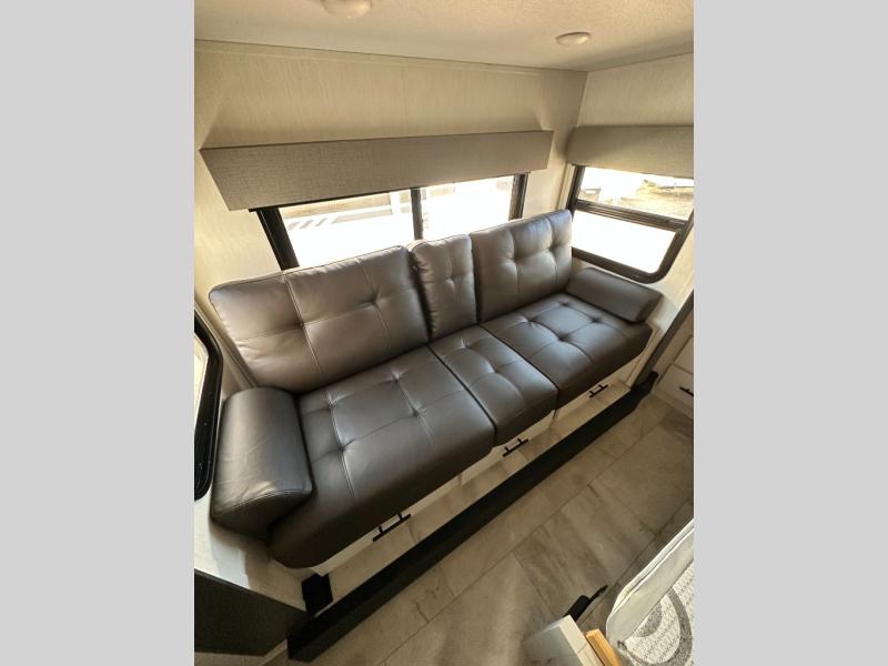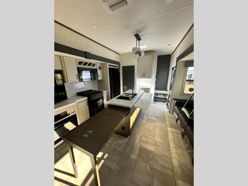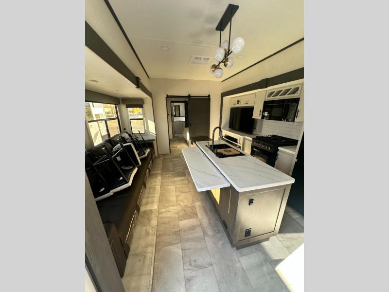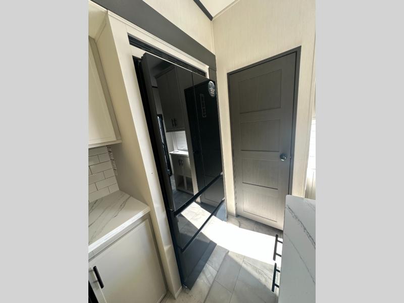 This fifth wheel offers a highly versatile layout designed to adapt to your lifestyle. The front bedroom is a flexible space featuring a sofa on a slide-out and a desk that easily converts into a Murphy bed, making it ideal as a remote office, an extra-sleeping area for guests, or even a cozy living space with a smart TV. A full bathroom is conveniently located nearby for added comfort. In the center of the trailer, you'll find a spacious living area with a five-piece sectional recliner and an expandable dinette to accommodate everyone. The well-equipped kitchen includes essentials like a four-burner range and a French door refrigerator, perfect for cooking up your favorite meals. At the rear, the master bedroom offers a relaxing retreat with a king-sized bed and direct access to a full bathroom featuring a dual vanity, bringing the comforts of home wherever you go.