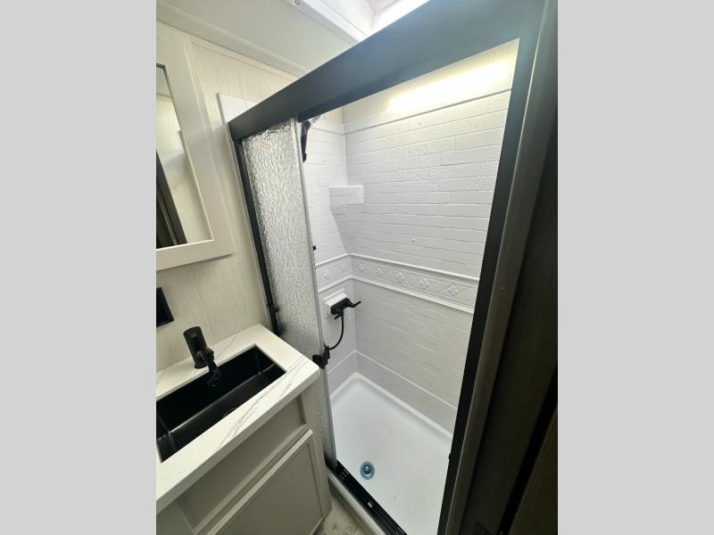 The Sanibel series stands out with a combination of unique and highly functional exterior and interior features designed for both convenience and durability. On the outside, a drop-frame pass-through storage area with a rubberized liner offers ample space while protecting your gear from moisture and wear. Setting up camp is effortless thanks to the one-touch auto-leveling system and rubberized suspension equalizer, which provide a smooth and stable foundation. Inside, comfort meets practicality with carpet less slides for easy cleaning and blackout roller shades for privacy and temperature control. The real wood cabinet doors and solid surface countertops add a touch of elegance, no matter where the road takes you.