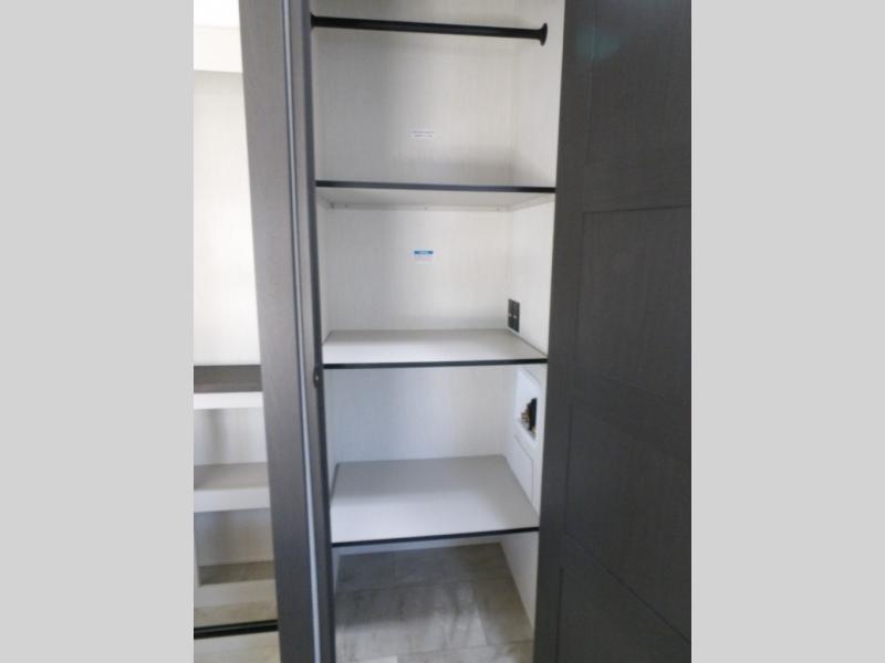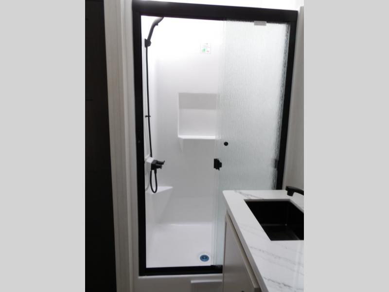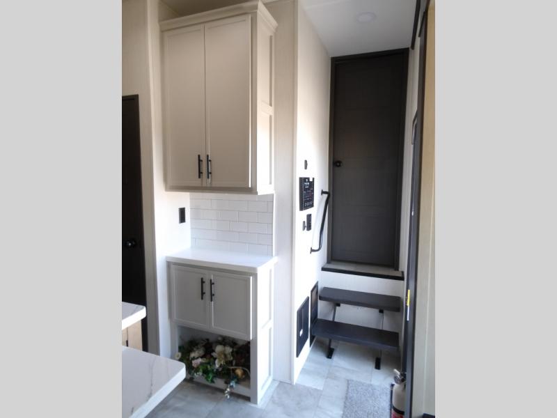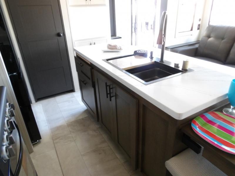 The Sanibel series stands out with a combination of unique and highly functional exterior and interior features designed for both convenience and durability. On the outside, a drop-frame pass-through storage area with a rubberized liner offers ample space while protecting your gear from moisture and wear. Setting up camp is effortless thanks to the one-touch auto-leveling system and rubberized suspension equalizer, which provide a smooth and stable foundation. Inside, comfort meets practicality with carpet less slides for easy cleaning and blackout roller shades for privacy and temperature control. The real wood cabinet doors and solid surface countertops add a touch of elegance, no matter where the road takes you.