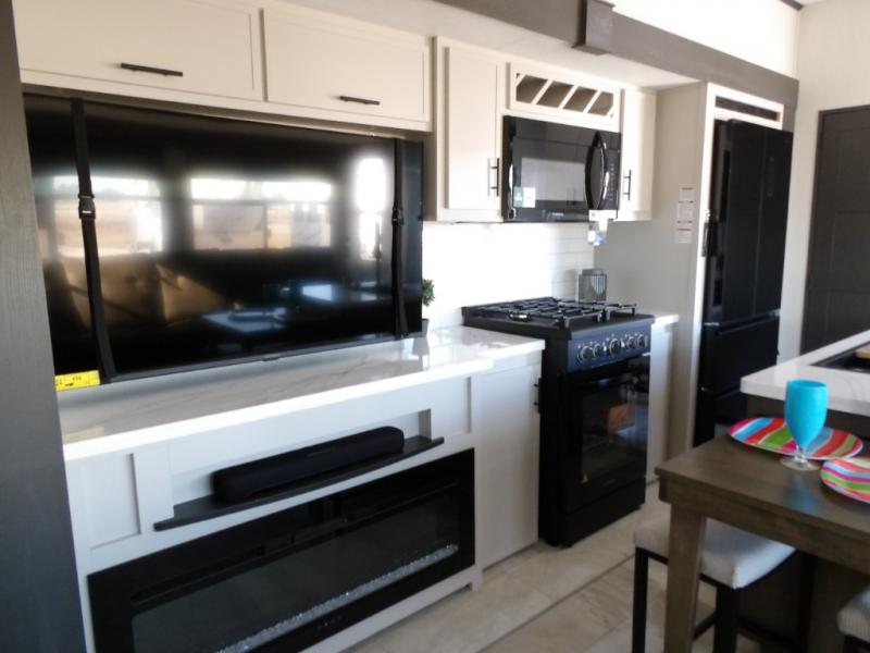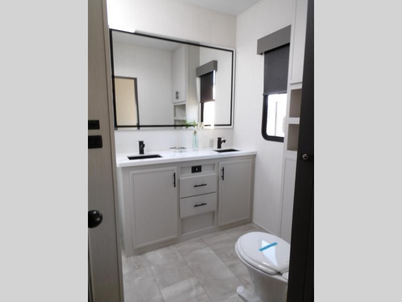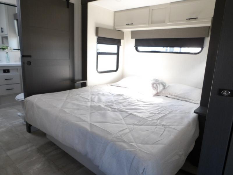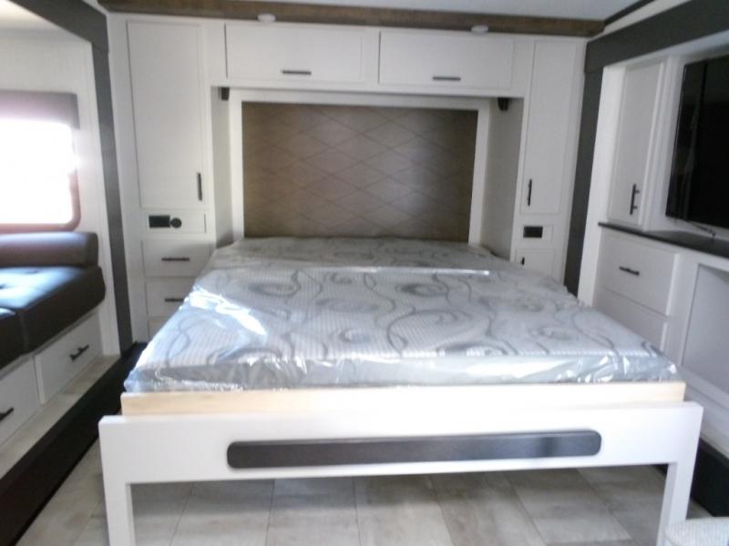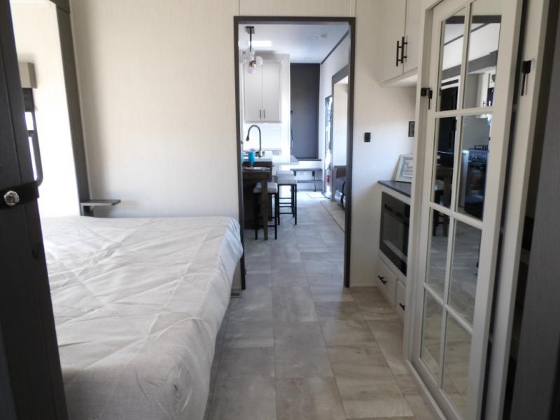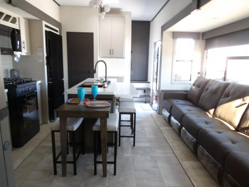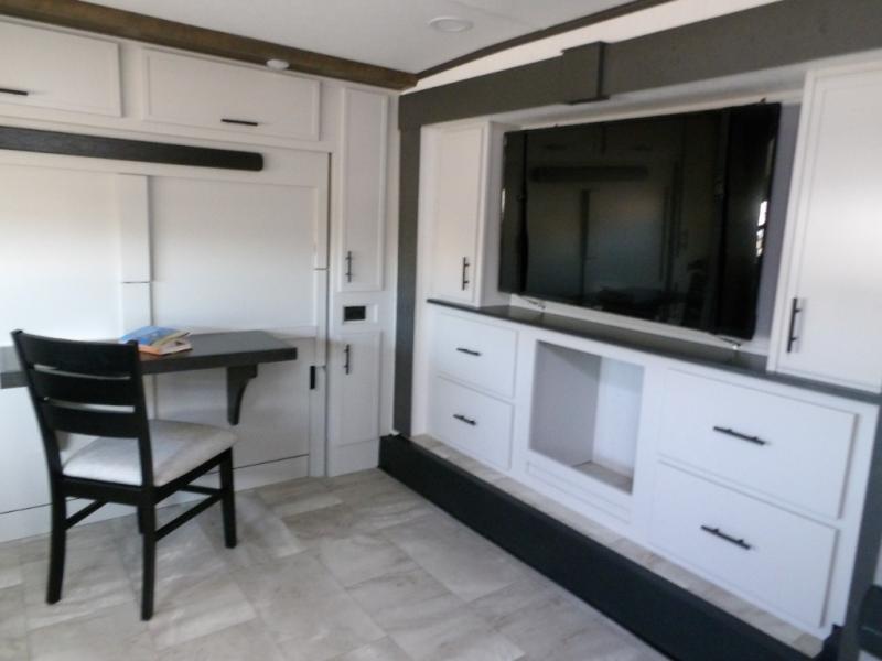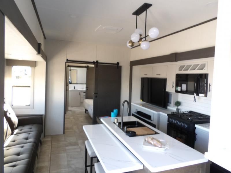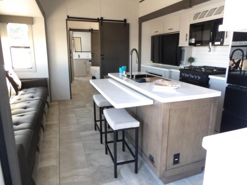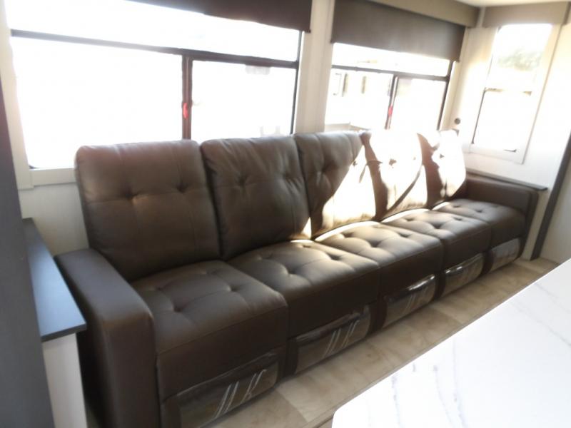 This fifth wheel offers a highly versatile layout designed to adapt to your lifestyle. The front bedroom is a flexible space featuring a sofa on a slide-out and a desk that easily converts into a Murphy bed, making it ideal as a remote office, an extra-sleeping area for guests, or even a cozy living space with a smart TV. A full bathroom is conveniently located nearby for added comfort. In the center of the trailer, you'll find a spacious living area with a five-piece sectional recliner and an expandable dinette to accommodate everyone. The well-equipped kitchen includes essentials like a four-burner range and a French door refrigerator, perfect for cooking up your favorite meals. At the rear, the master bedroom offers a relaxing retreat with a king-sized bed and direct access to a full bathroom featuring a dual vanity, bringing the comforts of home wherever you go.