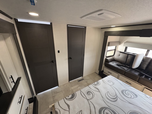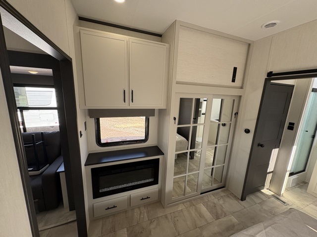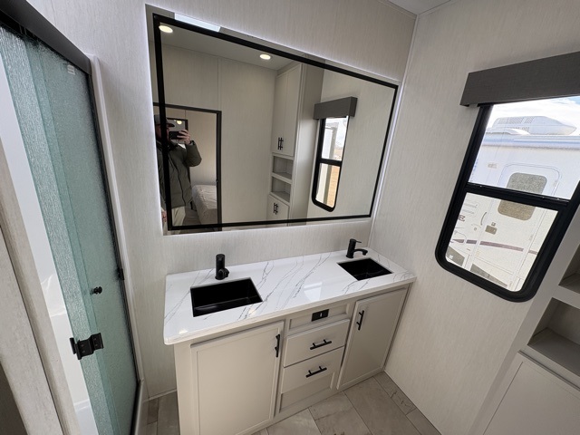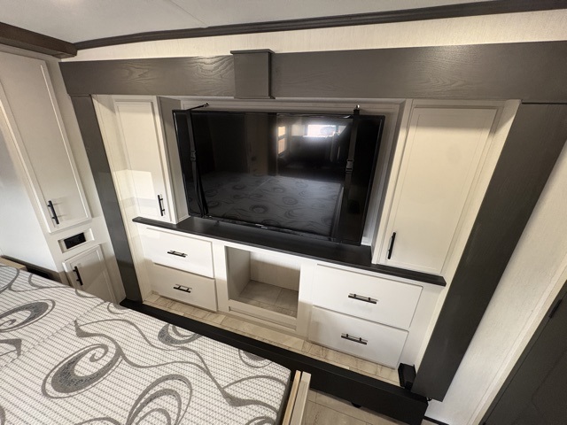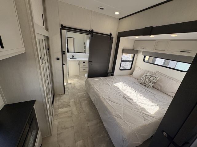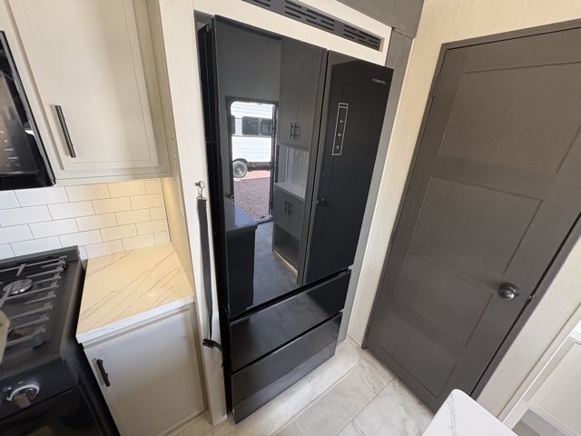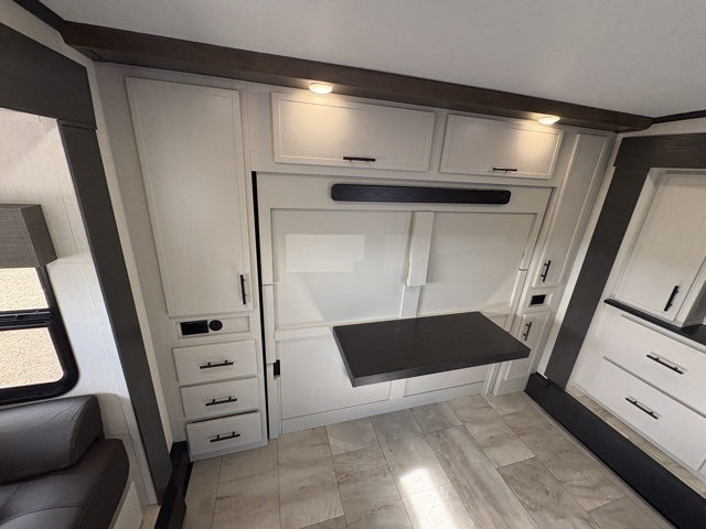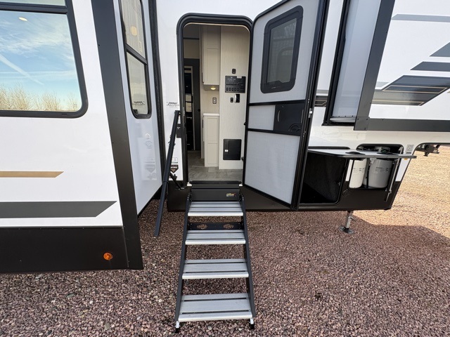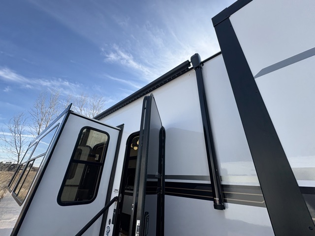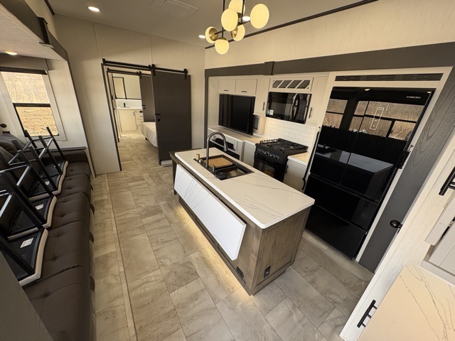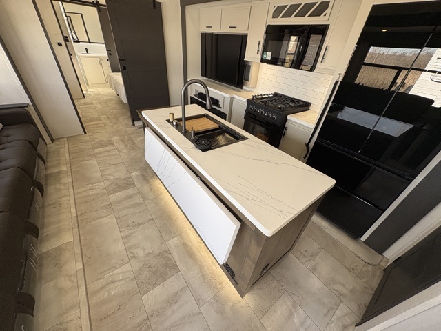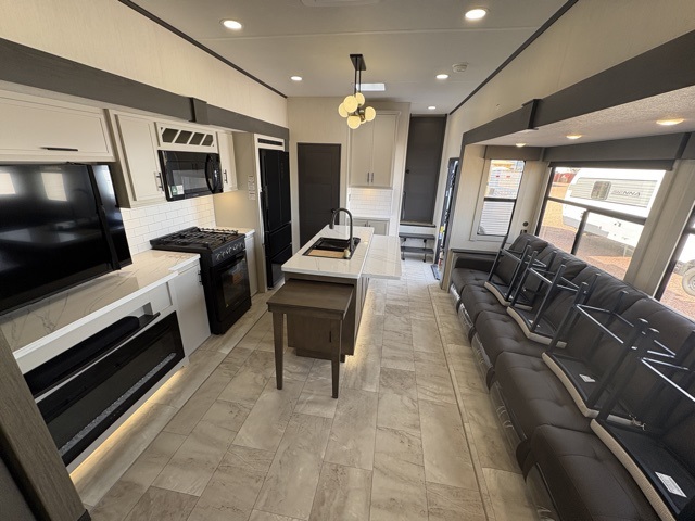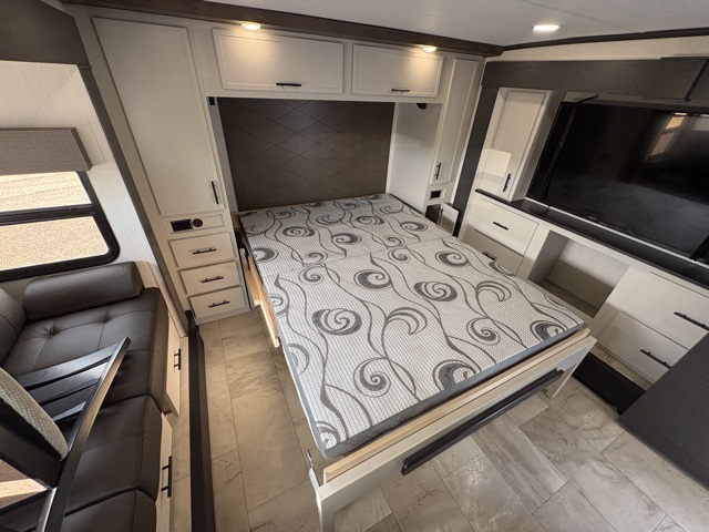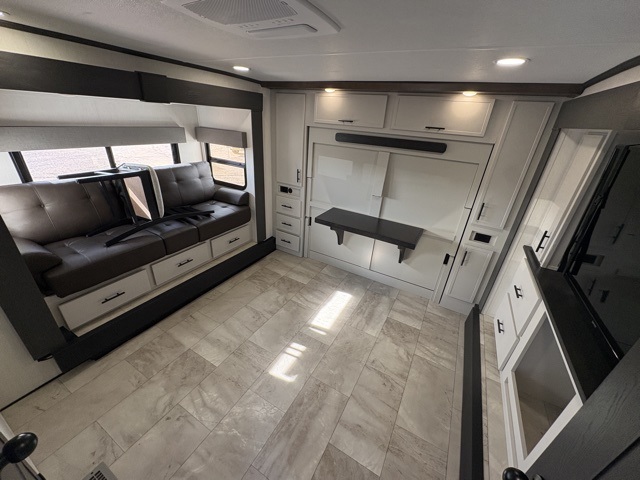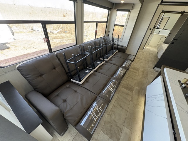 This fifth wheel offers a highly versatile layout designed to adapt to your lifestyle. The front bedroom is a flexible space featuring a sofa on a slide-out and a desk that easily converts into a Murphy bed, making it ideal as a remote office, an extra-sleeping area for guests, or even a cozy living space with a smart TV. A full bathroom is conveniently located nearby for added comfort. In the center of the trailer, you'll find a spacious living area with a five-piece sectional recliner and an expandable dinette to accommodate everyone. The well-equipped kitchen includes essentials like a four-burner range and a French door refrigerator, perfect for cooking up your favorite meals. At the rear, the master bedroom offers a relaxing retreat with a king-sized bed and direct access to a full bathroom featuring a dual vanity, bringing the comforts of home wherever you go.