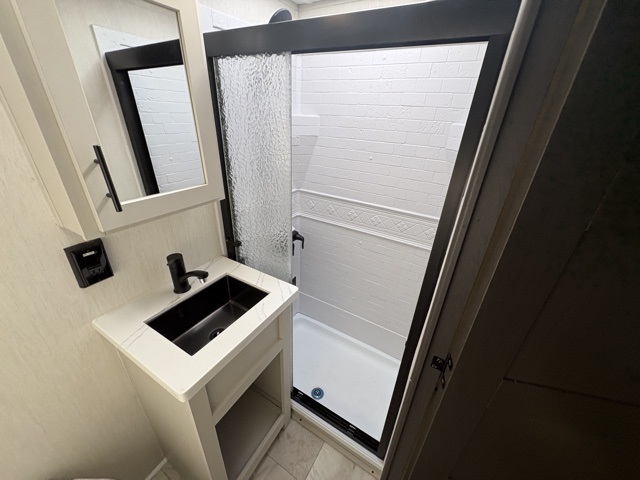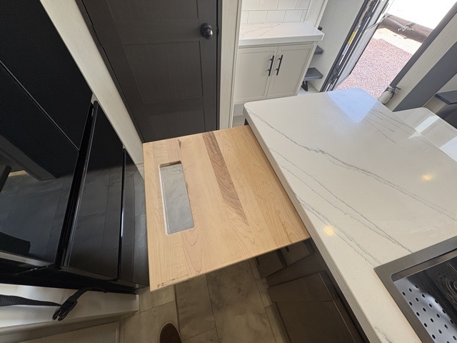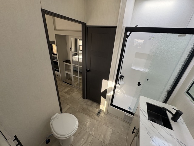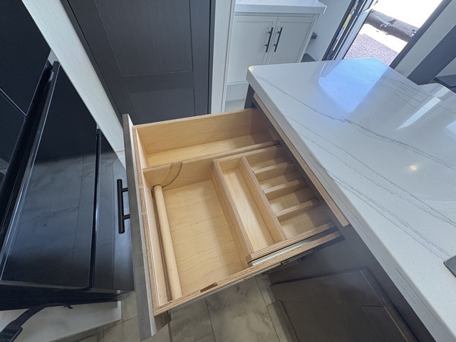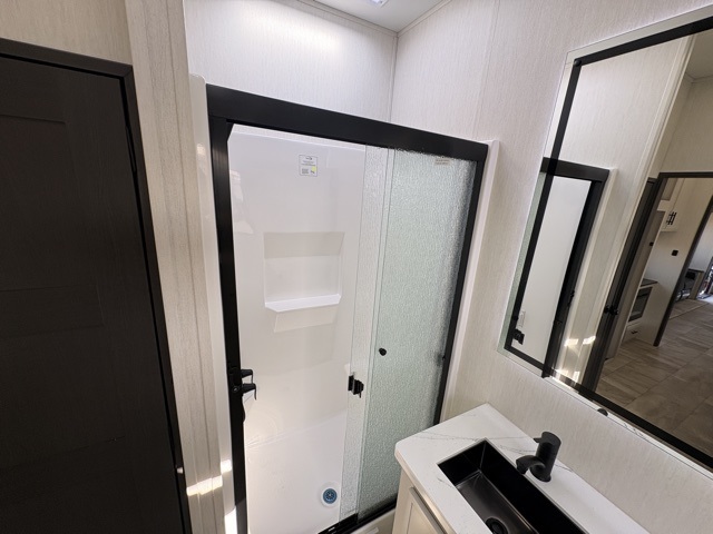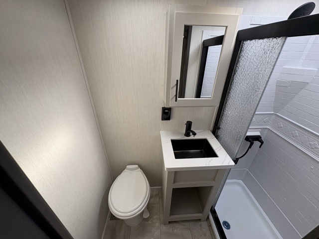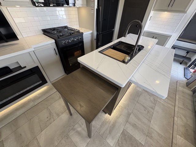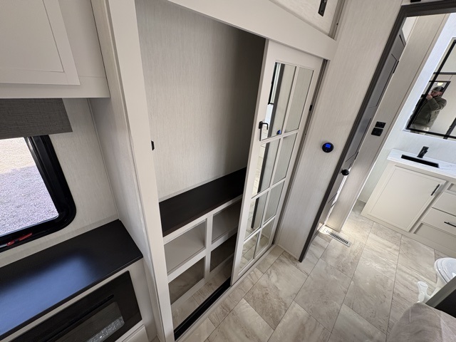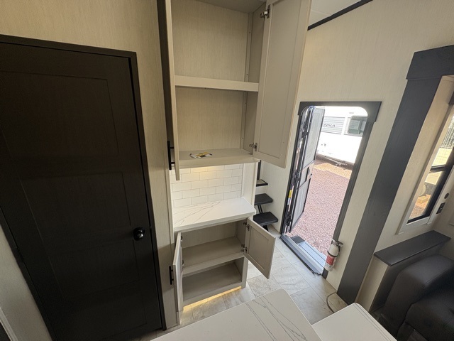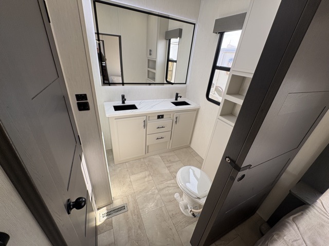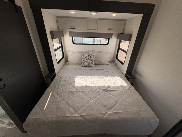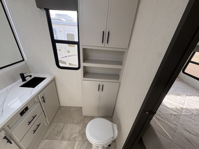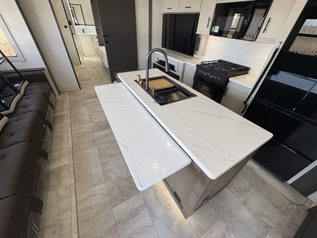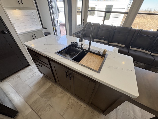 The Sanibel series stands out with a combination of unique and highly functional exterior and interior features designed for both convenience and durability. On the outside, a drop-frame pass-through storage area with a rubberized liner offers ample space while protecting your gear from moisture and wear. Setting up camp is effortless thanks to the one-touch auto-leveling system and rubberized suspension equalizer, which provide a smooth and stable foundation. Inside, comfort meets practicality with carpet less slides for easy cleaning and blackout roller shades for privacy and temperature control. The real wood cabinet doors and solid surface countertops add a touch of elegance, no matter where the road takes you.