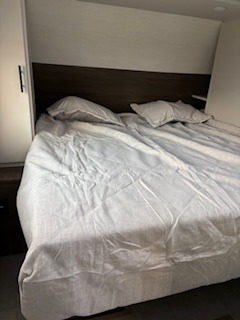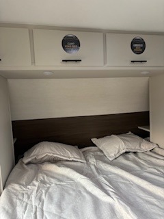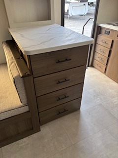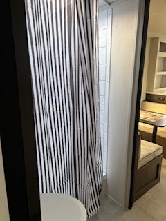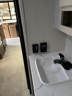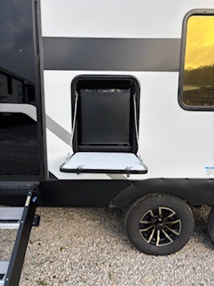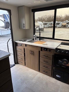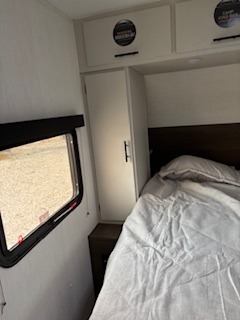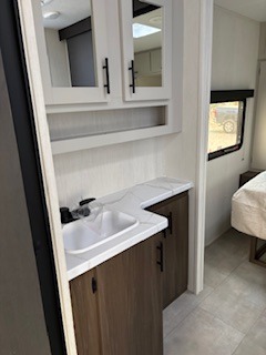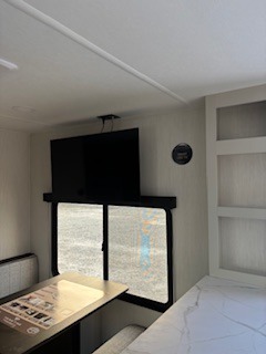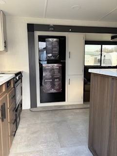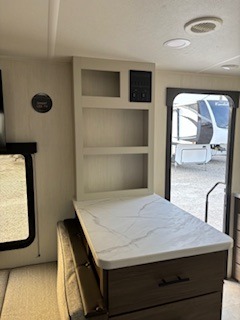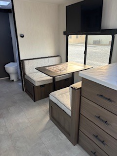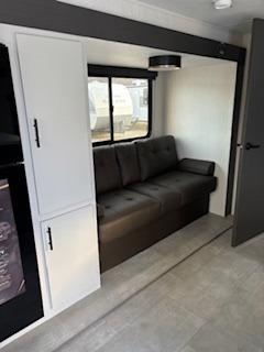This travel trailer's modern rear kitchen is equipped with a reliable fridge, well-stocked pantry, and stylish hutch, making meal prep and storage a snap. The versatile jackknife sofa provides additional sleeping space or a cozy spot to unwind, while the intimate booth dinette is perfect for sharing meals or stories with loved ones. The crisp high-definition smart TV is ideal for entertainment on the go, and the practical walk-thru bathroom provides easy access. The serene front bedroom is a peaceful retreat, featuring a comfortable king bed, functional linen closet, spacious wardrobes, and ample overhead cabinets for storing your essentials. One of the standout features of this trailer is the two entry/exit doors, providing added convenience and flexibility.