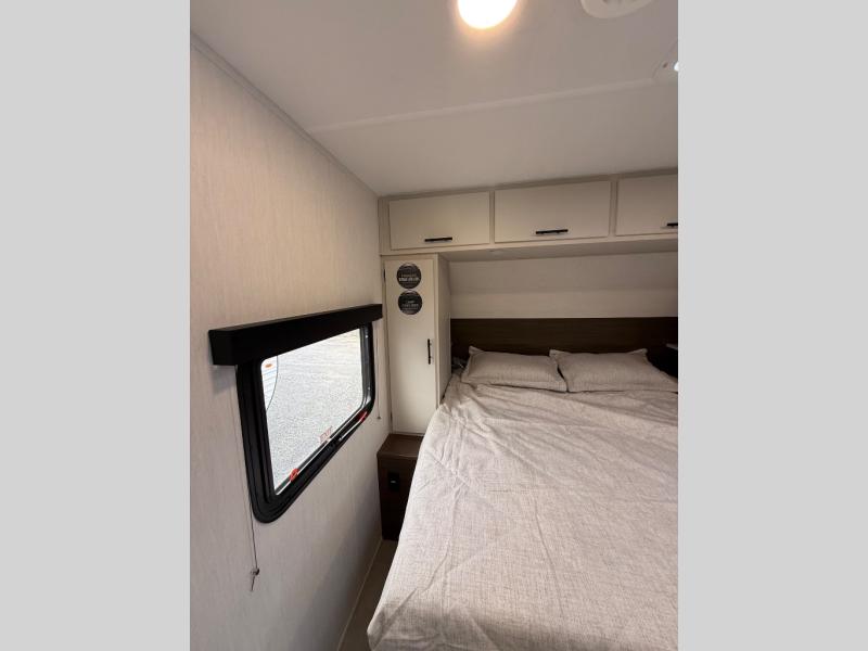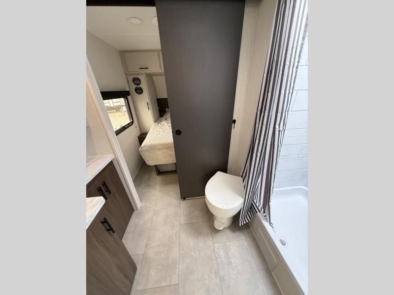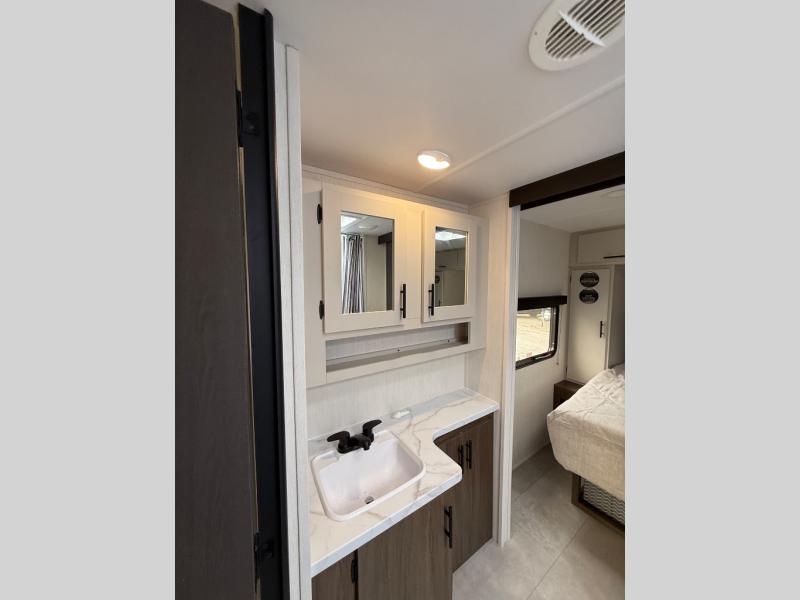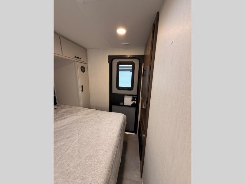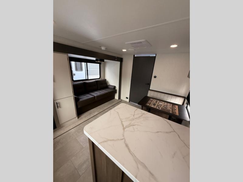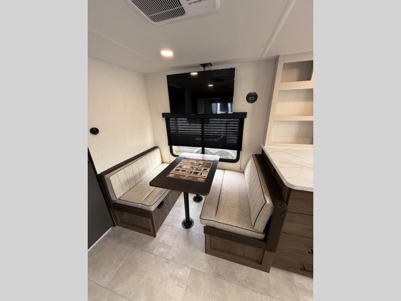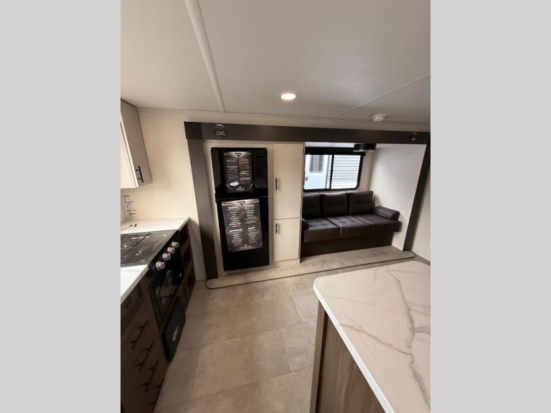 This travel trailer's modern rear kitchen is equipped with a reliable fridge, well-stocked pantry, and stylish hutch, making meal prep and storage a snap. The versatile jackknife sofa provides additional sleeping space or a cozy spot to unwind, while the intimate booth dinette is perfect for sharing meals or stories with loved ones. The crisp high-definition smart TV is ideal for entertainment on the go, and the practical walk-thru bathroom provides easy access. The serene front bedroom is a peaceful retreat, featuring a comfortable king bed, functional linen closet, spacious wardrobes, and ample overhead cabinets for storing your essentials. One of the standout features of this trailer is the two entry/exit doors, providing added convenience and flexibility.