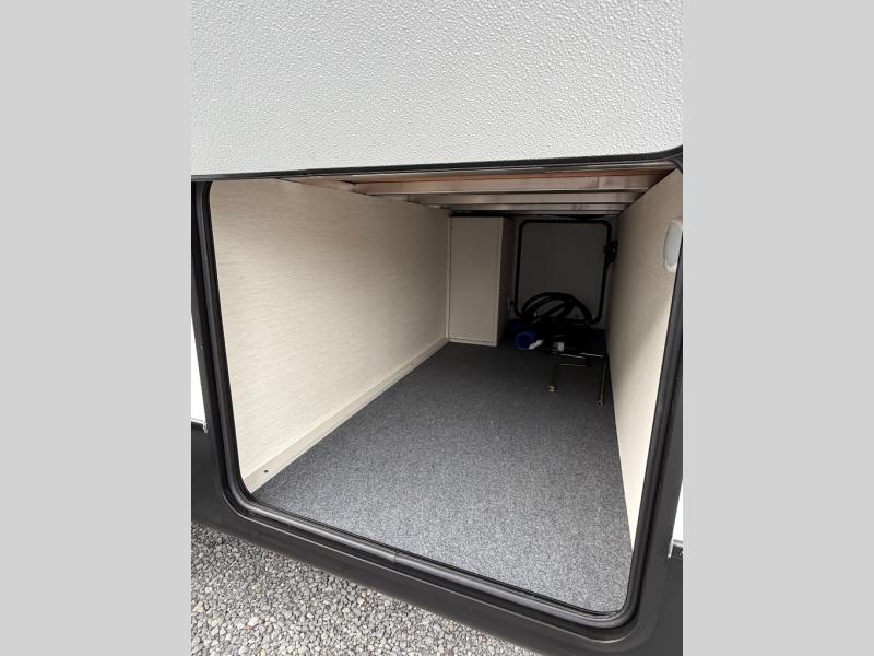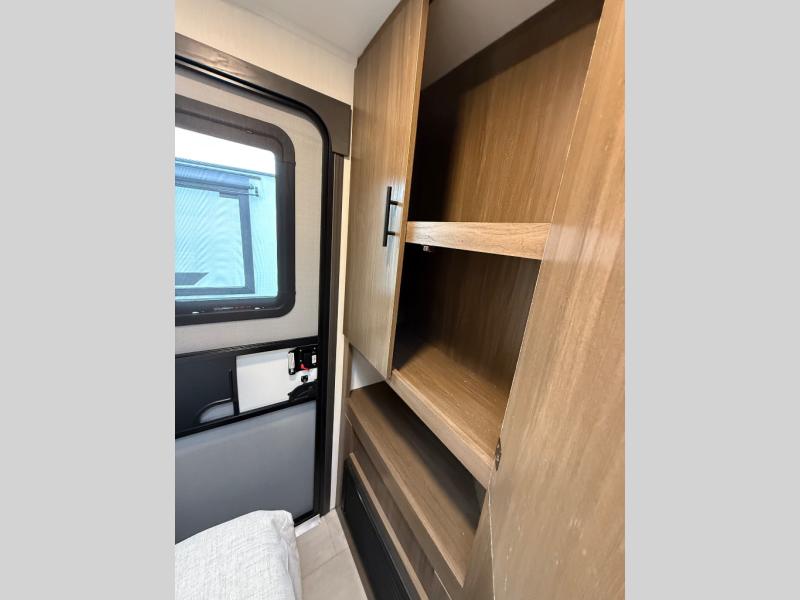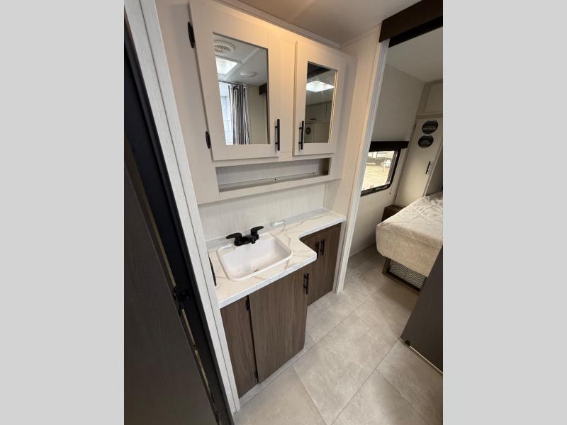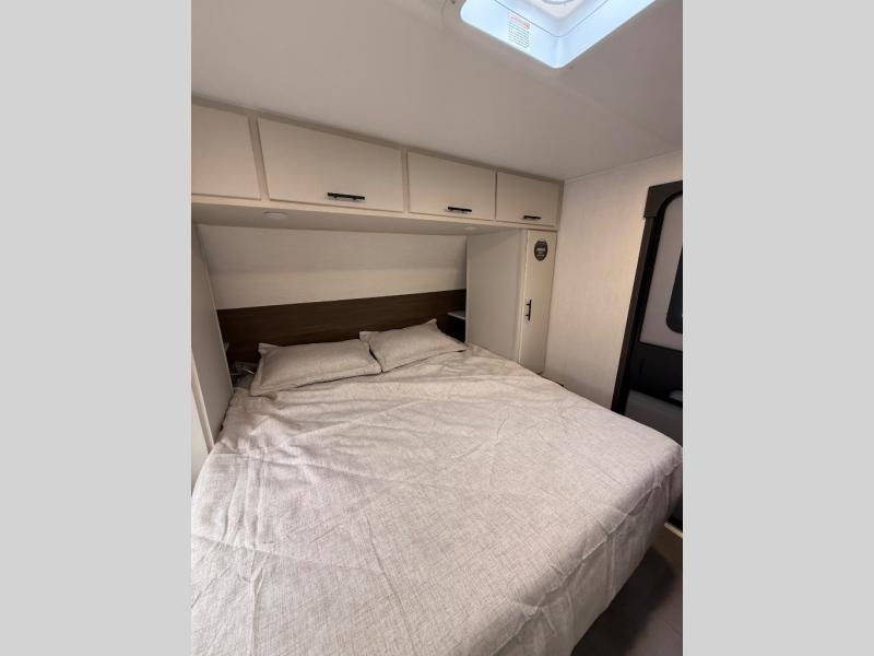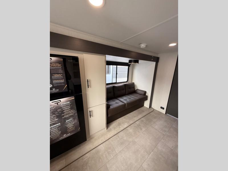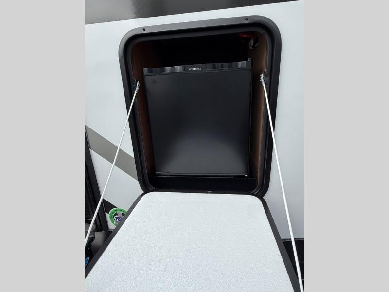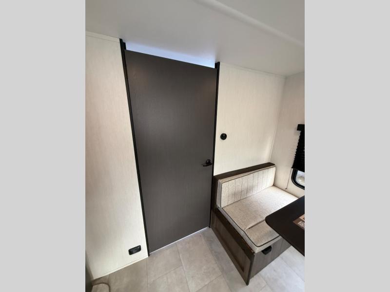This travel trailer's modern rear kitchen is equipped with a reliable fridge, well-stocked pantry, and stylish hutch, making meal prep and storage a snap. The versatile jackknife sofa provides additional sleeping space or a cozy spot to unwind, while the intimate booth dinette is perfect for sharing meals or stories with loved ones. The crisp high-definition smart TV is ideal for entertainment on the go, and the practical walk-thru bathroom provides easy access. The serene front bedroom is a peaceful retreat, featuring a comfortable king bed, functional linen closet, spacious wardrobes, and ample overhead cabinets for storing your essentials. One of the standout features of this trailer is the two entry/exit doors, providing added convenience and flexibility.