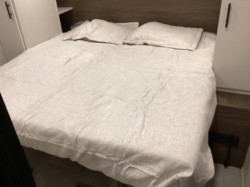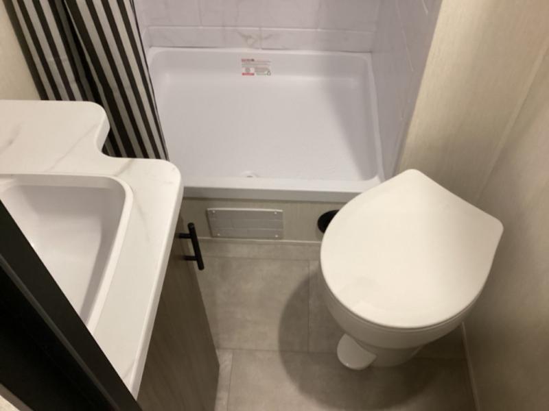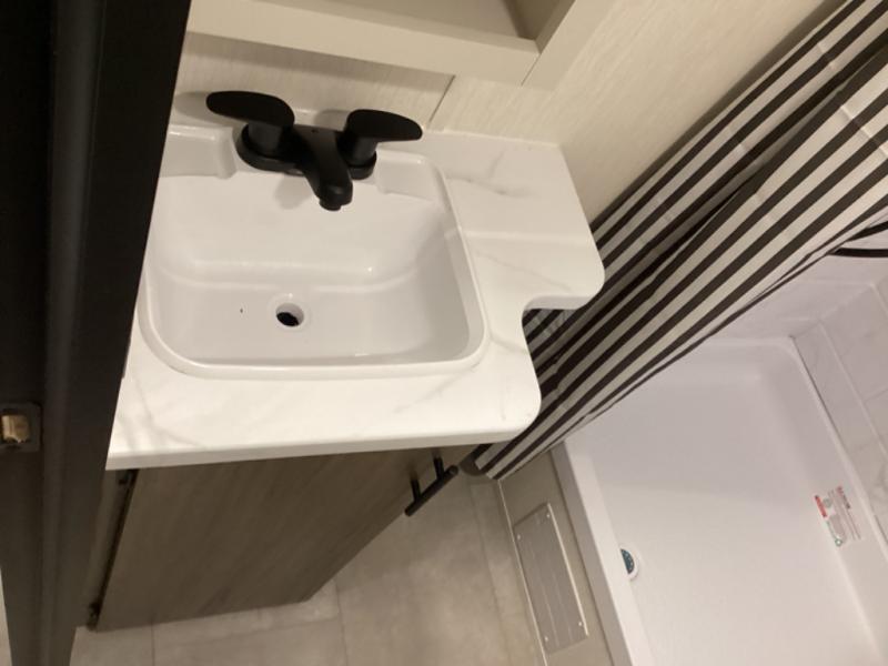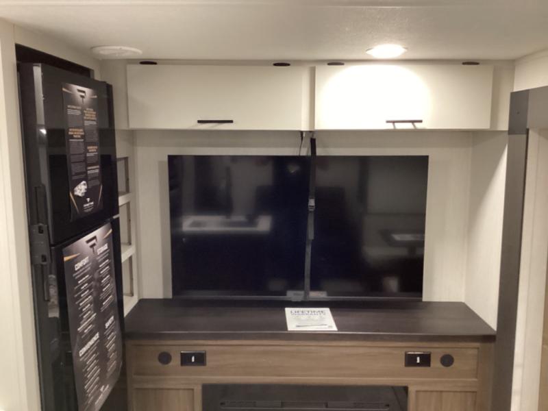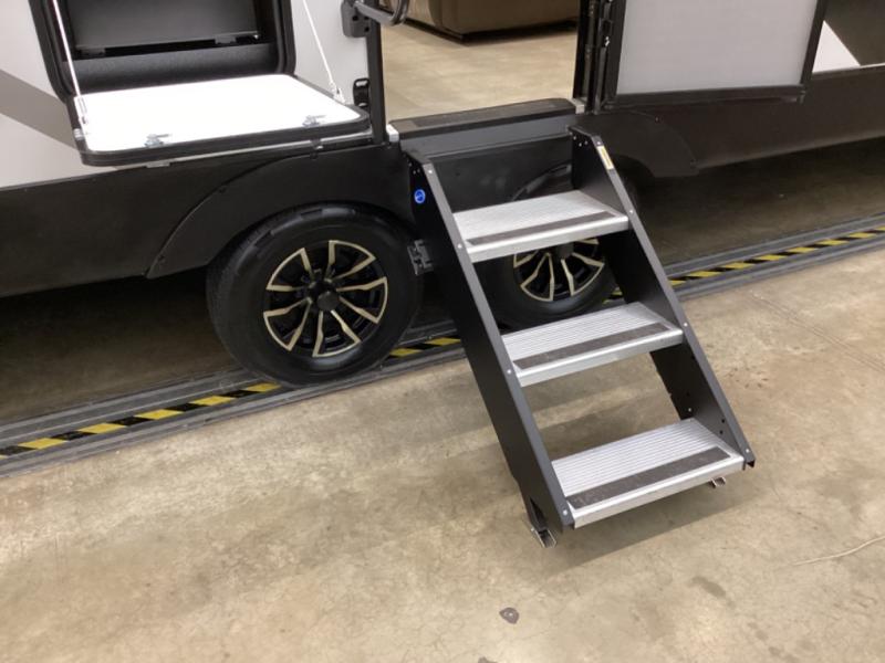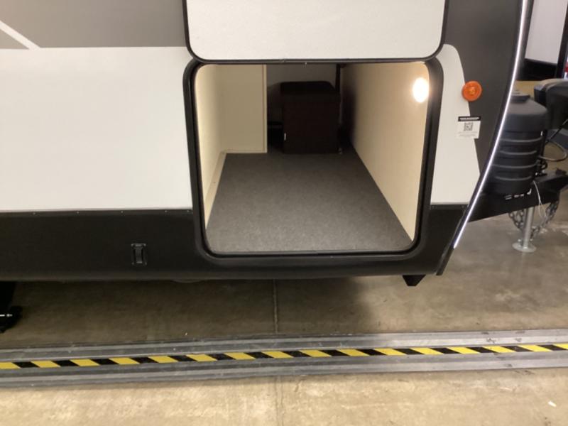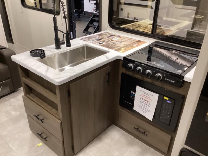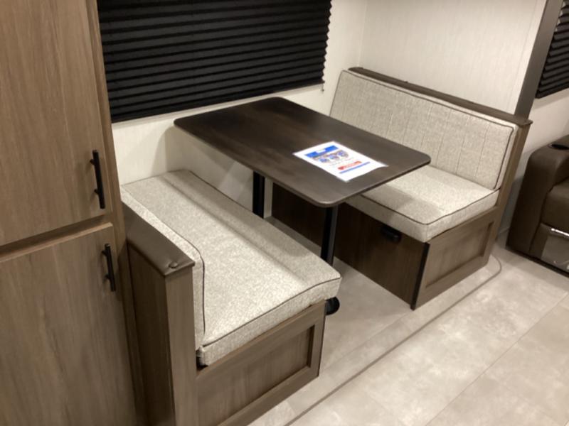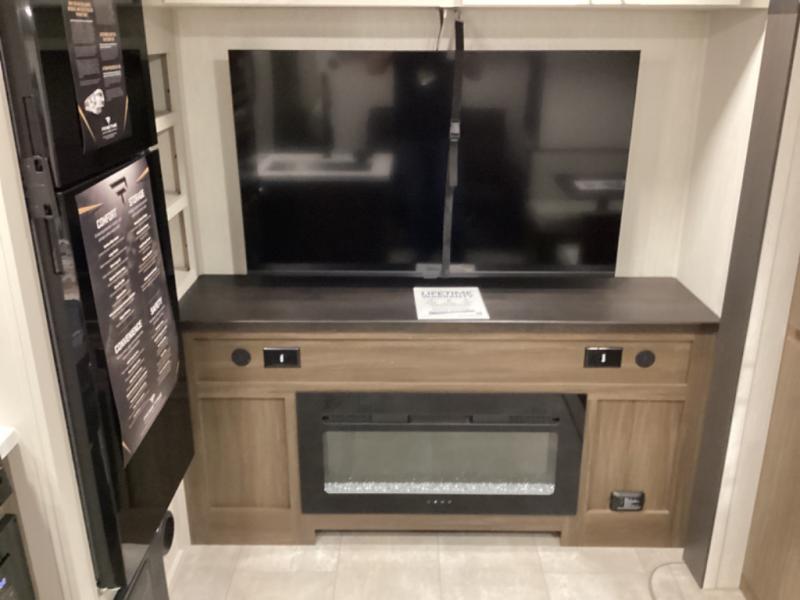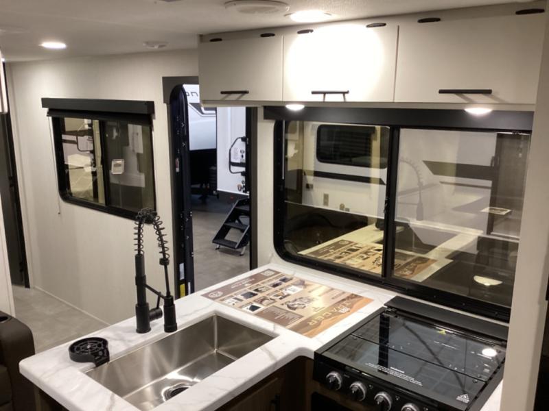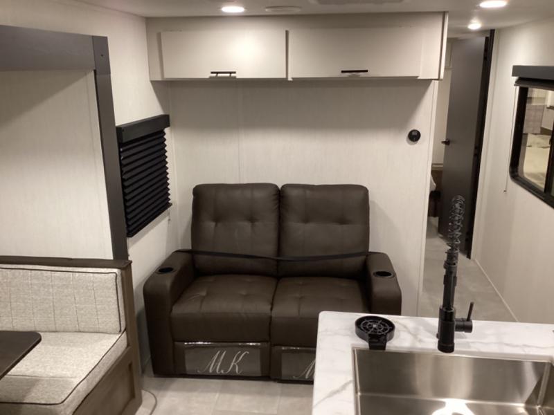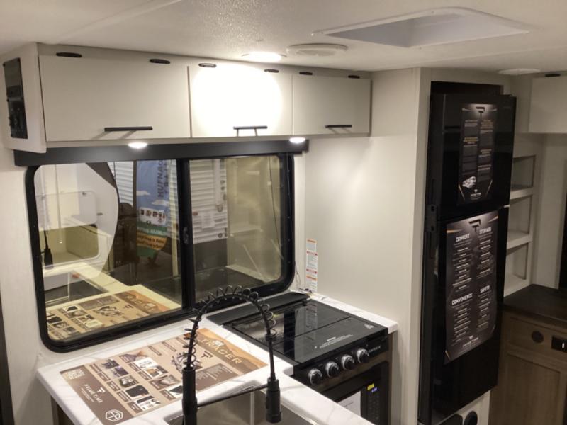 This travel trailer's modern rear kitchen is equipped with a reliable fridge, well-stocked pantry, and even a fireplace, making meal prep and cooking a great experience. The theater seating offers a cozy spot to unwind, while the dinette is perfect for sharing meals or stories with loved ones. The air fryer cooktop will also be useful for some easy delicious meals on the go, and the practical full bathroom to freshen up. The serene front bedroom is a peaceful retreat, featuring a comfortable camp king bed, spacious wardrobes, and ample overhead cabinets for storing your essentials.
