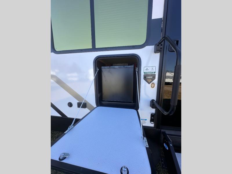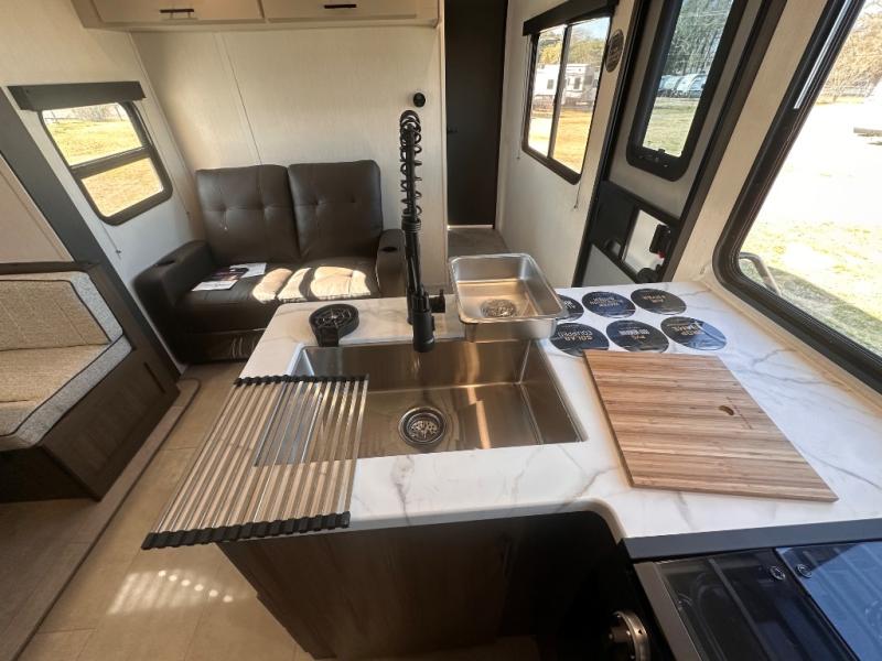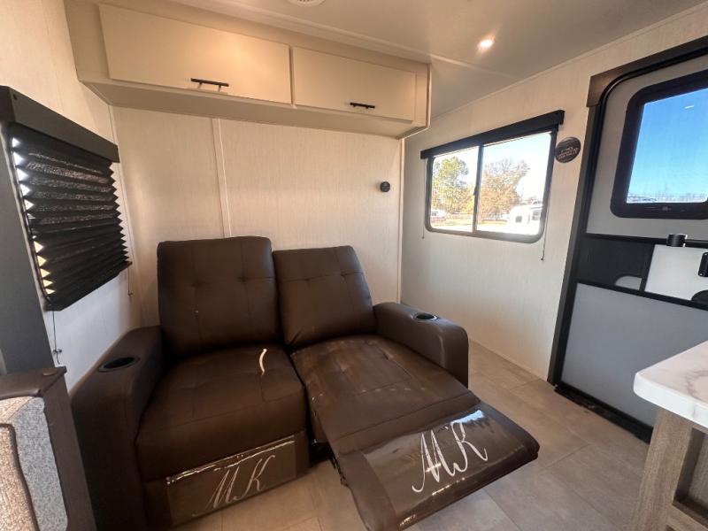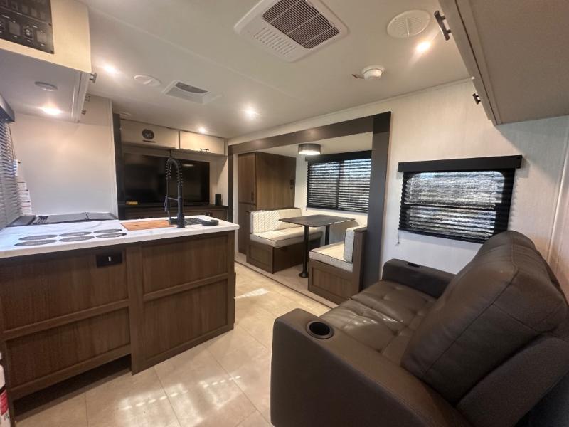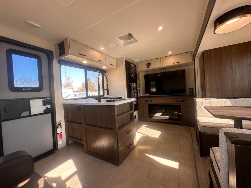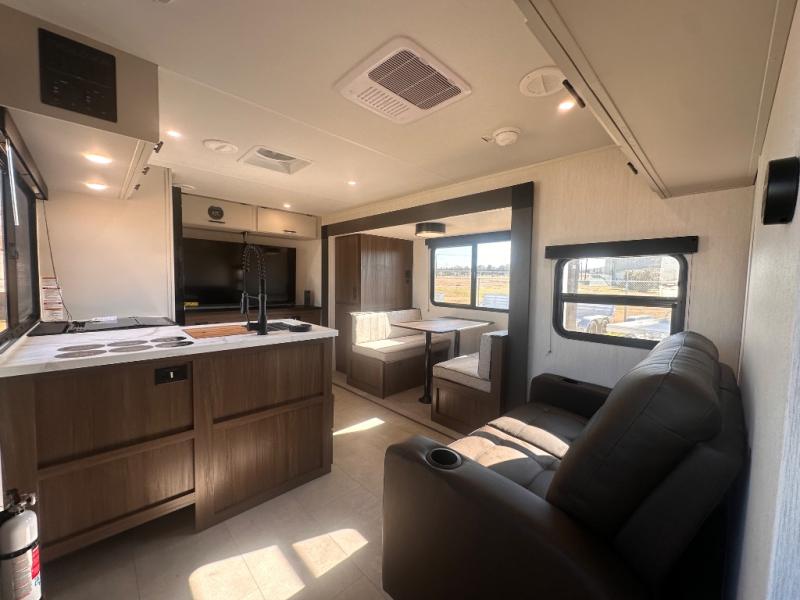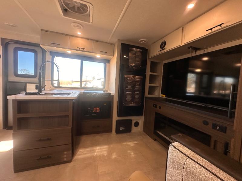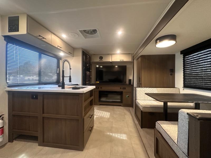 This travel trailer's modern rear kitchen is equipped with a reliable fridge, well-stocked pantry, and even a fireplace, making meal prep and cooking a great experience. The theater seating offers a cozy spot to unwind, while the dinette is perfect for sharing meals or stories with loved ones. The air fryer cooktop will also be useful for some easy delicious meals on the go, and the practical full bathroom to freshen up. The serene front bedroom is a peaceful retreat, featuring a comfortable camp king bed, spacious wardrobes, and ample overhead cabinets for storing your essentials.