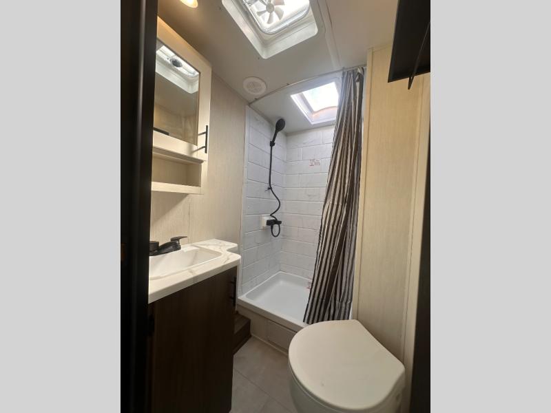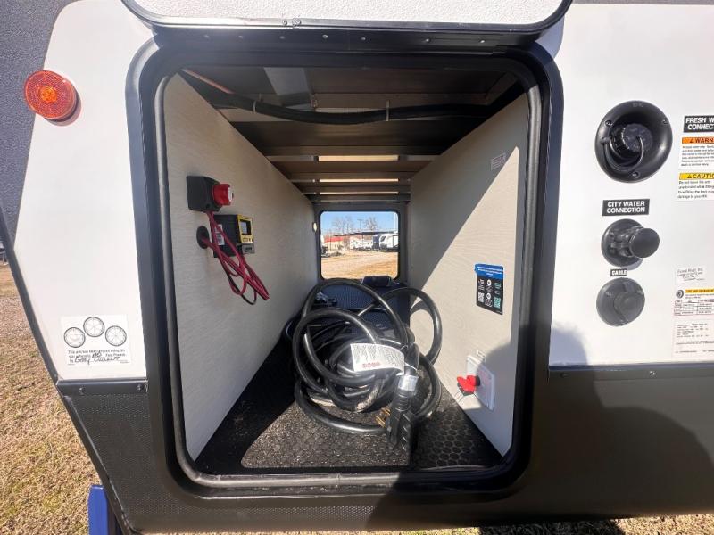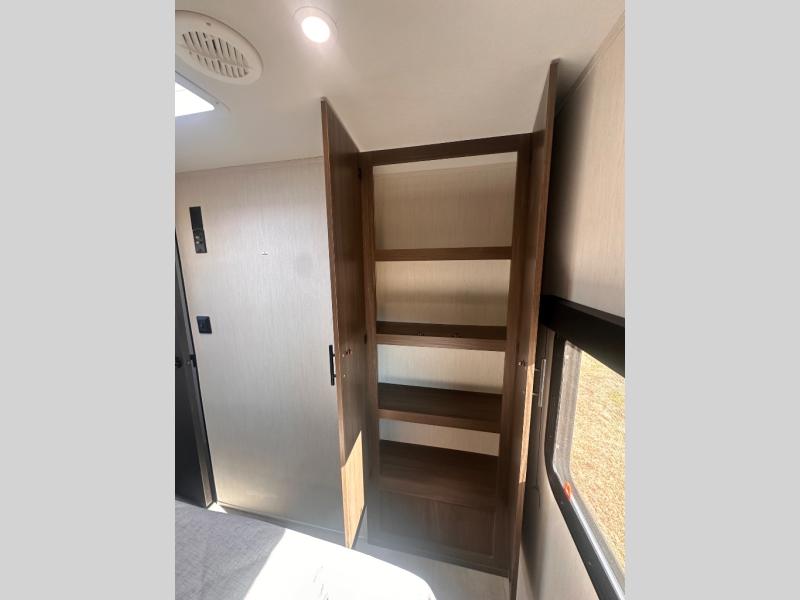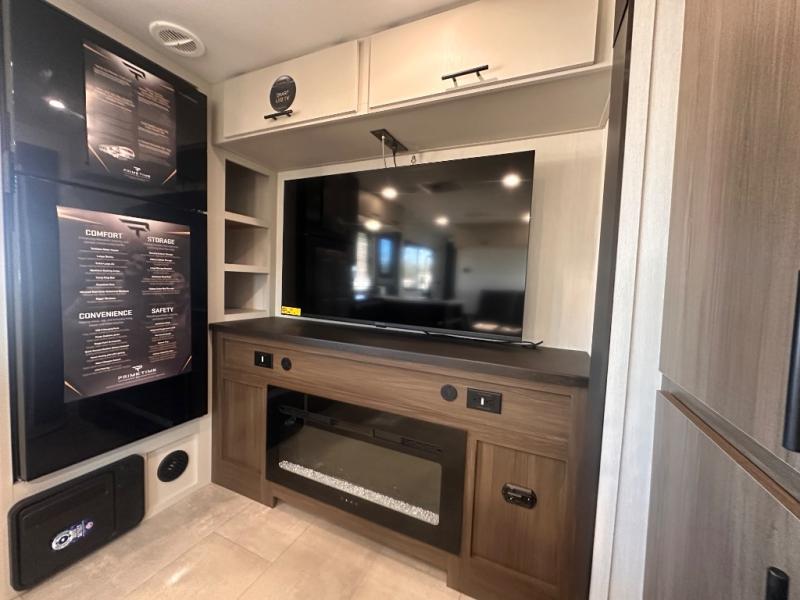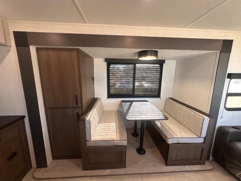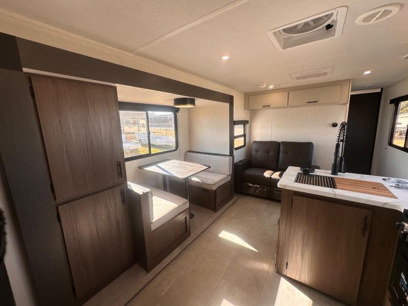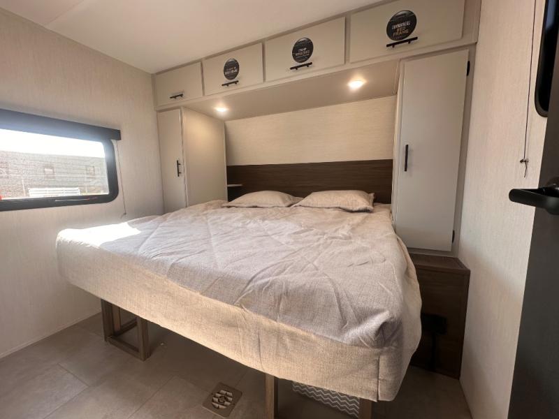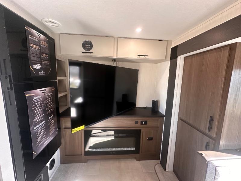 This travel trailer's modern rear kitchen is equipped with a reliable fridge, well-stocked pantry, and even a fireplace, making meal prep and cooking a great experience. The theater seating offers a cozy spot to unwind, while the dinette is perfect for sharing meals or stories with loved ones. The air fryer cooktop will also be useful for some easy delicious meals on the go, and the practical full bathroom to freshen up. The serene front bedroom is a peaceful retreat, featuring a comfortable camp king bed, spacious wardrobes, and ample overhead cabinets for storing your essentials.