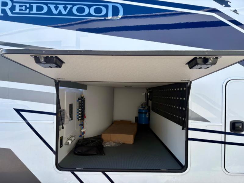You are going to wish you found the Redwood fifth wheels sooner! With all of the residential comfort and modern luxury, you will be impressed. The Williamsburg Furniture Collection includes two premium dinette chairs, a buffet-style adjustable dinette with leaf extension, a residential-style sofa, and powered theater seating. The luxury further extends to the bedroom where you will find a gel-foam king bed with tilt and C-PAP shelves on both sides of the bed. The straight roof line gives a luxury profile, and there are preparations for a wireless backup camera as well as solar power. The seamless residential insulated heat ducts will efficiently heat your unit, and there is an exterior radio in the fully finished and heated pass-through with slat board storage.
