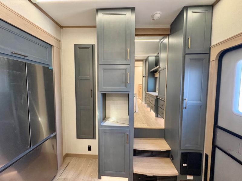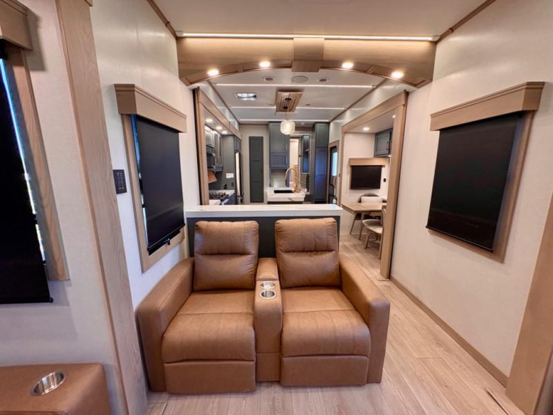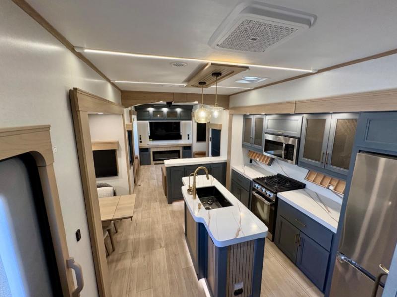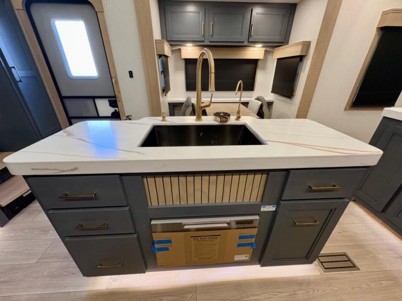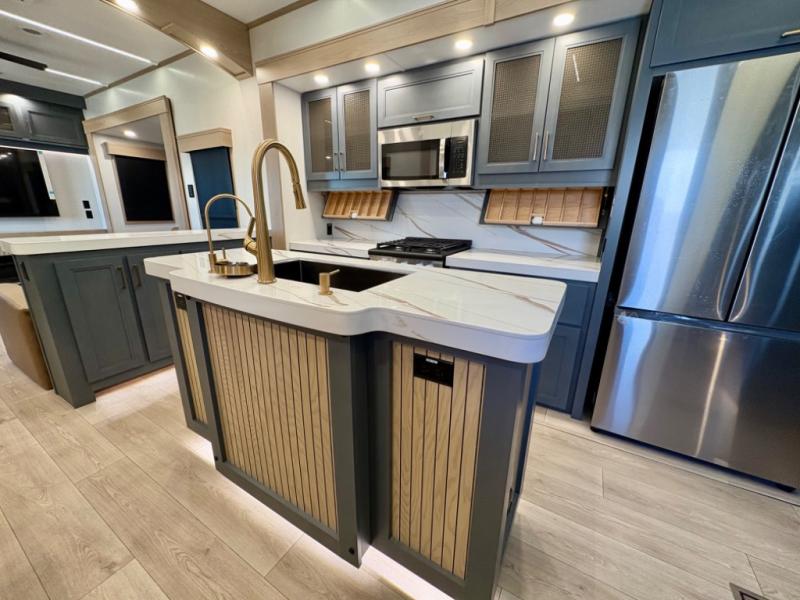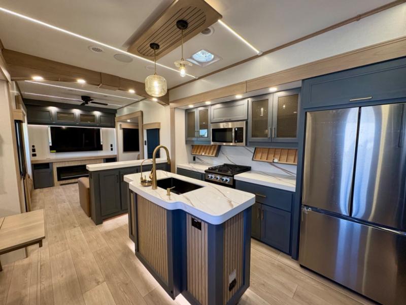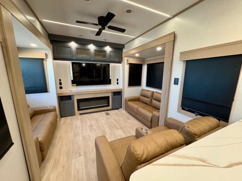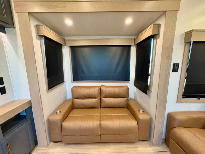 This Redwood fifth wheel is going to make you say wow! The rear living room is fully impressive with its 72" tri-fold sofa slides that are across from one another, its 60" theater sofa, entertainment center with 65" TV, and its ceiling fan. All in all, it will feel like you're lounging back at home. The kitchen is also completely decked out with opposing slides, a pull-out waste basket at the large island, two buffets, a pantry, and a message center, and just a few steps away from the kitchen is where you will find the luxurious master suite. This space has a full bathroom up at the front where you will find a huge walk-in closet, and within the bedroom, the king bed slide rests across from the 39" TV so that you can watch a movie in comfort.