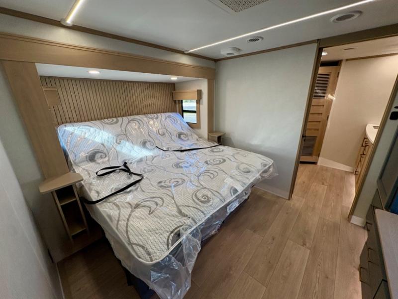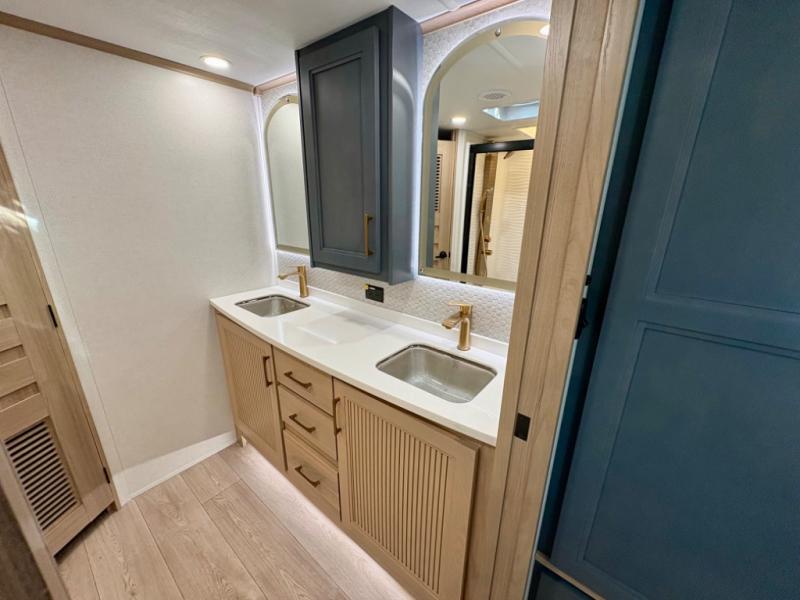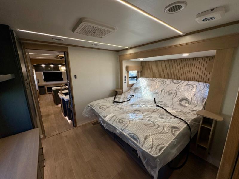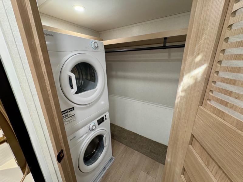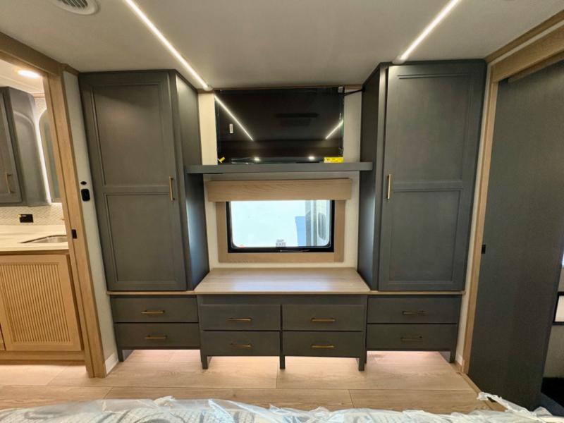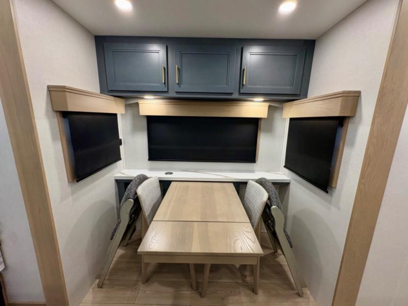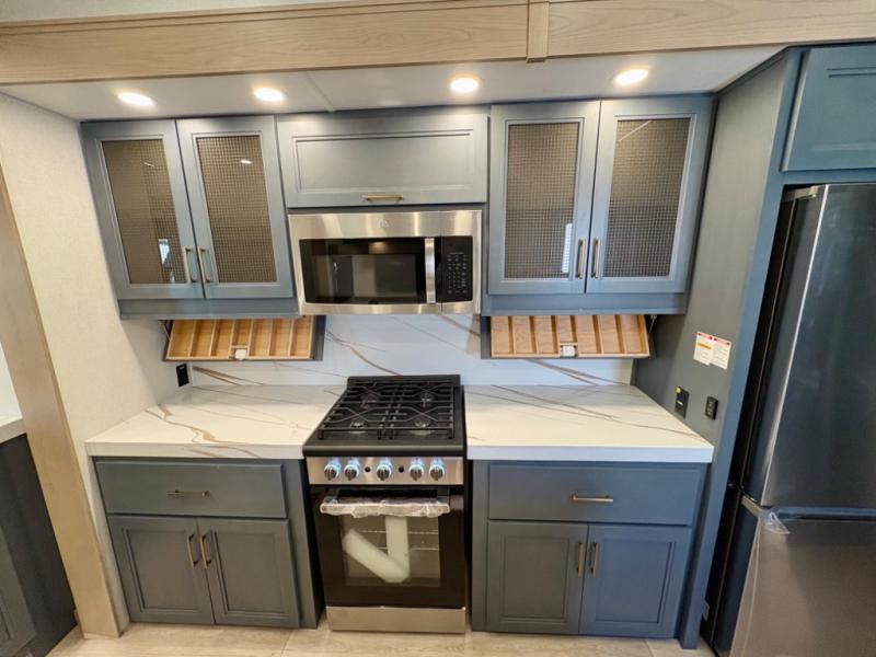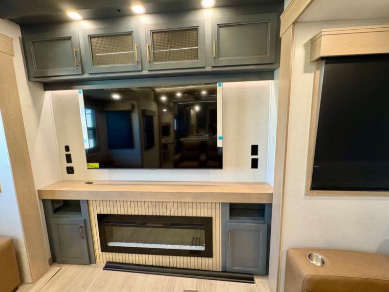 This Redwood fifth wheel is going to make you say wow! The rear living room is fully impressive with its 72" tri-fold sofa slides that are across from one another, its 60" theater sofa, entertainment center with 65" TV, and its ceiling fan. All in all, it will feel like you're lounging back at home. The kitchen is also completely decked out with opposing slides, a pull-out waste basket at the large island, two buffets, a pantry, and a message center, and just a few steps away from the kitchen is where you will find the luxurious master suite. This space has a full bathroom up at the front where you will find a huge walk-in closet, and within the bedroom, the king bed slide rests across from the 39" TV so that you can watch a movie in comfort.