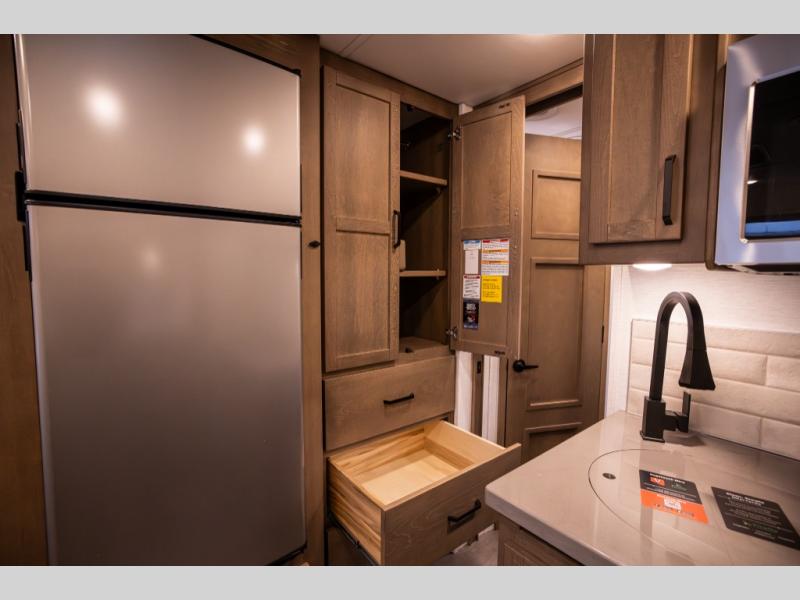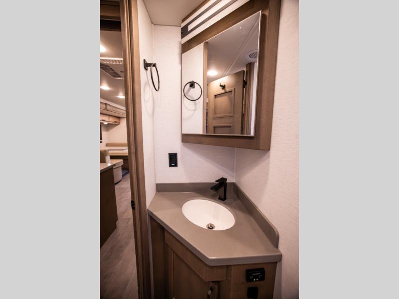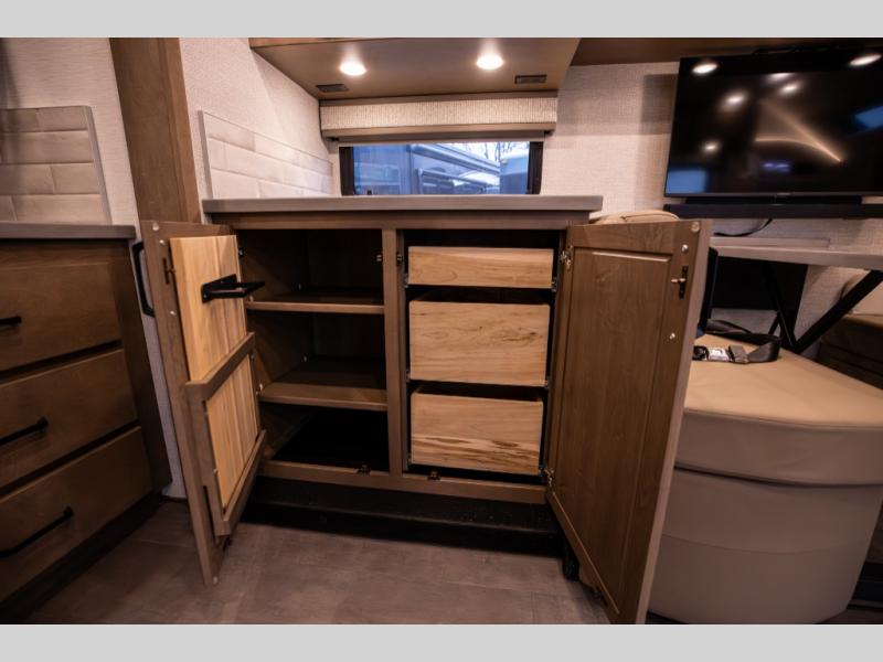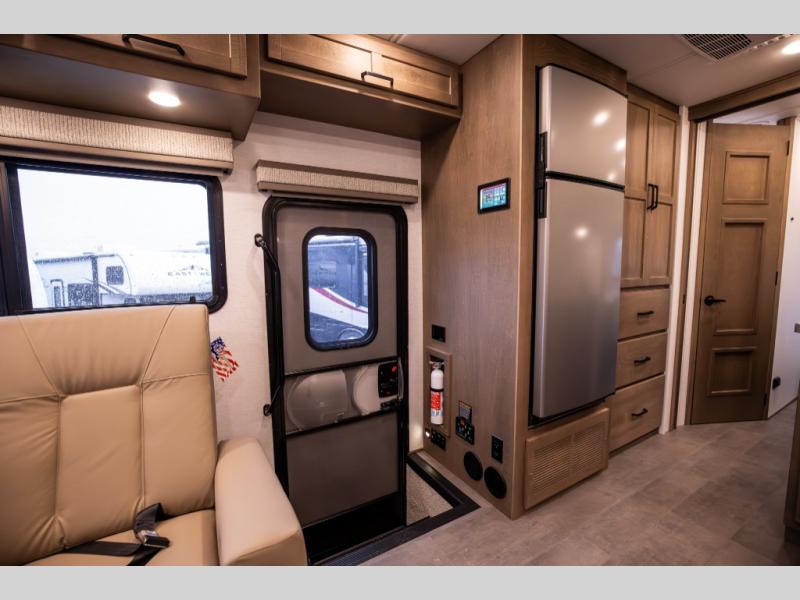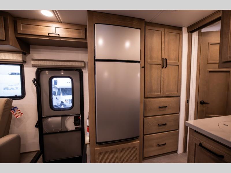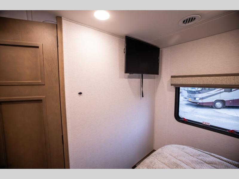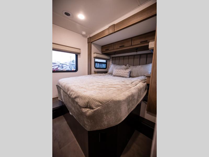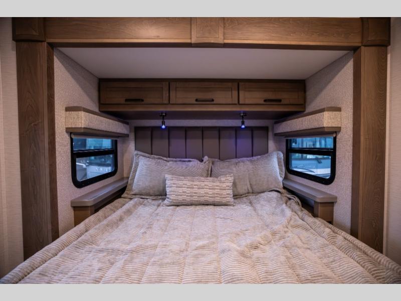 Experience ultimate luxury on wheels in this motor home bedroom. A 65 x 75 queen bed comfort with 32” LED TV entertainment and a full bathroom convenience with ample storage. The kitchen is fitted with spacious closet organization, 10 cu. stainless steel refrigerator, microwave, two-burner cooktop, overhead cabinets, and a pantry storage ideal for storing different stuff. In the living room, you will find a 42” LED TV, overhead cabinets, sofa sleeper flexibility, dinette dining, and a cab-over bed for extra sleep. This unit is also equipped with outdoor entertainment, perfect for socializing and outdoor fun, allowing you to experience extended trips with family during vacations, ideal for those who are adventure-seekers. Unforgettable adventures await! Experience the freedom of luxury motorhome living.