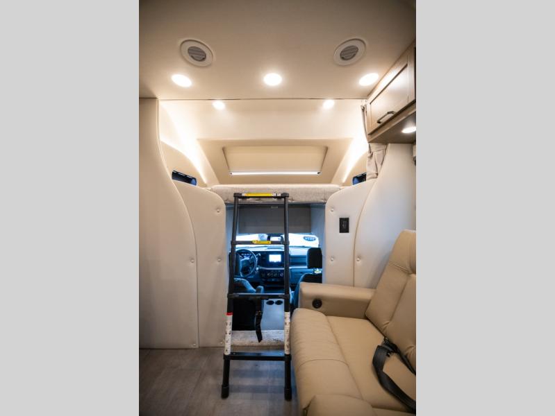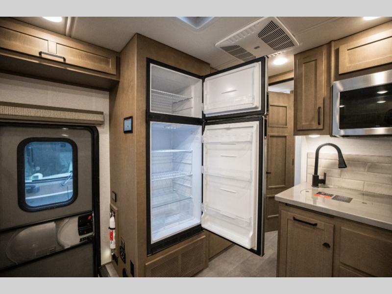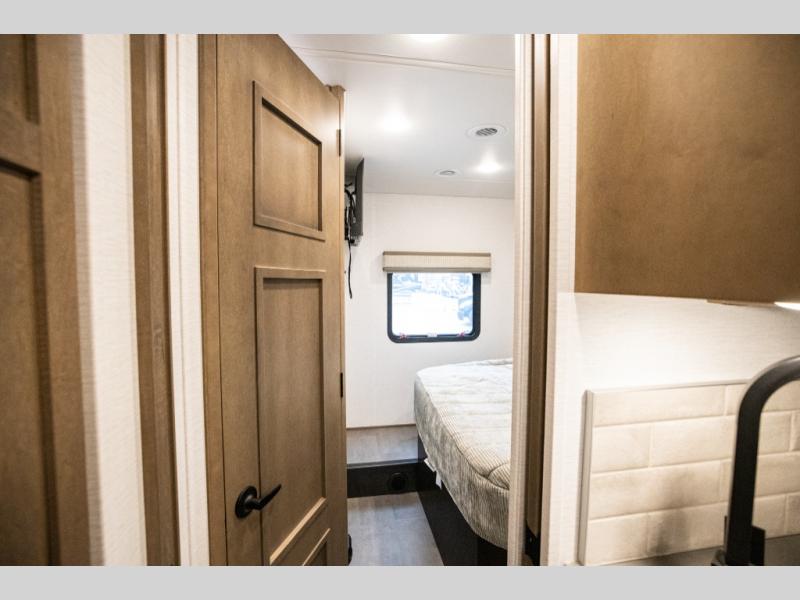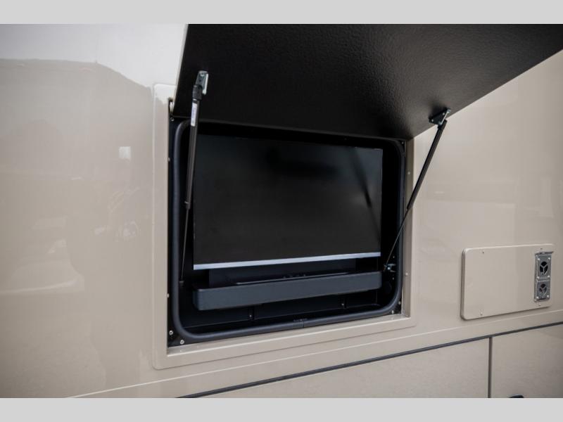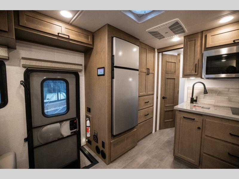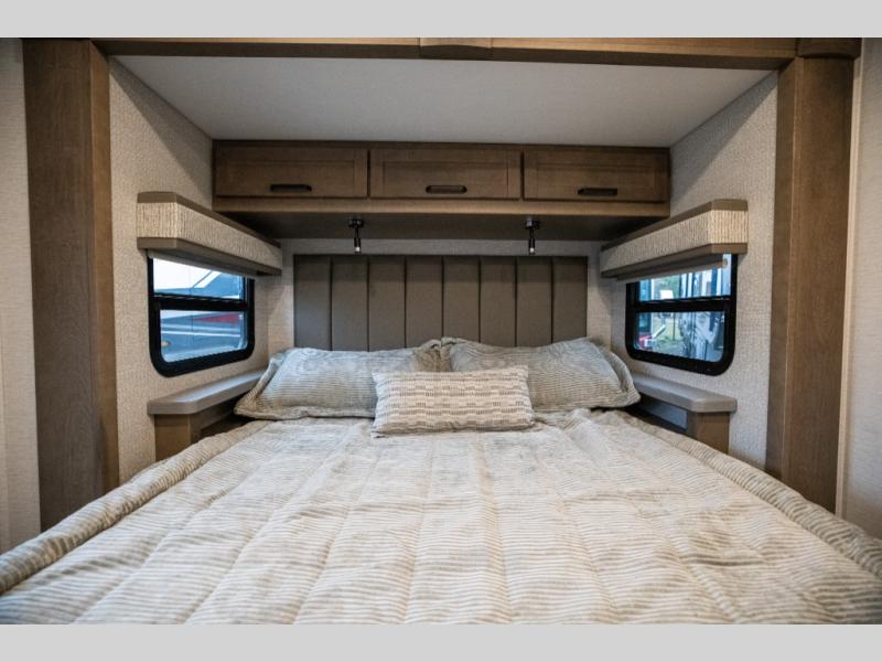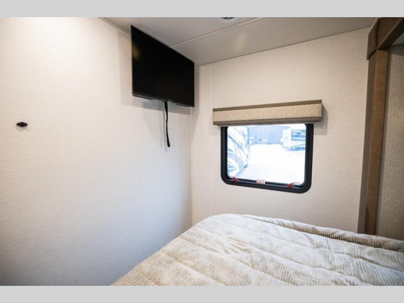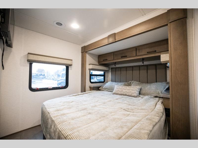 Experience ultimate luxury on wheels in this motor home bedroom. A 65 x 75 queen bed comfort with 32” LED TV entertainment and a full bathroom convenience with ample storage. The kitchen is fitted with spacious closet organization, 10 cu. stainless steel refrigerator, microwave, two-burner cooktop, overhead cabinets, and a pantry storage ideal for storing different stuff. In the living room, you will find a 42” LED TV, overhead cabinets, sofa sleeper flexibility, dinette dining, and a cab-over bed for extra sleep. This unit is also equipped with outdoor entertainment, perfect for socializing and outdoor fun, allowing you to experience extended trips with family during vacations, ideal for those who are adventure-seekers. Unforgettable adventures await! Experience the freedom of luxury motorhome living.