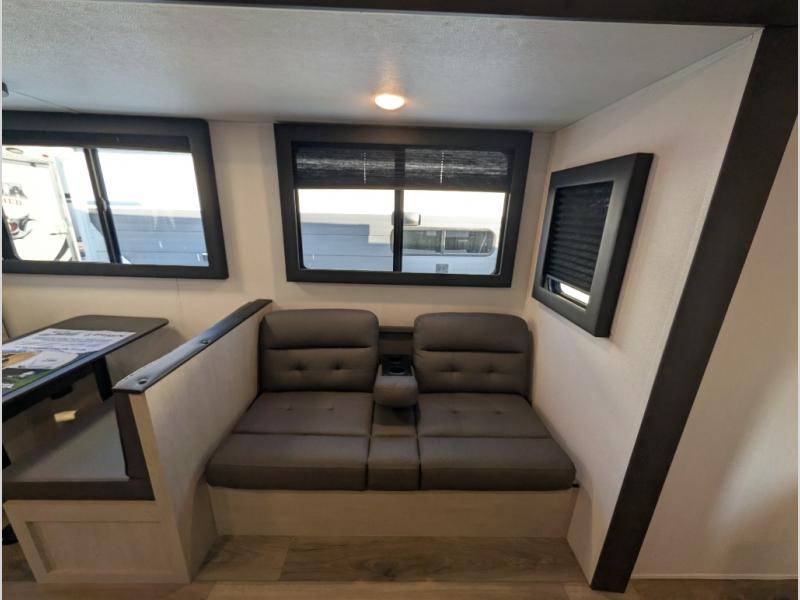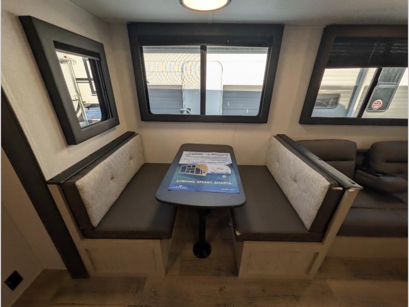 Enjoy camping with family and friends in this Shasta i-5 Edition bunk model! There are double-size bunks in the rear roadside corner and a full bath with shower, vanity, and toilet in the opposite rear corner. The kitchen is fully equipped for your camping trips featuring a three-burner cooktop, a microwave, a large sink, and an 8-cu. ft. refrigerator. You will also love the pantry for all of your canned goods and snacks. To make for a spacious trailer find a large slide that features a U-shaped dinette and jack knife sofa to relax and serves as two great sleeping spaces. In the front of this unit, a private bedroom with a curtain provides a quiet retreat from the rest of the unit.