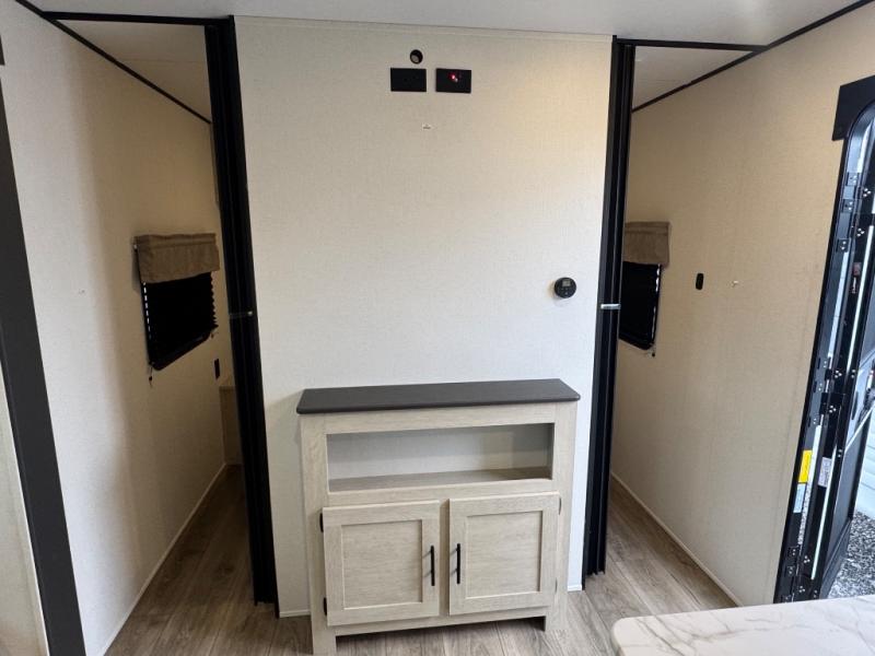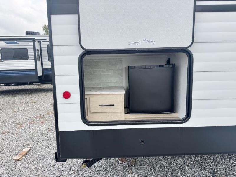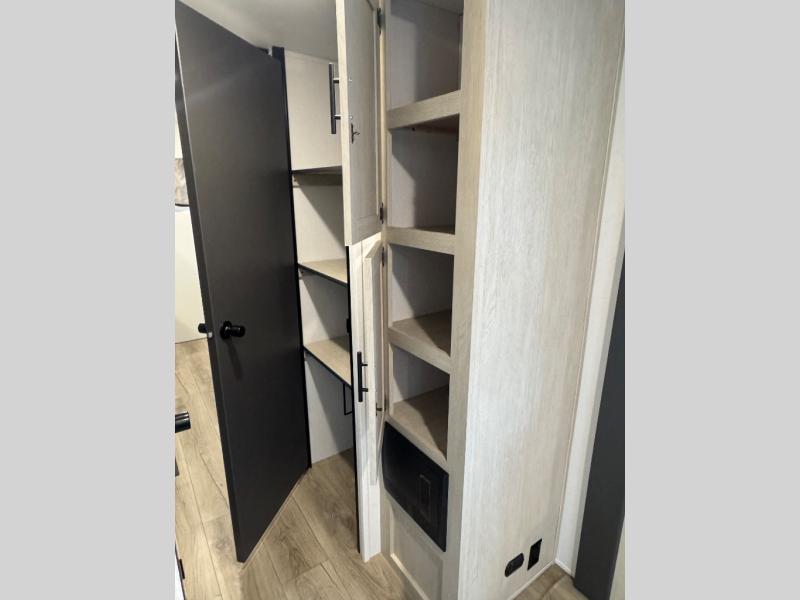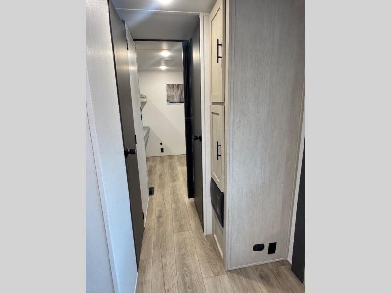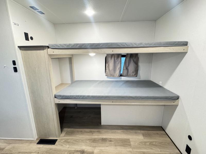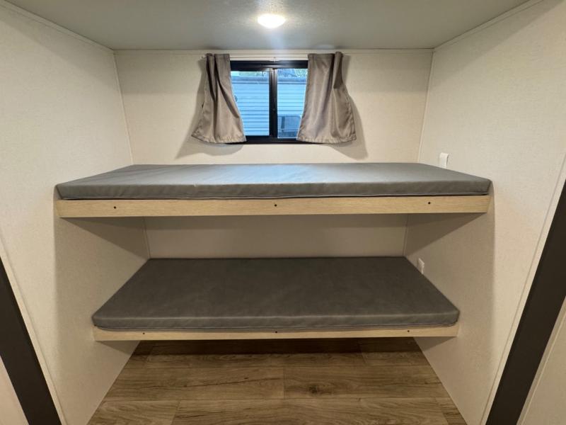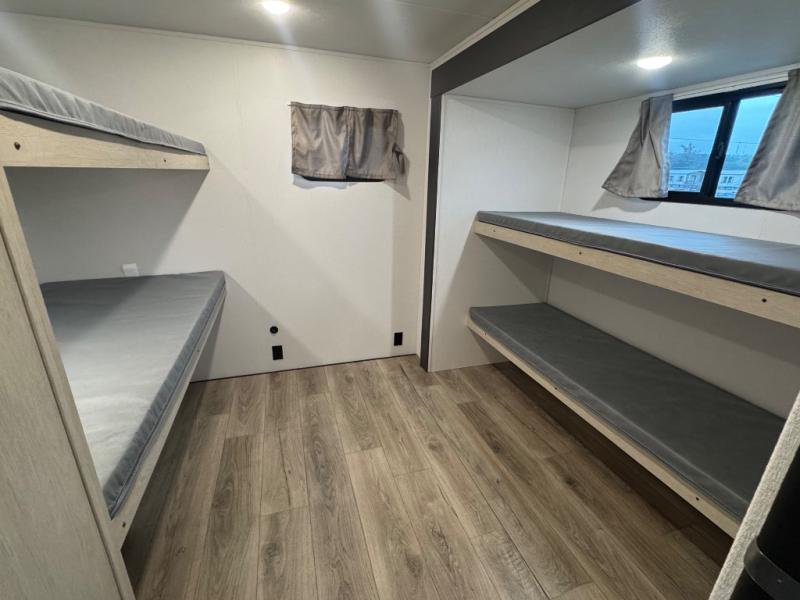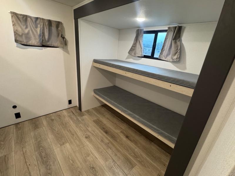 There are a set of 38" x 74" bunks and a set of 26" x 74" bunks in this trailer for lots of sleeping space! This bunkroom also includes a slide out for more space, and you can choose the optional double suite with a 54" x 74" bed if you don't need the bunks. The kitchen is fully equipped for your camping trips featuring a three burner cooktop, an overhead microwave oven, a large sink, and plenty of storage space. You will also love the pantry for all of your canned goods and snacks. The bath features a 24" x 40" shower, toilet, and vanity/sink. In the front of this unit, a private bedroom provides a quiet retreat from the rest of the unit with dual entry doors, and you'll appreciate having dual bedroom wardrobes to keep your clothes organized. Outside, enjoy pass-through storage for all of your outdoor camping gear plus more.