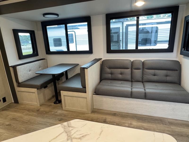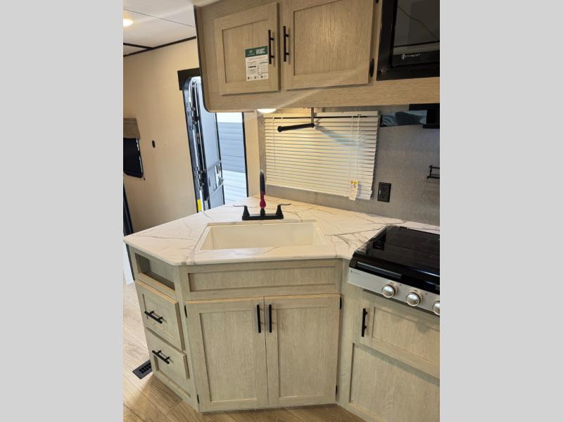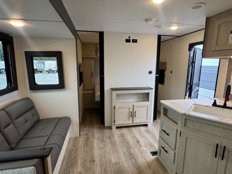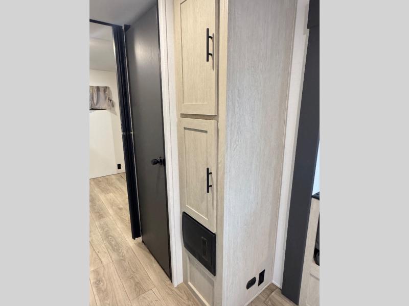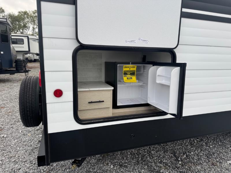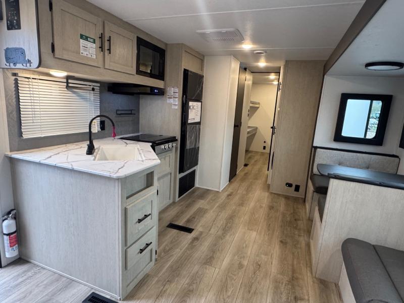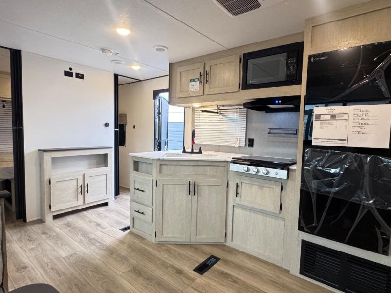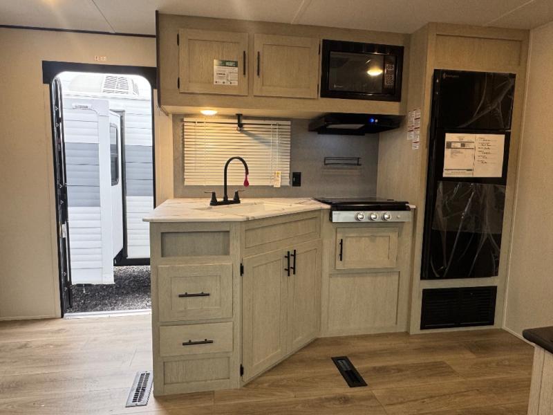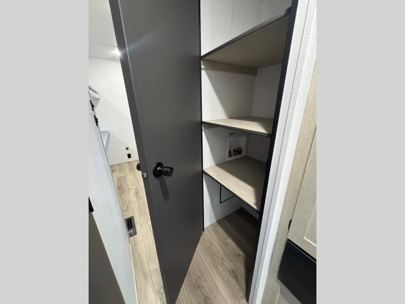 There are a set of 38" x 74" bunks and a set of 26" x 74" bunks in this trailer for lots of sleeping space! This bunkroom also includes a slide out for more space, and you can choose the optional double suite with a 54" x 74" bed if you don't need the bunks. The kitchen is fully equipped for your camping trips featuring a three burner cooktop, an overhead microwave oven, a large sink, and plenty of storage space. You will also love the pantry for all of your canned goods and snacks. The bath features a 24" x 40" shower, toilet, and vanity/sink. In the front of this unit, a private bedroom provides a quiet retreat from the rest of the unit with dual entry doors, and you'll appreciate having dual bedroom wardrobes to keep your clothes organized. Outside, enjoy pass-through storage for all of your outdoor camping gear plus more.