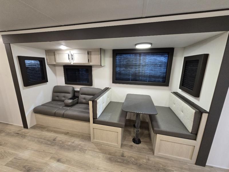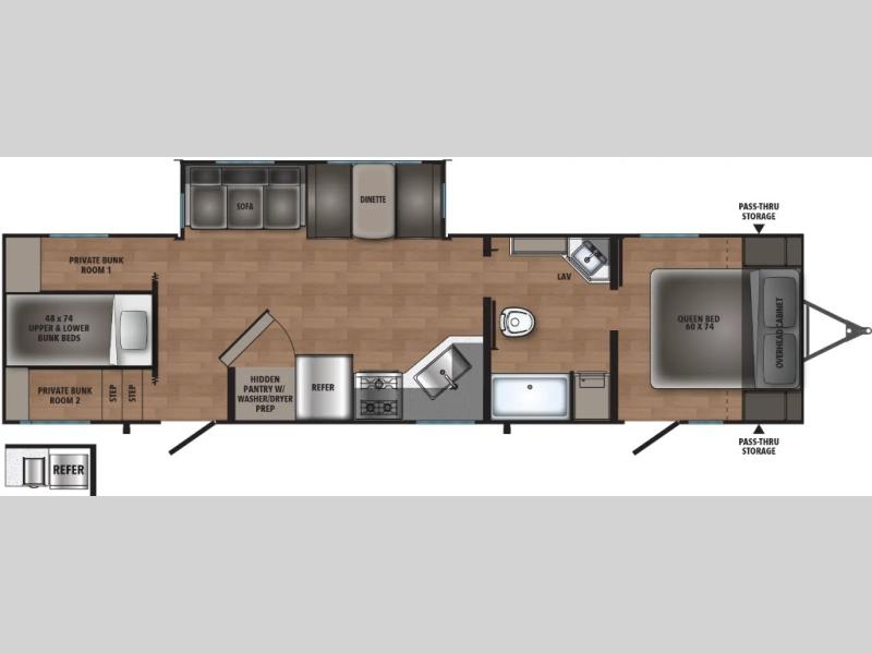 | Available Beds | Front private queen bed, three bunks, jackknife sofa, and a booth dinette that converts into a bed |