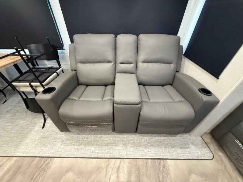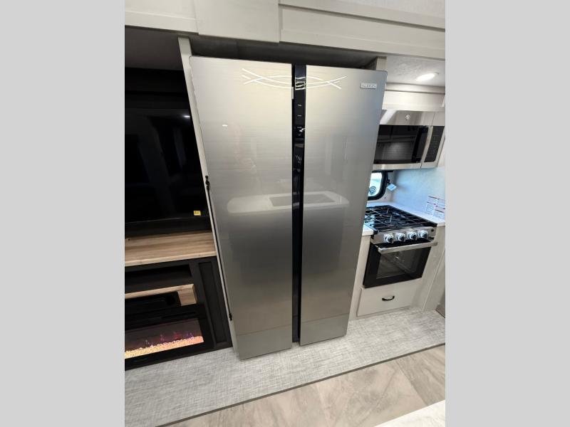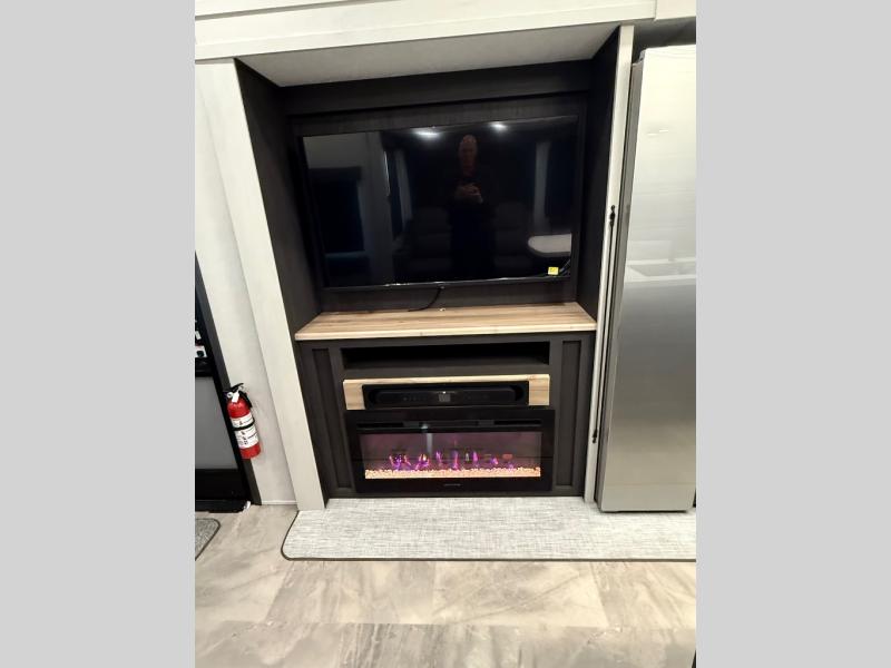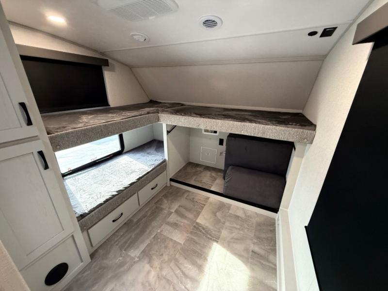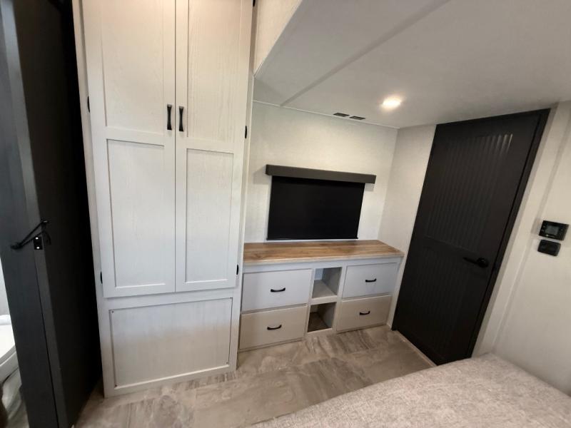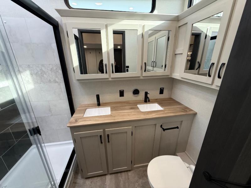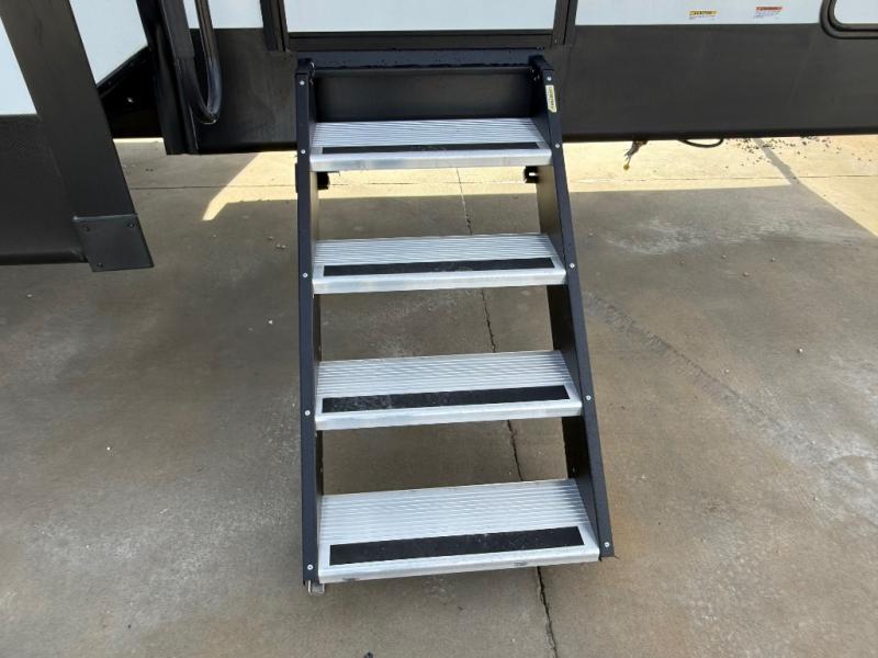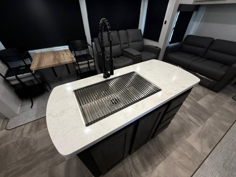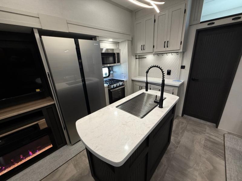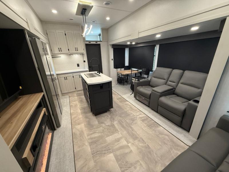 This fifth wheel is decked out in features you will love! Starting with the front private bunkhouse which has a 30" x 74" bunk bed, a 30" x 62" bunk above a cube sofa, washer and dryer prep, and even its very own full bathroom. The living area has theater seating across from an entertainment center and a tri-fold hide-a-bed sofa for extra sleeping space, plus it is right next to the fully equipped kitchen with an island so you can socialize with the chef while they prepare a delicious home cooked meal. Get a good night's rest in the master suite with the king bed slide, a dresser, wardrobe, and full rear bathroom which has a shower with a seat and a dual sink vanity for two to get ready at once. Plus, above the master suite is a loft for extra sleeping or storage space!