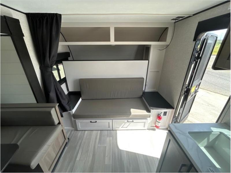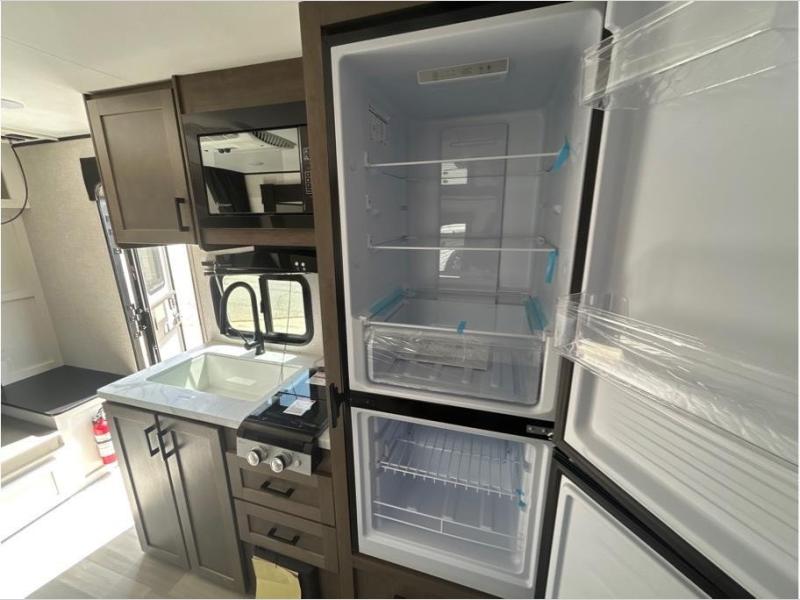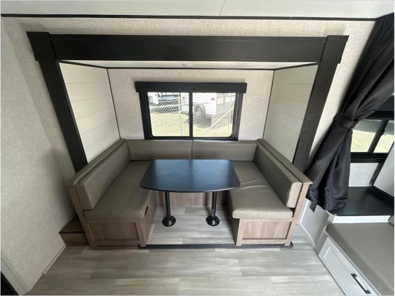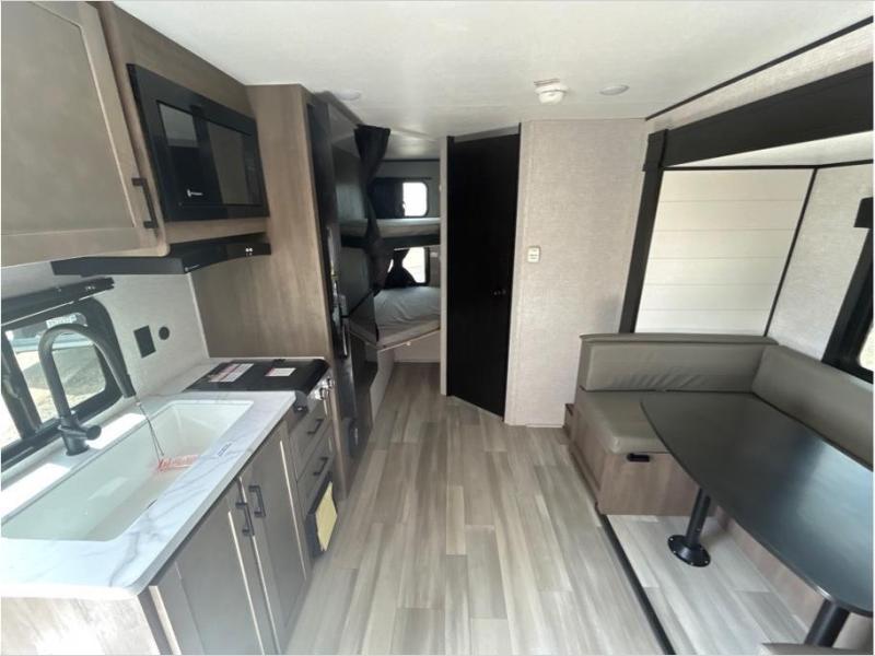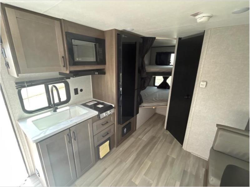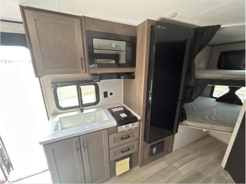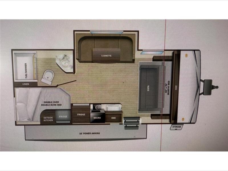 Load up the whole family and head to your favorite campground in this travel trailer! It offers versatility with the front 60" x 76" Murphy bed which transforms into a sofa for seating during the day. There is also a set of double-size bunk beds for the kids to sleep on and the U-shaped dinette can transform into an extra sleeping space when you're not using it to enjoy a meal prepared with the two burner range with a glass cover. You could even prepare your meals out in the great outdoors with the outside kitchen. Wash the sand out of your hair each night in the rear corner bathroom with the tub/shower too!