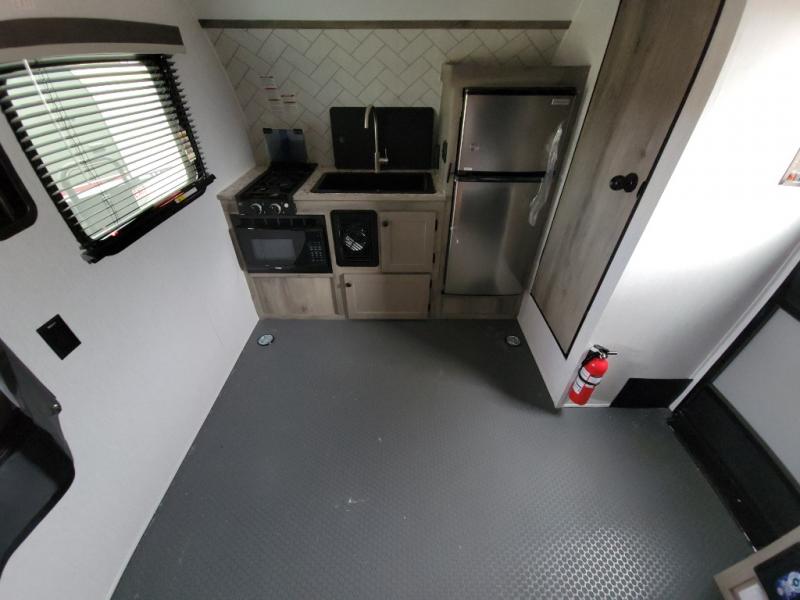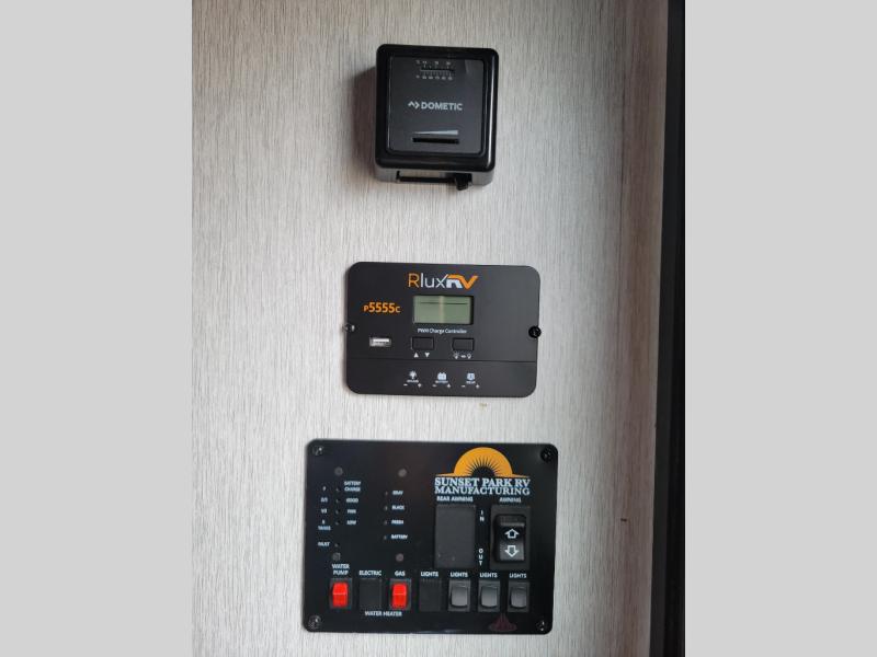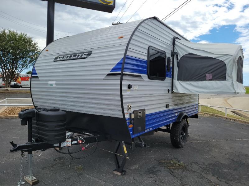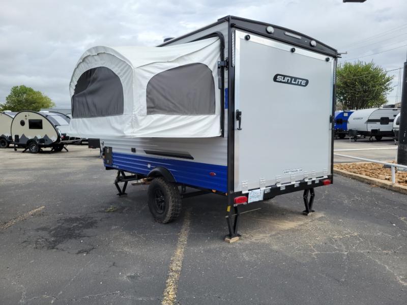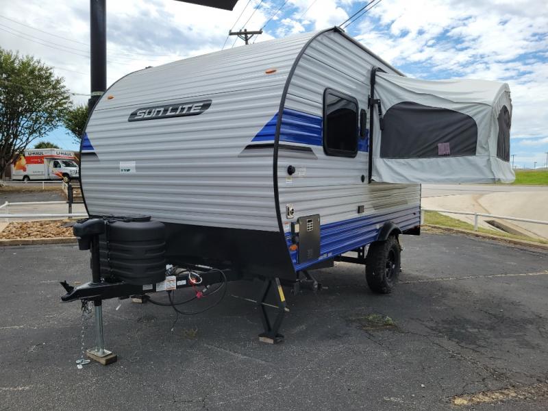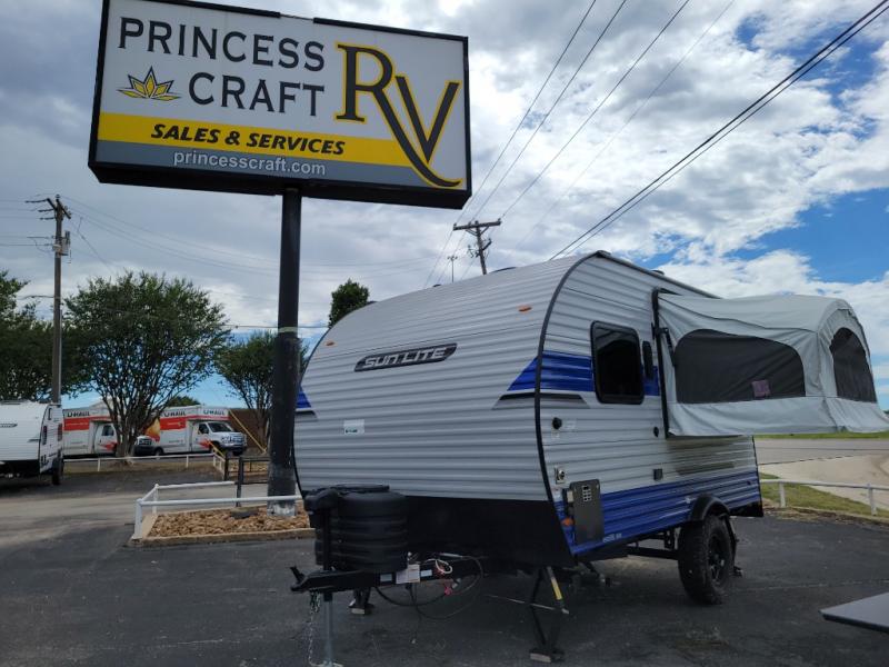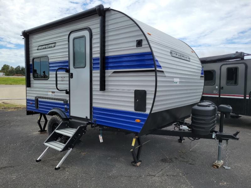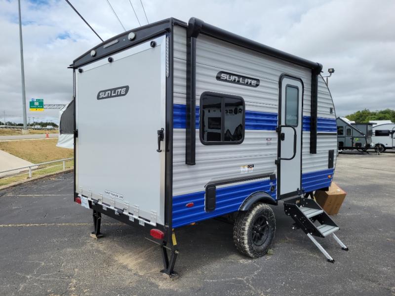 You can trust the build and enjoy your experience with any one of these Sunset Park RV Sun Lite travel trailers or toy haulers! Their aerodynamic profile is not only easy to haul, but also saves on fuel. They are built to withstand years of traveling even though they are lightweight with a diamond plate rock guard, a one piece PVC roof membrane, Dexter Spring-Leaf axles, and tinted safety glass windows. Some comfort standards you are sure to enjoy are the two-burner stove top range with hood, light and fan, plus the refrigerator and microwave, and an outside shower to help keep the dirt outdoors where it belongs.