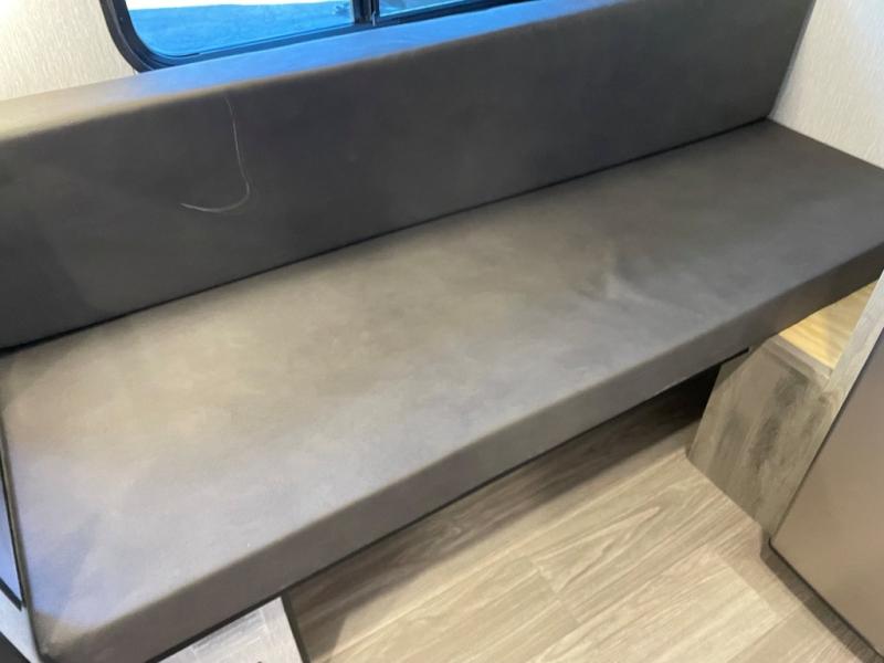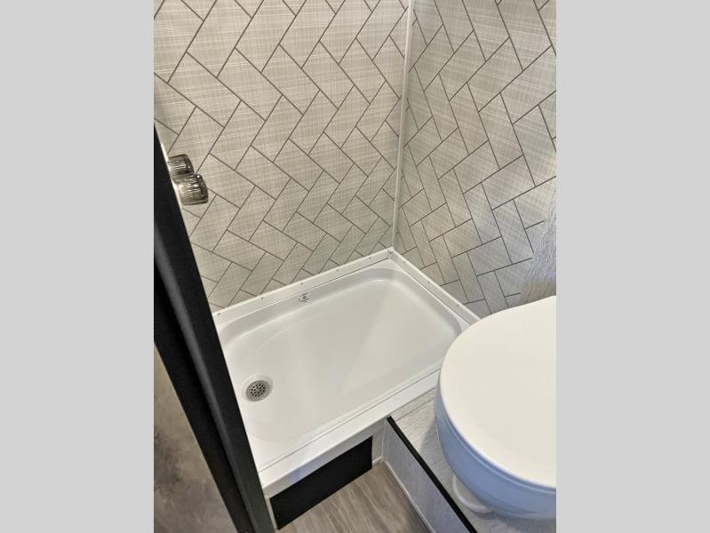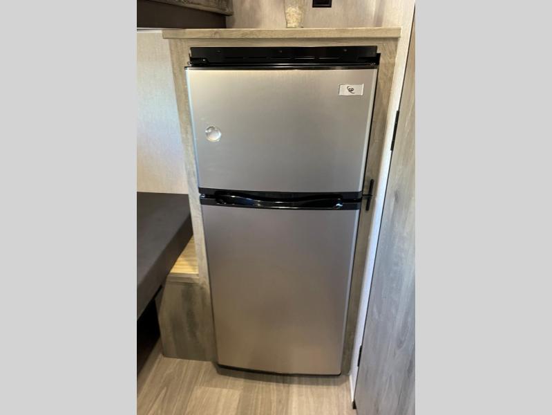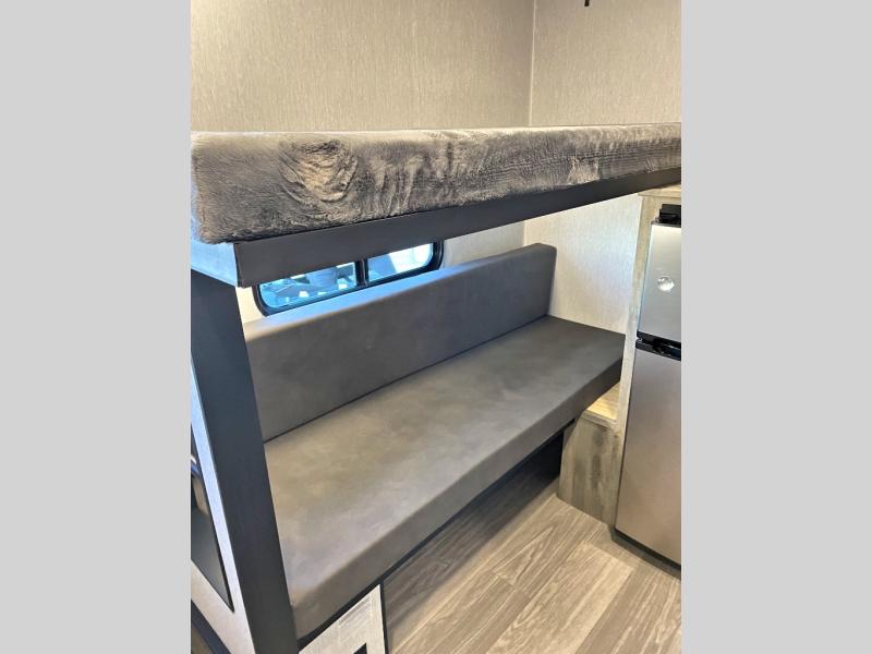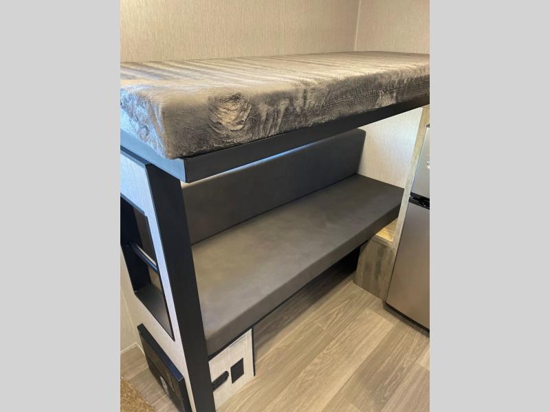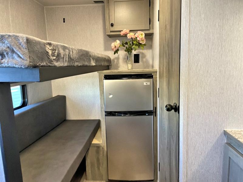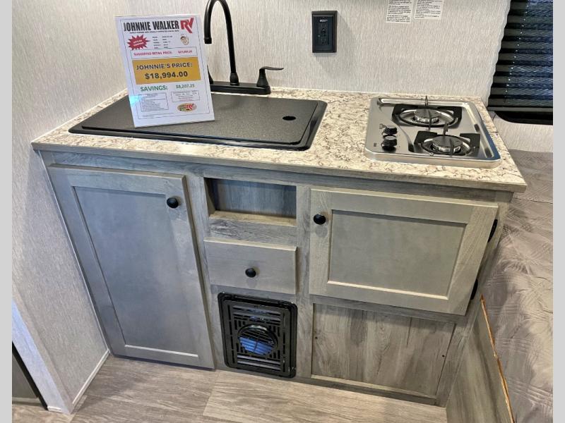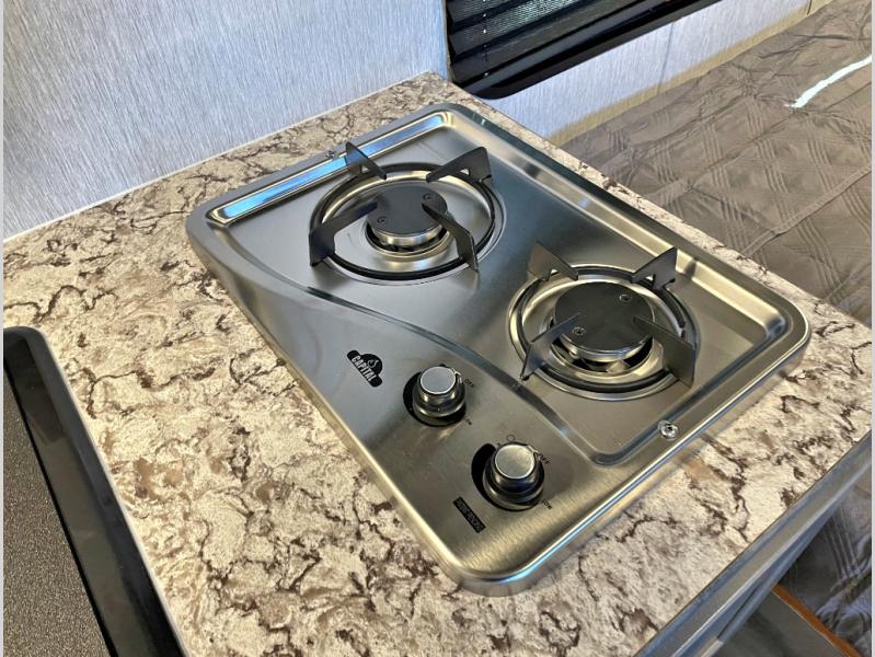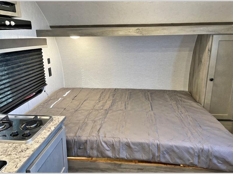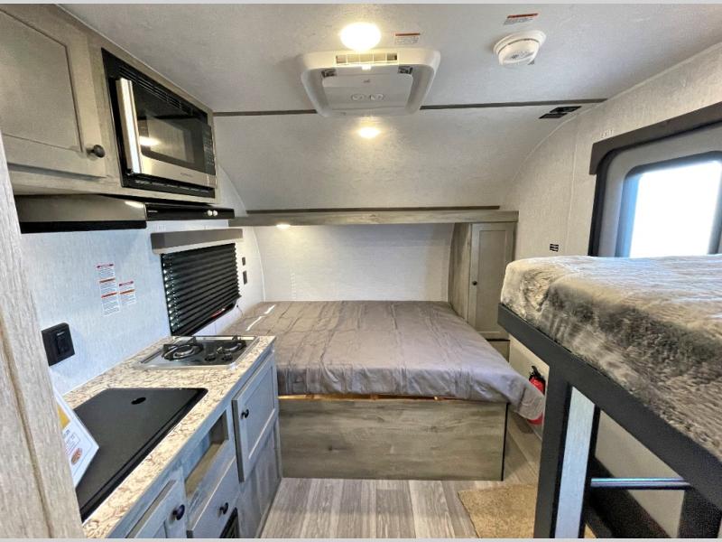 This lightweight travel trailer is perfect for a family of four! You will sleep soundly on the front 54" x 74" bed with an overhead shelf and a closet for your things, and there is a set of bunks along the curbside to the left of the entry door for two more. The top bunk is 24" x 68" with a bottom bunk that is 30" x 68. You can easily cook meals using the two burner cooktop and the double sink is great for cleaning up. The private bath with a 24" x 32" shower and a toilet will let you freshen up each day, and the double sink in the kitchen provides a place to wash your hands and brush your teeth at night. You will also appreciate having a 4.3 cu. ft. 12V refrigerator to keep your food fresh and a 5K BTU wall A/C to keep you comfortable all summer long!