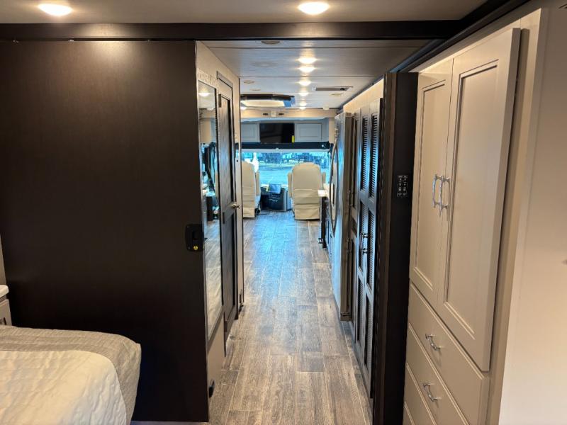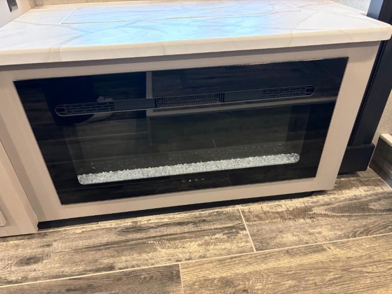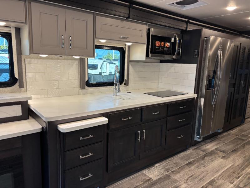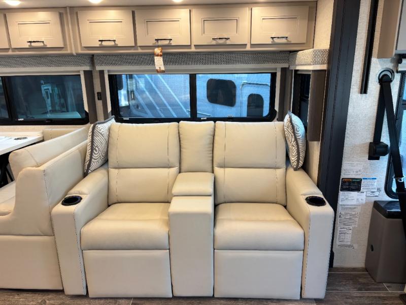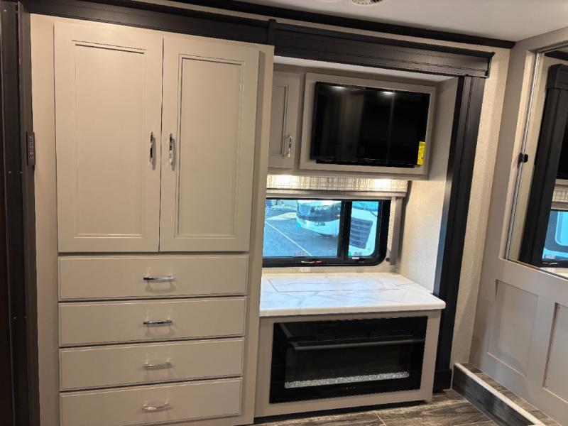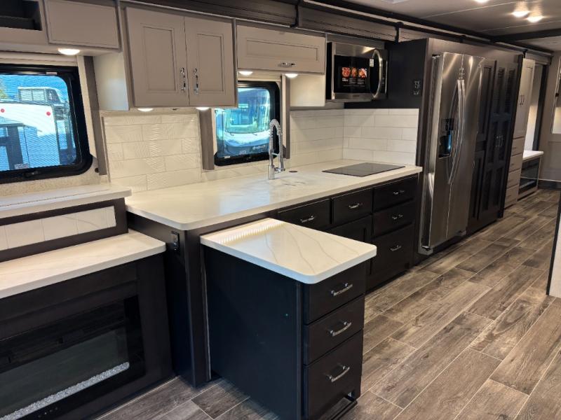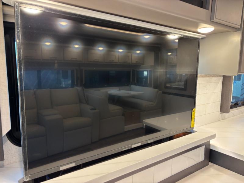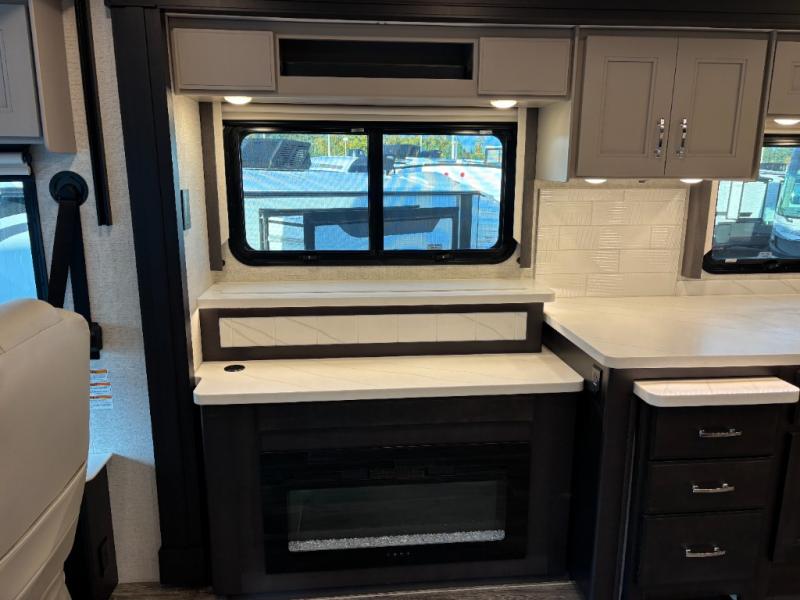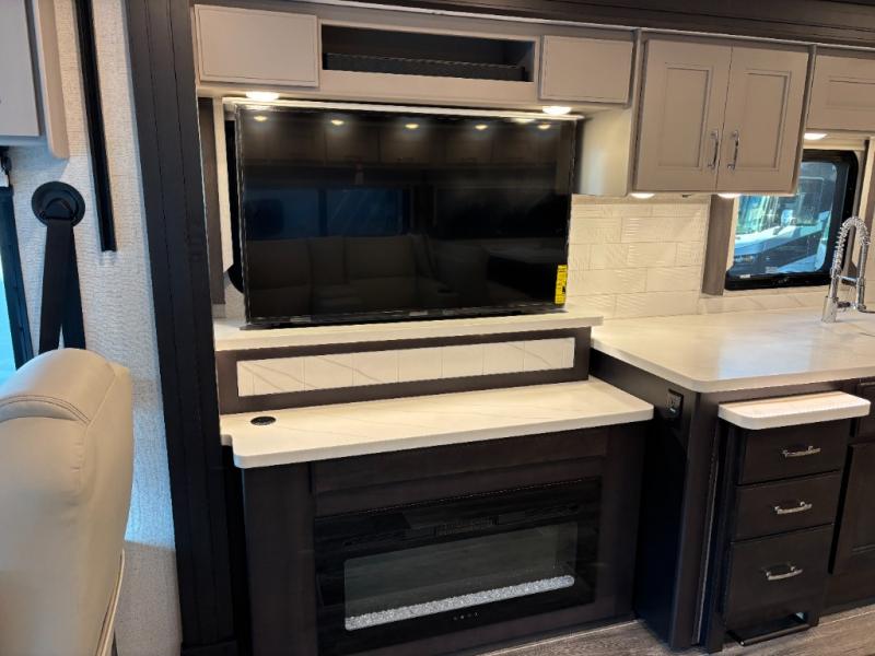 You will love these motorhome characteristics! The rear bedroom is a tranquil sanctuary, boasting an inclining king bed and ample closet space for your finest attire. A lavish TV and a fireplace create a warm ambiance, while a convenient closet with drawers provides meticulous storage. The opulent full bathroom is fully equipped, with everything you need to freshen up. The great kitchen area features a spacious pantry, sleek fridge, microwave, and clever pull-out cabinet for effortless meal preparation. In addition, the expansive 74” dream dinette offers generous space for convivial meals and social gatherings, while the plush 68” reclining theater seating provides ultimate relaxation. In the living room area, a practical pull-out desk provides a dedicated workspace, and a roaring fireplace adds warmth and sophistication. A sleek retractable TV and convenient drop-down overhead bunk offer convenient and flexible entertainment options, plus an overhead TV adds to the lavish features of this motorhome.