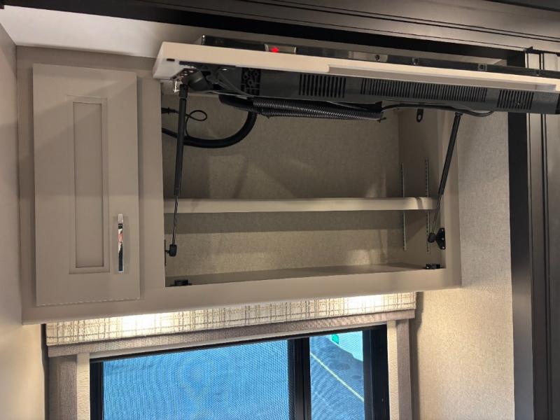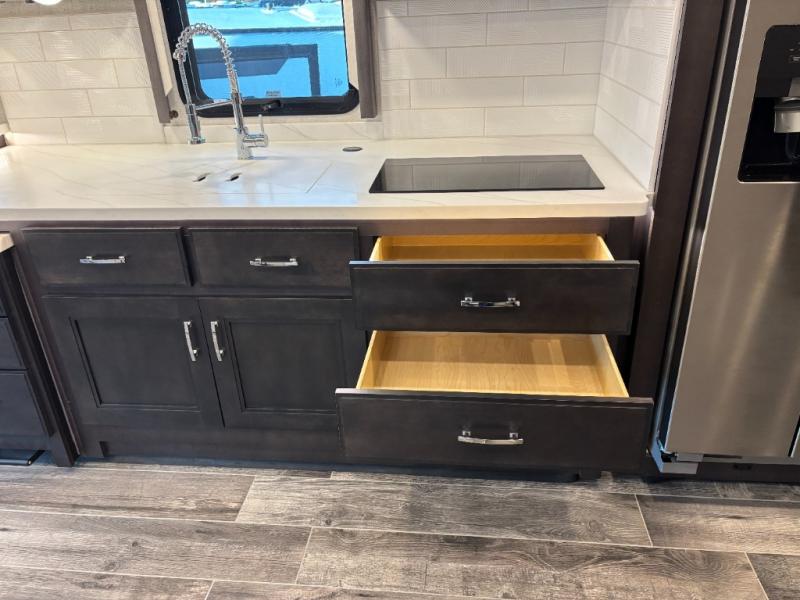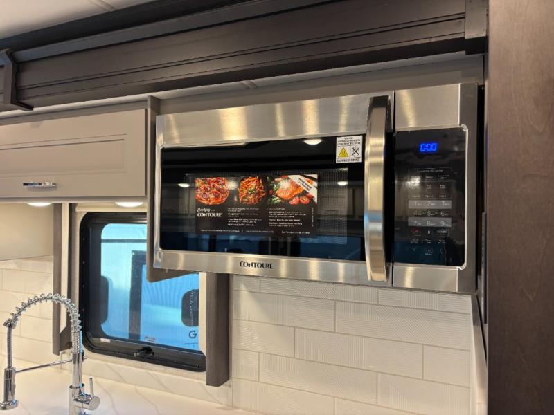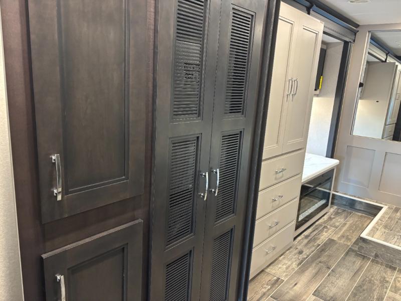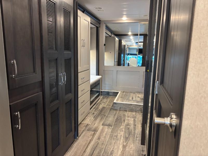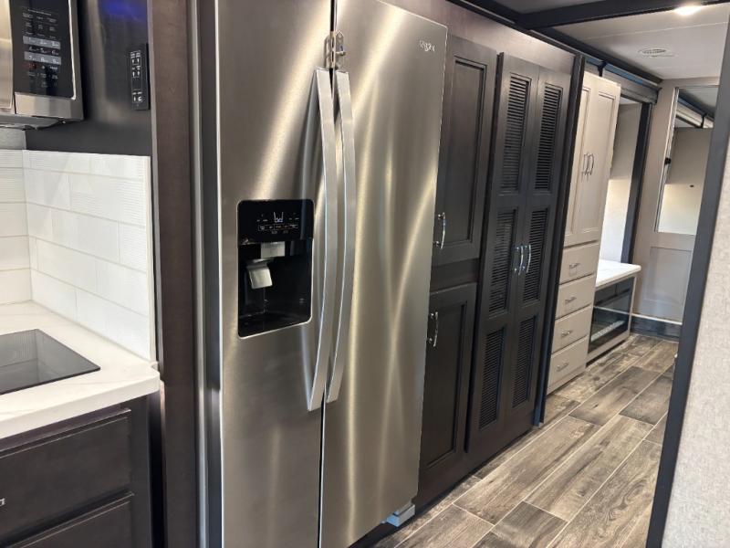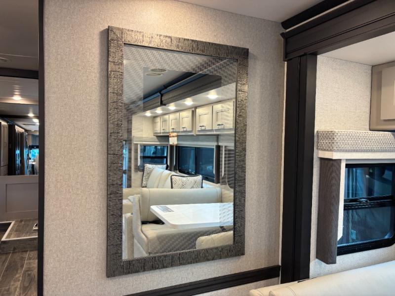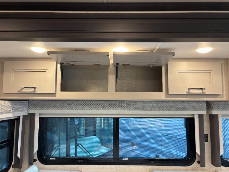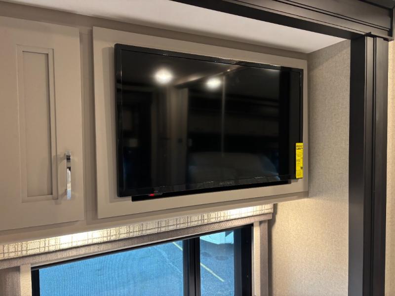 You will love these motorhome characteristics! The rear bedroom is a tranquil sanctuary, boasting an inclining king bed and ample closet space for your finest attire. A lavish TV and a fireplace create a warm ambiance, while a convenient closet with drawers provides meticulous storage. The opulent full bathroom is fully equipped, with everything you need to freshen up. The great kitchen area features a spacious pantry, sleek fridge, microwave, and clever pull-out cabinet for effortless meal preparation. In addition, the expansive 74” dream dinette offers generous space for convivial meals and social gatherings, while the plush 68” reclining theater seating provides ultimate relaxation. In the living room area, a practical pull-out desk provides a dedicated workspace, and a roaring fireplace adds warmth and sophistication. A sleek retractable TV and convenient drop-down overhead bunk offer convenient and flexible entertainment options, plus an overhead TV adds to the lavish features of this motorhome.