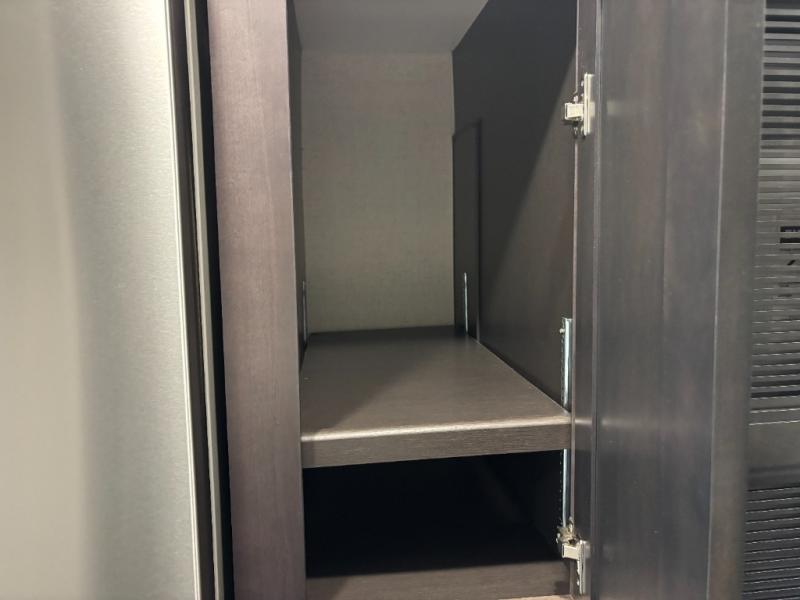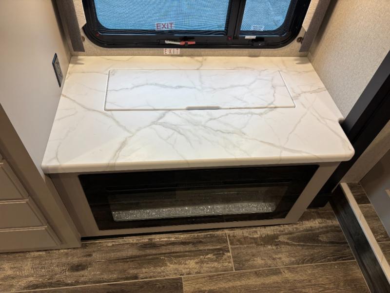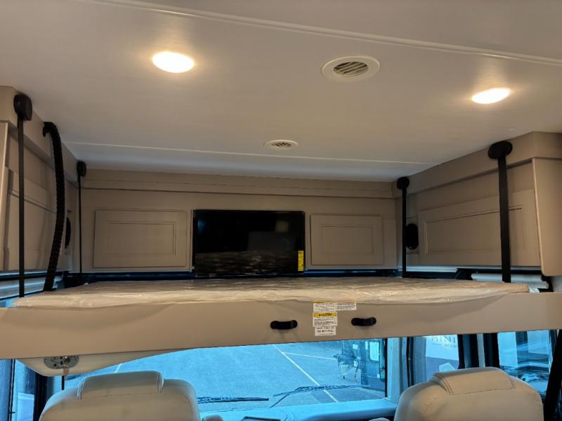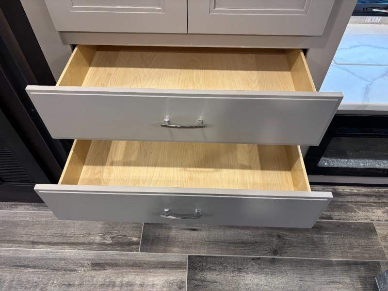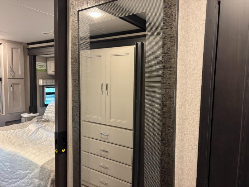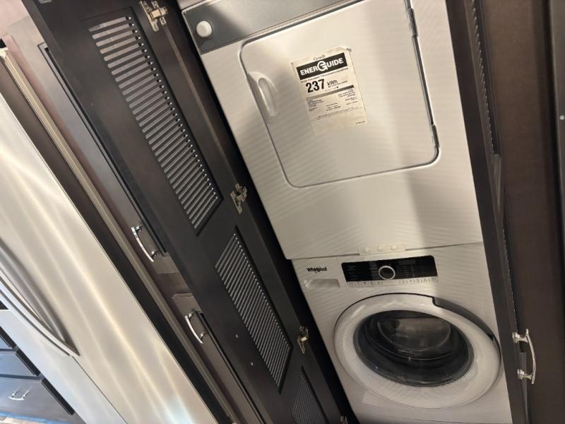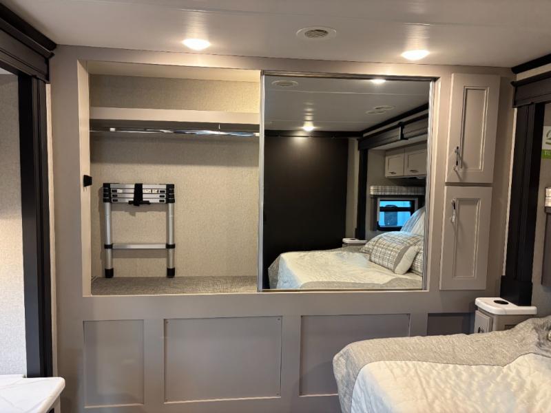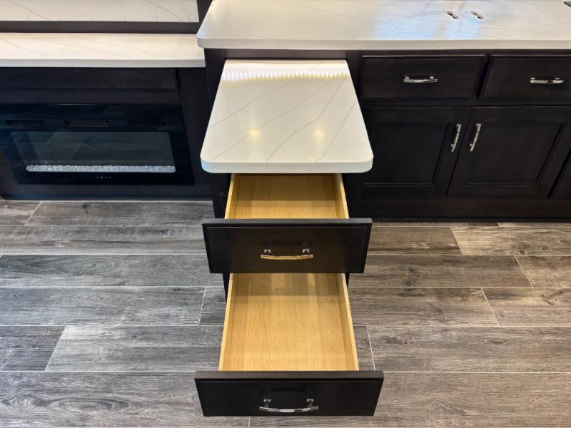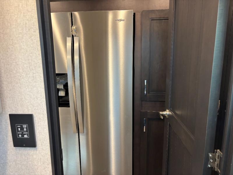 You will love these motorhome characteristics! The rear bedroom is a tranquil sanctuary, boasting an inclining king bed and ample closet space for your finest attire. A lavish TV and a fireplace create a warm ambiance, while a convenient closet with drawers provides meticulous storage. The opulent full bathroom is fully equipped, with everything you need to freshen up. The great kitchen area features a spacious pantry, sleek fridge, microwave, and clever pull-out cabinet for effortless meal preparation. In addition, the expansive 74” dream dinette offers generous space for convivial meals and social gatherings, while the plush 68” reclining theater seating provides ultimate relaxation. In the living room area, a practical pull-out desk provides a dedicated workspace, and a roaring fireplace adds warmth and sophistication. A sleek retractable TV and convenient drop-down overhead bunk offer convenient and flexible entertainment options, plus an overhead TV adds to the lavish features of this motorhome.
