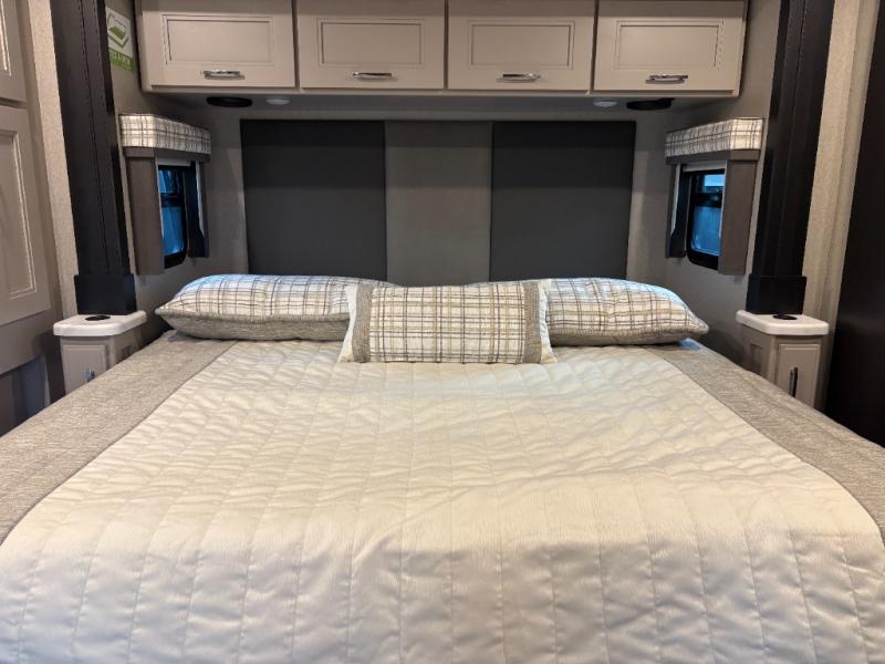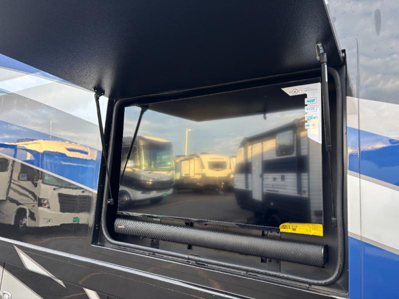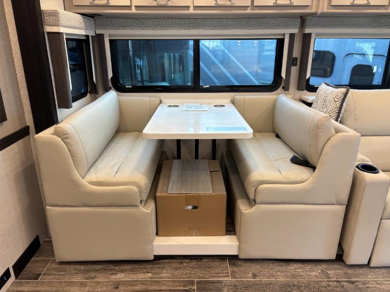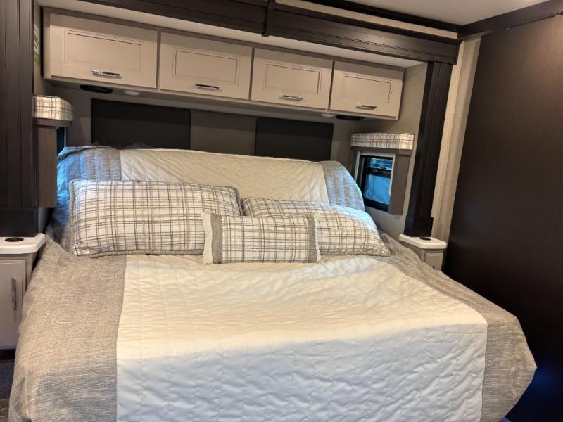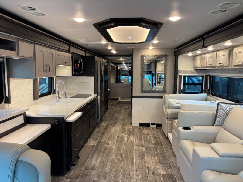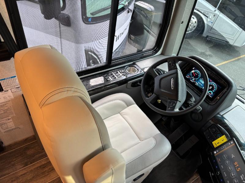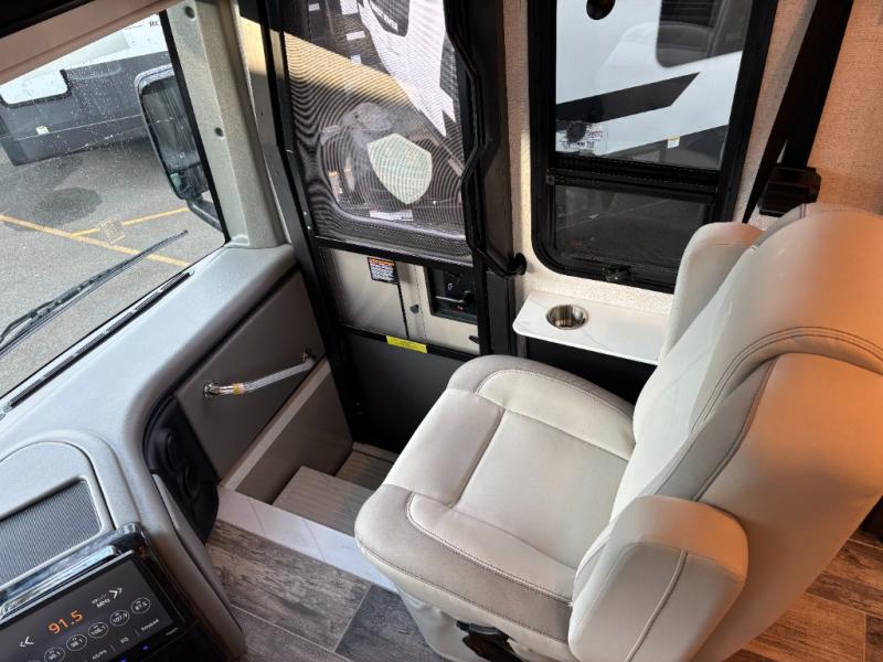 With any Aria Class A diesel motorhome by Thor Motor Coach, experience RV living with all the luxurious amenities you are accustom to, command the roadways with improved handling from the VFS front axle with a 55-degree wheel cut, and enjoy a smooth ride thanks to the Air-Ride suspension and Sachs shock absorbers. The driver will also appreciate the 10.1" touchscreen dash radio with Bluetooth, and Sirius/XM prep when navigating the roads, and the comfort of the leatherette reclining/swivel adjustable captain's chairs. The bathroom provides an oversized full height shower with a glass door and a designer backsplash, while the kitchen provides solid surface countertops and a dinette. You'll also enjoy designer tile backsplash, a large double bowl stainless steel sink with a single handle faucet, a pull-down sprayer, plus full kitchen amenities. More standout features include the Wyndham cabinetry with rake style cabinet doors & nickel finish hardware, plus much much more depending on the Aria you take on the road!
