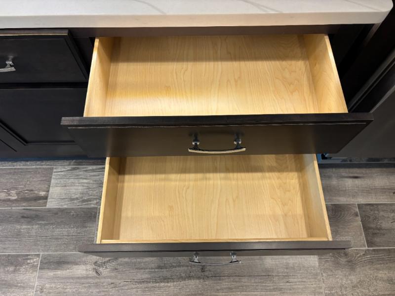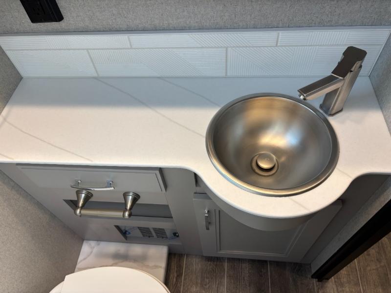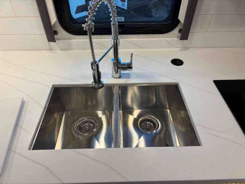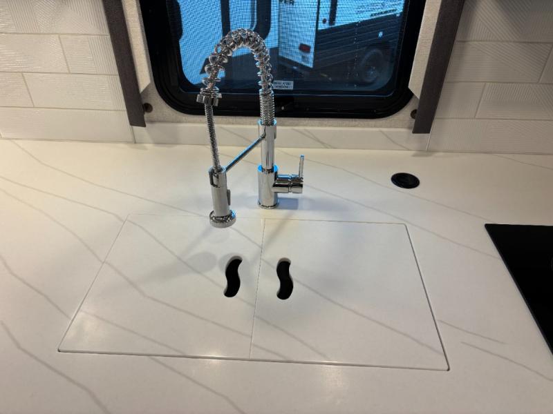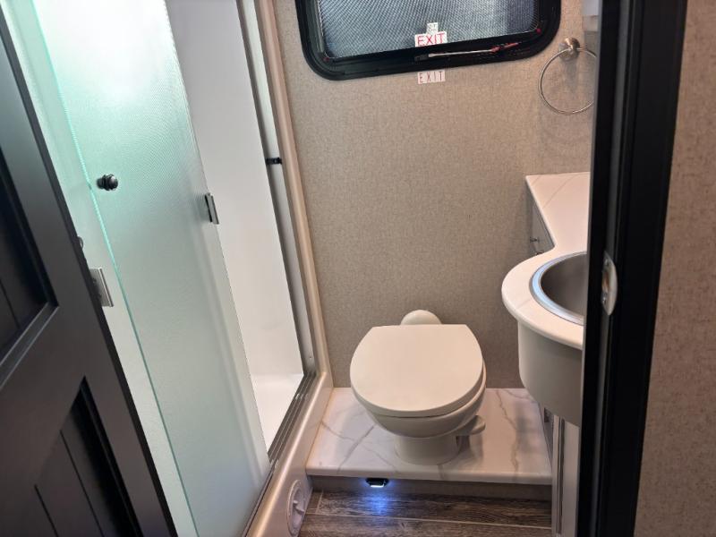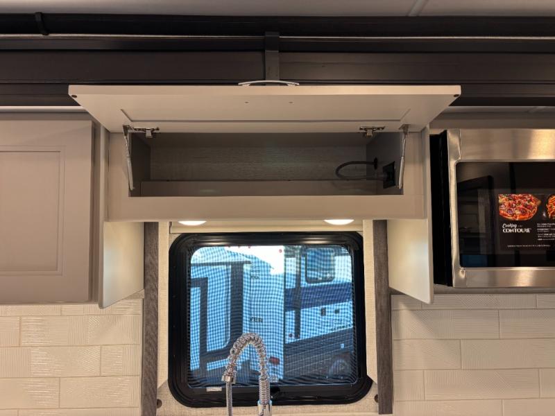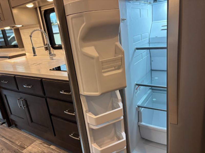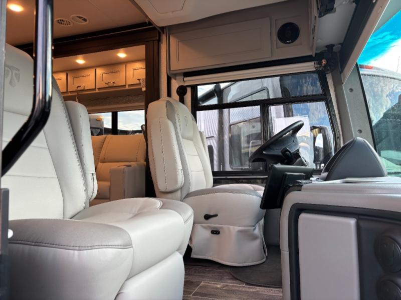 With any Aria Class A diesel motorhome by Thor Motor Coach, experience RV living with all the luxurious amenities you are accustom to, command the roadways with improved handling from the VFS front axle with a 55-degree wheel cut, and enjoy a smooth ride thanks to the Air-Ride suspension and Sachs shock absorbers. The driver will also appreciate the 10.1" touchscreen dash radio with Bluetooth, and Sirius/XM prep when navigating the roads, and the comfort of the leatherette reclining/swivel adjustable captain's chairs. The bathroom provides an oversized full height shower with a glass door and a designer backsplash, while the kitchen provides solid surface countertops and a dinette. You'll also enjoy designer tile backsplash, a large double bowl stainless steel sink with a single handle faucet, a pull-down sprayer, plus full kitchen amenities. More standout features include the Wyndham cabinetry with rake style cabinet doors & nickel finish hardware, plus much much more depending on the Aria you take on the road!